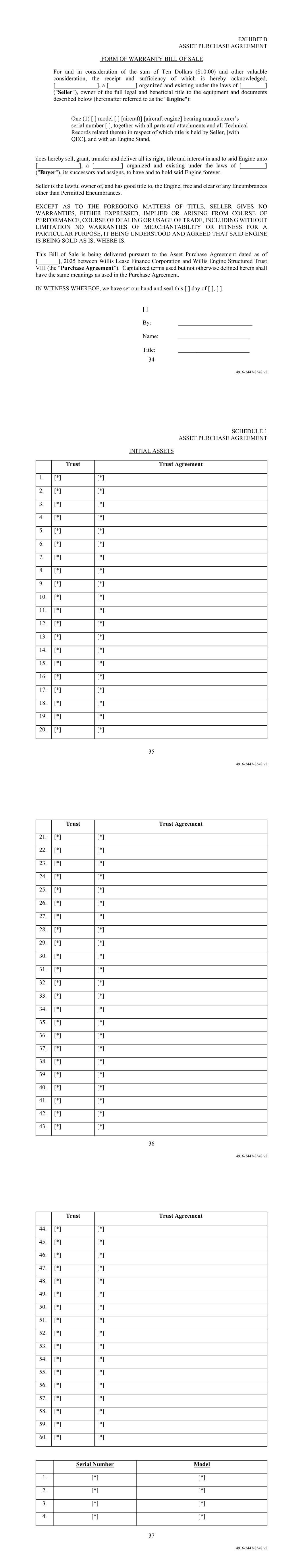 34 4916-2447-8548.v2 EXHIBIT B ASSET PURCHASE AGREEMENT FORM OF WARRANTY BILL OF SALE For and in consideration of the sum of Ten Dollars ($10.00) and other valuable consideration, the receipt and sufficiency of which is hereby acknowledged, [______________], a [_________] organized and existing under the laws of [________] ("Seller"), owner of the full legal and beneficial title to the equipment and documents described below (hereinafter referred to as the "Engine"): One (1) [ ] model [ ] [aircraft] [aircraft engine] bearing manufacturer’s serial number [ ], together with all parts and attachments and all Technical Records related thereto in respect of which title is held by Seller, [with QEC], and with an Engine Stand, does hereby sell, grant, transfer and deliver all its right, title and interest in and to said Engine unto [______________], a [_________] organized and existing under the laws of [________] ("Buyer"), its successors and assigns, to have and to hold said Engine forever. Seller is the lawful owner of, and has good title to, the Engine, free and clear of any Encumbrances other than Permitted Encumbrances. EXCEPT AS TO THE FOREGOING MATTERS OF TITLE, SELLER GIVES NO WARRANTIES, EITHER EXPRESSED, IMPLIED OR ARISING FROM COURSE OF PERFORMANCE, COURSE OF DEALING OR USAGE OF TRADE, INCLUDING WITHOUT LIMITATION NO WARRANTIES OF MERCHANTABILITY OR FITNESS FOR A PARTICULAR PURPOSE, IT BEING UNDERSTOOD AND AGREED THAT SAID ENGINE IS BEING SOLD AS IS, WHERE IS. This Bill of Sale is being delivered pursuant to the Asset Purchase Agreement dated as of [_______], 2025 between Willis Lease Finance Corporation and Willis Engine Structured Trust VIII (the “Purchase Agreement”). Capitalized terms used but not otherwise defined herein shall have the same meanings as used in the Purchase Agreement. IN WITNESS WHEREOF, we have set our hand and seal this [ ] day of [ ], [ ]. [ ] By: _________________________ Name: Title: __________________ 35 4916-2447-8548.v2 SCHEDULE 1 ASSET PURCHASE AGREEMENT INITIAL ASSETS Trust Trust Agreement 1. [*] [*] 2. [*] [*] 3. [*] [*] 4. [*] [*] 5. [*] [*] 6. [*] [*] 7. [*] [*] 8. [*] [*] 9. [*] [*] 10. [*] [*] 11. [*] [*] 12. [*] [*] 13. [*] [*] 14. [*] [*] 15. [*] [*] 16. [*] [*] 17. [*] [*] 18. [*] [*] 19. [*] [*] 20. [*] [*] 36 4916-2447-8548.v2 Trust Trust Agreement 21. [*] [*] 22. [*] [*] 23. [*] [*] 24. [*] [*] 25. [*] [*] 26. [*] [*] 27. [*] [*] 28. [*] [*] 29. [*] [*] 30. [*] [*] 31. [*] [*] 32. [*] [*] 33. [*] [*] 34. [*] [*] 35. [*] [*] 36. [*] [*] 37. [*] [*] 38. [*] [*] 39. [*] [*] 40. [*] [*] 41. [*] [*] 42. [*] [*] 43. [*] [*] 37 4916-2447-8548.v2 Trust Trust Agreement 44. [*] [*] 45. [*] [*] 46. [*] [*] 47. [*] [*] 48. [*] [*] 49. [*] [*] 50. [*] [*] 51. [*] [*] 52. [*] [*] 53. [*] [*] 54. [*] [*] 55. [*] [*] 56. [*] [*] 57. [*] [*] 58. [*] [*] 59. [*] [*] 60. [*] [*] Serial Number Model 1. [*] [*] 2. [*] [*] 3. [*] [*] 4. [*] [*]