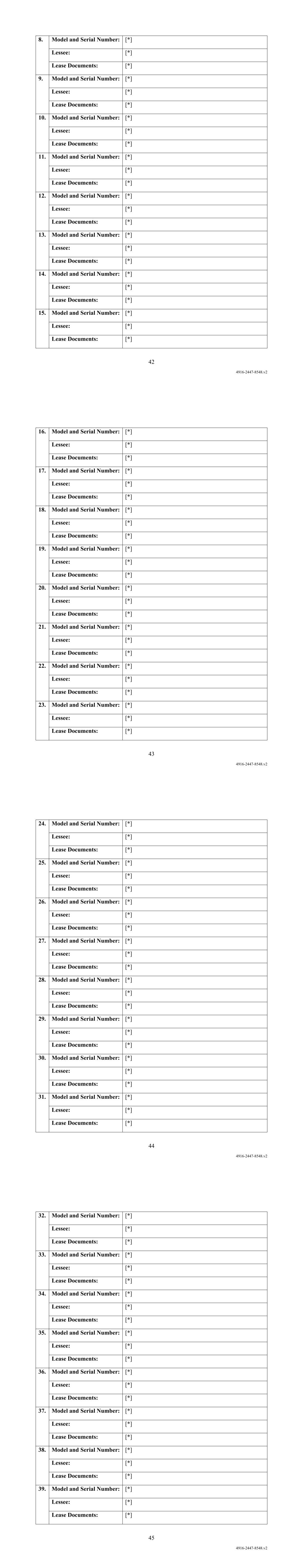 42 4916-2447-8548.v2 8. Model and Serial Number: [*] Lessee: [*] Lease Documents: [*] 9. Model and Serial Number: [*] Lessee: [*] Lease Documents: [*] 10. Model and Serial Number: [*] Lessee: [*] Lease Documents: [*] 11. Model and Serial Number: [*] Lessee: [*] Lease Documents: [*] 12. Model and Serial Number: [*] Lessee: [*] Lease Documents: [*] 13. Model and Serial Number: [*] Lessee: [*] Lease Documents: [*] 14. Model and Serial Number: [*] Lessee: [*] Lease Documents: [*] 15. Model and Serial Number: [*] Lessee: [*] Lease Documents: [*] 43 4916-2447-8548.v2 16. Model and Serial Number: [*] Lessee: [*] Lease Documents: [*] 17. Model and Serial Number: [*] Lessee: [*] Lease Documents: [*] 18. Model and Serial Number: [*] Lessee: [*] Lease Documents: [*] 19. Model and Serial Number: [*] Lessee: [*] Lease Documents: [*] 20. Model and Serial Number: [*] Lessee: [*] Lease Documents: [*] 21. Model and Serial Number: [*] Lessee: [*] Lease Documents: [*] 22. Model and Serial Number: [*] Lessee: [*] Lease Documents: [*] 23. Model and Serial Number: [*] Lessee: [*] Lease Documents: [*] 44 4916-2447-8548.v2 24. Model and Serial Number: [*] Lessee: [*] Lease Documents: [*] 25. Model and Serial Number: [*] Lessee: [*] Lease Documents: [*] 26. Model and Serial Number: [*] Lessee: [*] Lease Documents: [*] 27. Model and Serial Number: [*] Lessee: [*] Lease Documents: [*] 28. Model and Serial Number: [*] Lessee: [*] Lease Documents: [*] 29. Model and Serial Number: [*] Lessee: [*] Lease Documents: [*] 30. Model and Serial Number: [*] Lessee: [*] Lease Documents: [*] 31. Model and Serial Number: [*] Lessee: [*] Lease Documents: [*] 45 4916-2447-8548.v2 32. Model and Serial Number: [*] Lessee: [*] Lease Documents: [*] 33. Model and Serial Number: [*] Lessee: [*] Lease Documents: [*] 34. Model and Serial Number: [*] Lessee: [*] Lease Documents: [*] 35. Model and Serial Number: [*] Lessee: [*] Lease Documents: [*] 36. Model and Serial Number: [*] Lessee: [*] Lease Documents: [*] 37. Model and Serial Number: [*] Lessee: [*] Lease Documents: [*] 38. Model and Serial Number: [*] Lessee: [*] Lease Documents: [*] 39. Model and Serial Number: [*] Lessee: [*] Lease Documents: [*]
