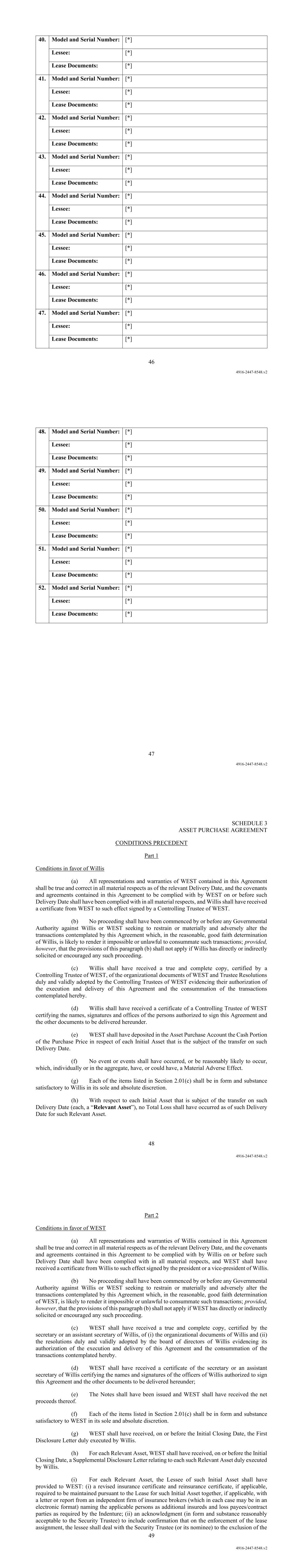 46 4916-2447-8548.v2 40. Model and Serial Number: [*] Lessee: [*] Lease Documents: [*] 41. Model and Serial Number: [*] Lessee: [*] Lease Documents: [*] 42. Model and Serial Number: [*] Lessee: [*] Lease Documents: [*] 43. Model and Serial Number: [*] Lessee: [*] Lease Documents: [*] 44. Model and Serial Number: [*] Lessee: [*] Lease Documents: [*] 45. Model and Serial Number: [*] Lessee: [*] Lease Documents: [*] 46. Model and Serial Number: [*] Lessee: [*] Lease Documents: [*] 47. Model and Serial Number: [*] Lessee: [*] Lease Documents: [*] 47 4916-2447-8548.v2 48. Model and Serial Number: [*] Lessee: [*] Lease Documents: [*] 49. Model and Serial Number: [*] Lessee: [*] Lease Documents: [*] 50. Model and Serial Number: [*] Lessee: [*] Lease Documents: [*] 51. Model and Serial Number: [*] Lessee: [*] Lease Documents: [*] 52. Model and Serial Number: [*] Lessee: [*] Lease Documents: [*] 48 4916-2447-8548.v2 SCHEDULE 3 ASSET PURCHASE AGREEMENT CONDITIONS PRECEDENT Part 1 Conditions in favor of Willis (a) All representations and warranties of WEST contained in this Agreement shall be true and correct in all material respects as of the relevant Delivery Date, and the covenants and agreements contained in this Agreement to be complied with by WEST on or before such Delivery Date shall have been complied with in all material respects, and Willis shall have received a certificate from WEST to such effect signed by a Controlling Trustee of WEST. (b) No proceeding shall have been commenced by or before any Governmental Authority against Willis or WEST seeking to restrain or materially and adversely alter the transactions contemplated by this Agreement which, in the reasonable, good faith determination of Willis, is likely to render it impossible or unlawful to consummate such transactions; provided, however, that the provisions of this paragraph (b) shall not apply if Willis has directly or indirectly solicited or encouraged any such proceeding. (c) Willis shall have received a true and complete copy, certified by a Controlling Trustee of WEST, of the organizational documents of WEST and Trustee Resolutions duly and validly adopted by the Controlling Trustees of WEST evidencing their authorization of the execution and delivery of this Agreement and the consummation of the transactions contemplated hereby. (d) Willis shall have received a certificate of a Controlling Trustee of WEST certifying the names, signatures and offices of the persons authorized to sign this Agreement and the other documents to be delivered hereunder. (e) WEST shall have deposited in the Asset Purchase Account the Cash Portion of the Purchase Price in respect of each Initial Asset that is the subject of the transfer on such Delivery Date. (f) No event or events shall have occurred, or be reasonably likely to occur, which, individually or in the aggregate, have, or could have, a Material Adverse Effect. (g) Each of the items listed in Section 2.01(c) shall be in form and substance satisfactory to Willis in its sole and absolute discretion. (h) With respect to each Initial Asset that is subject of the transfer on such Delivery Date (each, a “Relevant Asset”), no Total Loss shall have occurred as of such Delivery Date for such Relevant Asset. 49 4916-2447-8548.v2 Part 2 Conditions in favor of WEST (a) All representations and warranties of Willis contained in this Agreement shall be true and correct in all material respects as of the relevant Delivery Date, and the covenants and agreements contained in this Agreement to be complied with by Willis on or before such Delivery Date shall have been complied with in all material respects, and WEST shall have received a certificate from Willis to such effect signed by the president or a vice-president of Willis. (b) No proceeding shall have been commenced by or before any Governmental Authority against Willis or WEST seeking to restrain or materially and adversely alter the transactions contemplated by this Agreement which, in the reasonable, good faith determination of WEST, is likely to render it impossible or unlawful to consummate such transactions; provided, however, that the provisions of this paragraph (b) shall not apply if WEST has directly or indirectly solicited or encouraged any such proceeding. (c) WEST shall have received a true and complete copy, certified by the secretary or an assistant secretary of Willis, of (i) the organizational documents of Willis and (ii) the resolutions duly and validly adopted by the board of directors of Willis evidencing its authorization of the execution and delivery of this Agreement and the consummation of the transactions contemplated hereby. (d) WEST shall have received a certificate of the secretary or an assistant secretary of Willis certifying the names and signatures of the officers of Willis authorized to sign this Agreement and the other documents to be delivered hereunder; (e) The Notes shall have been issued and WEST shall have received the net proceeds thereof. (f) Each of the items listed in Section 2.01(c) shall be in form and substance satisfactory to WEST in its sole and absolute discretion. (g) WEST shall have received, on or before the Initial Closing Date, the First Disclosure Letter duly executed by Willis. (h) For each Relevant Asset, WEST shall have received, on or before the Initial Closing Date, a Supplemental Disclosure Letter relating to each such Relevant Asset duly executed by Willis. (i) For each Relevant Asset, the Lessee of such Initial Asset shall have provided to WEST: (i) a revised insurance certificate and reinsurance certificate, if applicable, required to be maintained pursuant to the Lease for such Initial Asset together, if applicable, with a letter or report from an independent firm of insurance brokers (which in each case may be in an electronic format) naming the applicable persons as additional insureds and loss payees/contract parties as required by the Indenture; (ii) an acknowledgment (in 
