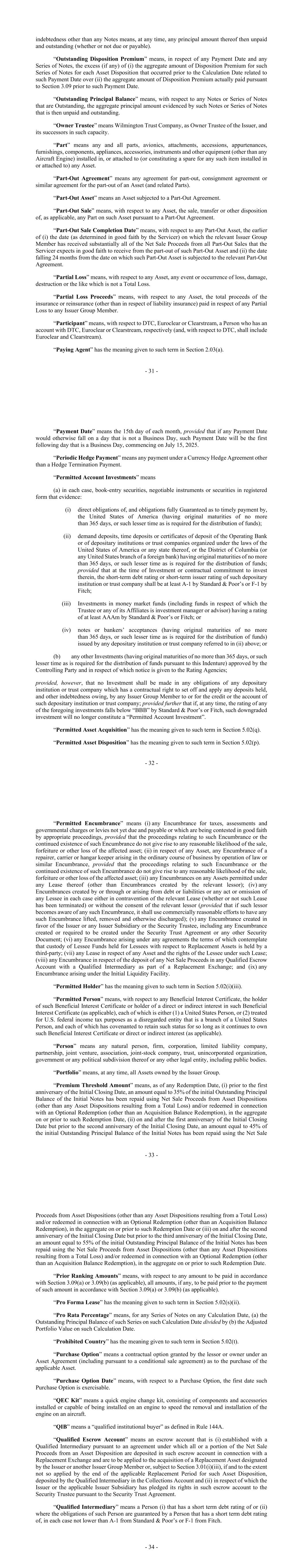 - 31 - indebtedness other than any Notes means, at any time, any principal amount thereof then unpaid and outstanding (whether or not due or payable). “Outstanding Disposition Premium” means, in respect of any Payment Date and any Series of Notes, the excess (if any) of (i) the aggregate amount of Disposition Premium for such Series of Notes for each Asset Disposition that occurred prior to the Calculation Date related to such Payment Date over (ii) the aggregate amount of Disposition Premium actually paid pursuant to Section 3.09 prior to such Payment Date. “Outstanding Principal Balance” means, with respect to any Notes or Series of Notes that are Outstanding, the aggregate principal amount evidenced by such Notes or Series of Notes that is then unpaid and outstanding. “Owner Trustee” means Wilmington Trust Company, as Owner Trustee of the Issuer, and its successors in such capacity. “Part” means any and all parts, avionics, attachments, accessions, appurtenances, furnishings, components, appliances, accessories, instruments and other equipment (other than any Aircraft Engine) installed in, or attached to (or constituting a spare for any such item installed in or attached to) any Asset. “Part-Out Agreement” means any agreement for part-out, consignment agreement or similar agreement for the part-out of an Asset (and related Parts). “Part-Out Asset” means an Asset subjected to a Part-Out Agreement. “Part-Out Sale” means, with respect to any Asset, the sale, transfer or other disposition of, as applicable, any Part on such Asset pursuant to a Part-Out Agreement. “Part-Out Sale Completion Date” means, with respect to any Part-Out Asset, the earlier of (i) the date (as determined in good faith by the Servicer) on which the relevant Issuer Group Member has received substantially all of the Net Sale Proceeds from all Part-Out Sales that the Servicer expects in good faith to receive from the part-out of such Part-Out Asset and (ii) the date falling 24 months from the date on which such Part-Out Asset is subjected to the relevant Part-Out Agreement. “Partial Loss” means, with respect to any Asset, any event or occurrence of loss, damage, destruction or the like which is not a Total Loss. “Partial Loss Proceeds” means, with respect to any Asset, the total proceeds of the insurance or reinsurance (other than in respect of liability insurance) paid in respect of any Partial Loss to any Issuer Group Member. “Participant” means, with respect to DTC, Euroclear or Clearstream, a Person who has an account with DTC, Euroclear or Clearstream, respectively (and, with respect to DTC, shall include Euroclear and Clearstream). “Paying Agent” has the meaning given to such term in Section 2.03(a). - 32 - “Payment Date” means the 15th day of each month, provided that if any Payment Date would otherwise fall on a day that is not a Business Day, such Payment Date will be the first following day that is a Business Day, commencing on July 15, 2025. “Periodic Hedge Payment” means any payment under a Currency Hedge Agreement other than a Hedge Termination Payment. “Permitted Account Investments” means (a) in each case, book-entry securities, negotiable instruments or securities in registered form that evidence: (i) direct obligations of, and obligations fully Guaranteed as to timely payment by, the United States of America (having original maturities of no more than 365 days, or such lesser time as is required for the distribution of funds); (ii) demand deposits, time deposits or certificates of deposit of the Operating Bank or of depositary institutions or trust companies organized under the laws of the United States of America or any state thereof, or the District of Columbia (or any United States branch of a foreign bank) having original maturities of no more than 365 days, or such lesser time as is required for the distribution of funds; provided that at the time of Investment or contractual commitment to invest therein, the short-term debt rating or short-term issuer rating of such depositary institution or trust company shall be at least A-1 by Standard & Poor’s or F-1 by Fitch; (iii) Investments in money market funds (including funds in respect of which the Trustee or any of its Affiliates is investment manager or advisor) having a rating of at least AAAm by Standard & Poor’s or Fitch; or (iv) notes or bankers’ acceptances (having original maturities of no more than 365 days, or such lesser time as is required for the distribution of funds) issued by any depositary institution or trust company referred to in (ii) above; or (b) any other Investments (having original maturities of no more than 365 days, or such lesser time as is required for the distribution of funds pursuant to this Indenture) approved by the Controlling Party and in respect of which notice is given to the Rating Agencies; provided, however, that no Investment shall be made in any obligations of any depositary institution or trust company which has a contractual right to set off and apply any deposits held, and other indebtedness owing, by any Issuer Group Member to or for the credit or the account of such depositary institution or trust company; provided further that if, at any time, the rating of any of the foregoing investments falls below “BBB” by Standard & Poor’s or Fitch, such downgraded investment will no longer constitute a “Permitted Account Investment”. “Permitted Asset Acquisition” has the meaning given to such term in Section 5.02(q). “Permitted Asset Disposition” has the meaning given to such term in Section 5.02(p). - 33 - “Permitted Encumbrance” means (i) any Encumbrance for taxes, assessments and governmental charges or levies not yet due and payable or which are being contested in good faith by appropriate proceedings, provided that the proceedings relating to such Encumbrance or the continued existence of such Encumbrance do not give rise