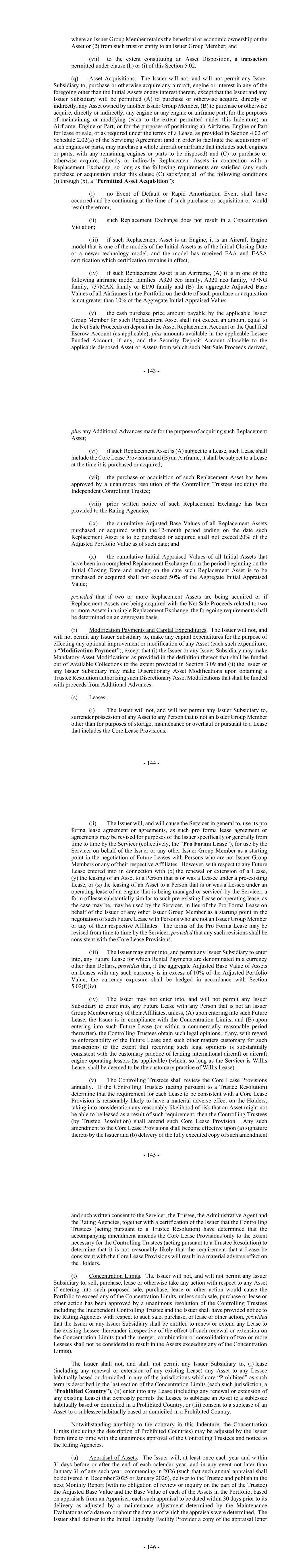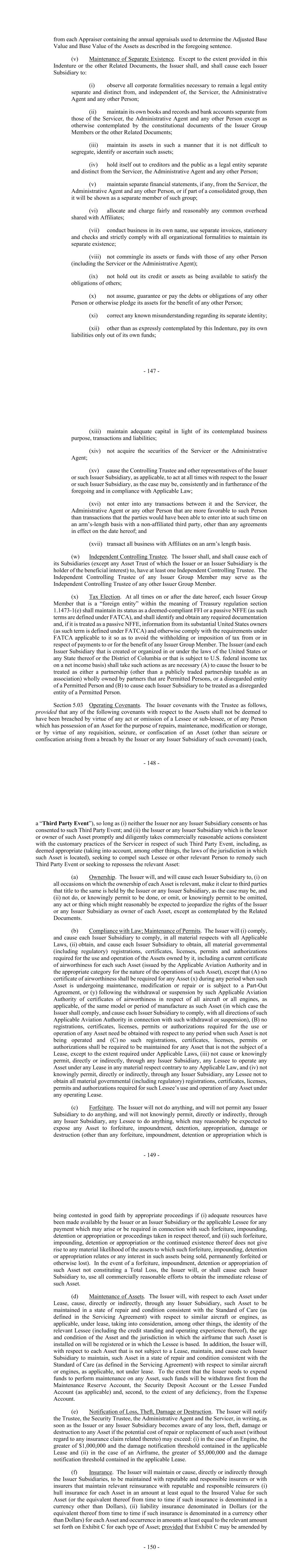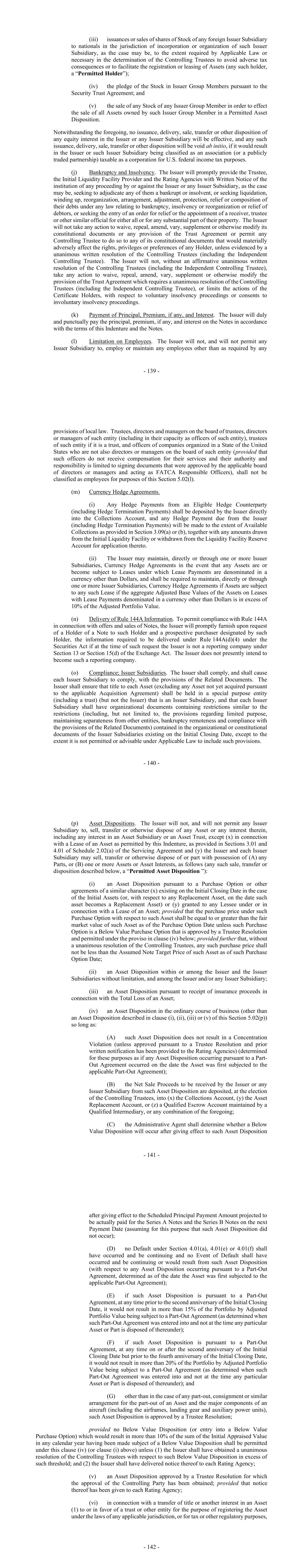 - 143 - where an Issuer Group Member retains the beneficial or economic ownership of the Asset or (2) from such trust or entity to an Issuer Group Member; and (vii) to the extent constituting an Asset Disposition, a transaction permitted under clause (h) or (i) of this Section 5.02. (q) Asset Acquisitions. The Issuer will not, and will not permit any Issuer Subsidiary to, purchase or otherwise acquire any aircraft, engine or interest in any of the foregoing other than the Initial Assets or any interest therein, except that the Issuer and any Issuer Subsidiary will be permitted (A) to purchase or otherwise acquire, directly or indirectly, any Asset owned by another Issuer Group Member, (B) to purchase or otherwise acquire, directly or indirectly, any engine or any engine or airframe part, for the purposes of maintaining or modifying (each to the extent permitted under this Indenture) an Airframe, Engine or Part, or for the purposes of positioning an Airframe, Engine or Part for lease or sale, or as required under the terms of a Lease, as provided in Section 4.02 of Schedule 2.02(a) of the Servicing Agreement (and in order to facilitate the acquisition of such engines or parts, may purchase a whole aircraft or airframe that includes such engines or parts, with any remaining engines or parts to be disposed) and (C) to purchase or otherwise acquire, directly or indirectly Replacement Assets in connection with a Replacement Exchange, so long as the following requirements are satisfied (any such purchase or acquisition under this clause (C) satisfying all of the following conditions (i) through (x), a “Permitted Asset Acquisition”): (i) no Event of Default or Rapid Amortization Event shall have occurred and be continuing at the time of such purchase or acquisition or would result therefrom; (ii) such Replacement Exchange does not result in a Concentration Violation; (iii) if such Replacement Asset is an Engine, it is an Aircraft Engine model that is one of the models of the Initial Assets as of the Initial Closing Date or a newer technology model, and the model has received FAA and EASA certification which certification remains in effect; (iv) if such Replacement Asset is an Airframe, (A) it is in one of the following airframe model families: A320 ceo family, A320 neo family, 737NG family, 737MAX family or E190 family and (B) the aggregate Adjusted Base Values of all Airframes in the Portfolio on the date of such purchase or acquisition is not greater than 10% of the Aggregate Initial Appraised Value; (v) the cash purchase price amount payable by the applicable Issuer Group Member for such Replacement Asset shall not exceed an amount equal to the Net Sale Proceeds on deposit in the Asset Replacement Account or the Qualified Escrow Account (as applicable), plus amounts available in the applicable Lessee Funded Account, if any, and the Security Deposit Account allocable to the applicable disposed Asset or Assets from which such Net Sale Proceeds derived, - 144 - plus any Additional Advances made for the purpose of acquiring such Replacement Asset; (vi) if such Replacement Asset is (A) subject to a Lease, such Lease shall include the Core Lease Provisions and (B) an Airframe, it shall be subject to a Lease at the time it is purchased or acquired; (vii) the purchase or acquisition of such Replacement Asset has been approved by a unanimous resolution of the Controlling Trustees including the Independent Controlling Trustee; (viii) prior written notice of such Replacement Exchange has been provided to the Rating Agencies; (ix) the cumulative Adjusted Base Values of all Replacement Assets purchased or acquired within the 12-month period ending on the date such Replacement Asset is to be purchased or acquired shall not exceed 20% of the Adjusted Portfolio Value as of such date; and (x) the cumulative Initial Appraised Values of all Initial Assets that have been in a completed Replacement Exchange from the period beginning on the Initial Closing Date and ending on the date such Replacement Asset is to be purchased or acquired shall not exceed 50% of the Aggregate Initial Appraised Value; provided that if two or more Replacement Assets are being acquired or if Replacement Assets are being acquired with the Net Sale Proceeds related to two or more Assets in a single Replacement Exchange, the foregoing requirements shall be determined on an aggregate basis. (r) Modification Payments and Capital Expenditures. The Issuer will not, and will not permit any Issuer Subsidiary to, make any capital expenditures for the purpose of effecting any optional improvement or modification of any Asset (each such expenditure, a “Modification Payment”), except that (i) the Issuer or any Issuer Subsidiary may make Mandatory Asset Modifications as provided in the definition thereof that shall be funded out of Available Collections to the extent provided in Section 3.09 and (ii) the Issuer or any Issuer Subsidiary may make Discretionary Asset Modifications upon obtaining a Trustee Resolution authorizing such Discretionary Asset Modifications that shall be funded with proceeds from Additional Advances. (s) Leases. (i) The Issuer will not, and will not permit any Issuer Subsidiary to, surrender possession of any Asset to any Person that is not an Issuer Group Member other than for purposes of storage, maintenance or overhaul or pursuant to a Lease that includes the Core Lease Provisions. - 145 - (ii) The Issuer will, and will cause the Servicer in general to, use its pro forma lease agreement or agreements, as such pro forma lease agreement or agreements may be revised for purposes of the Issuer specifically or generally from time to time by the Servicer (collectively, the “Pro Forma Lease”), for use by the Servicer on behalf of the Issuer or any other Issuer Group Member as a starting point in the negotiation of Future Leases with Persons who are not Issuer Group Members or any of their respective Affiliates. Howeve