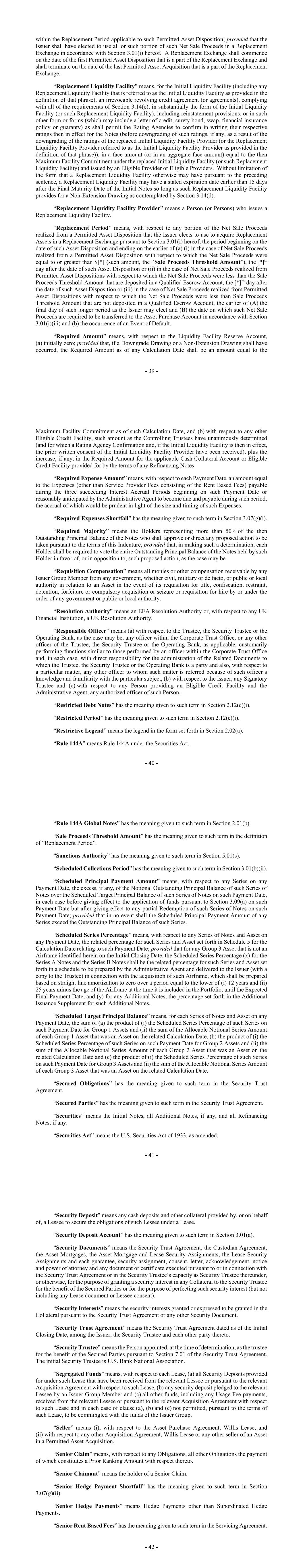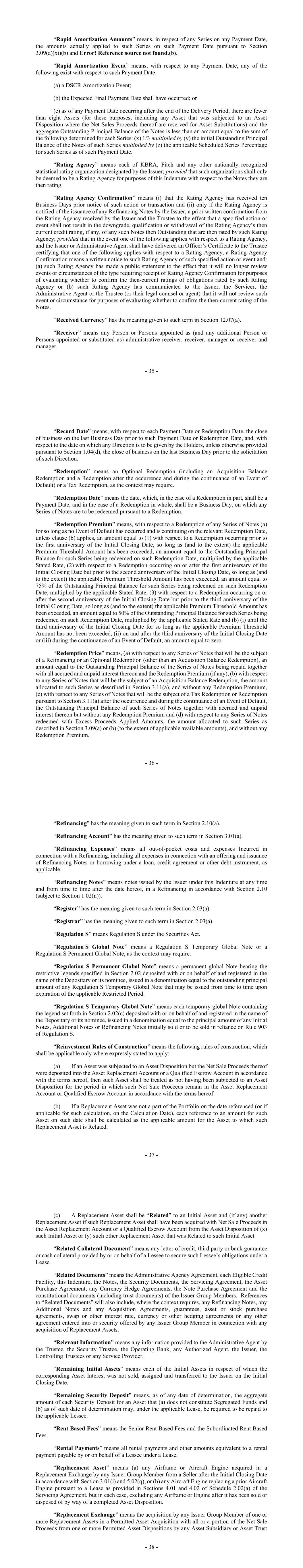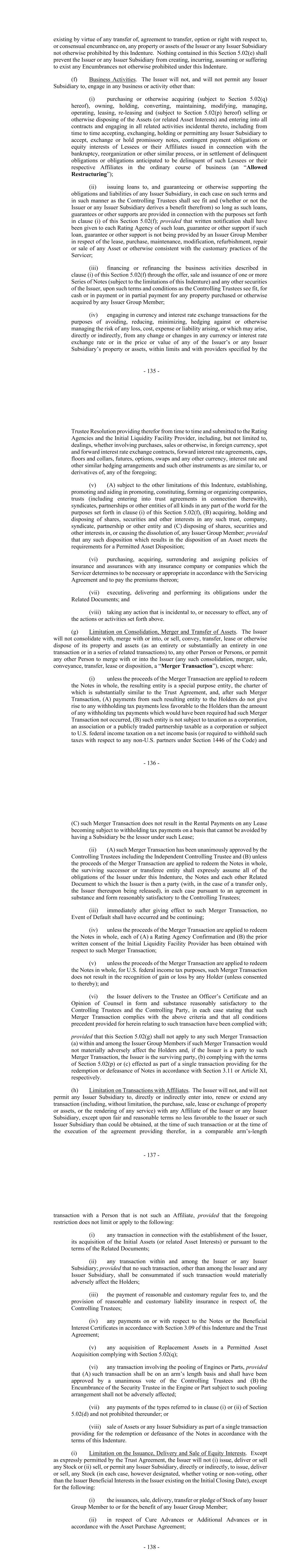 - 143 - where an Issuer Group Member retains the beneficial or economic ownership of the Asset or (2) from such trust or entity to an Issuer Group Member; and (vii) to the extent constituting an Asset Disposition, a transaction permitted under clause (h) or (i) of this Section 5.02. (q) Asset Acquisitions. The Issuer will not, and will not permit any Issuer Subsidiary to, purchase or otherwise acquire any aircraft, engine or interest in any of the foregoing other than the Initial Assets or any interest therein, except that the Issuer and any Issuer Subsidiary will be permitted (A) to purchase or otherwise acquire, directly or indirectly, any Asset owned by another Issuer Group Member, (B) to purchase or otherwise acquire, directly or indirectly, any engine or any engine or airframe part, for the purposes of maintaining or modifying (each to the extent permitted under this Indenture) an Airframe, Engine or Part, or for the purposes of positioning an Airframe, Engine or Part for lease or sale, or as required under the terms of a Lease, as provided in Section 4.02 of Schedule 2.02(a) of the Servicing Agreement (and in order to facilitate the acquisition of such engines or parts, may purchase a whole aircraft or airframe that includes such engines or parts, with any remaining engines or parts to be disposed) and (C) to purchase or otherwise acquire, directly or indirectly Replacement Assets in connection with a Replacement Exchange, so long as the following requirements are satisfied (any such purchase or acquisition under this clause (C) satisfying all of the following conditions (i) through (x), a “Permitted Asset Acquisition”): (i) no Event of Default or Rapid Amortization Event shall have occurred and be continuing at the time of such purchase or acquisition or would result therefrom; (ii) such Replacement Exchange does not result in a Concentration Violation; (iii) if such Replacement Asset is an Engine, it is an Aircraft Engine model that is one of the models of the Initial Assets as of the Initial Closing Date or a newer technology model, and the model has received FAA and EASA certification which certification remains in effect; (iv) if such Replacement Asset is an Airframe, (A) it is in one of the following airframe model families: A320 ceo family, A320 neo family, 737NG family, 737MAX family or E190 family and (B) the aggregate Adjusted Base Values of all Airframes in the Portfolio on the date of such purchase or acquisition is not greater than 10% of the Aggregate Initial Appraised Value; (v) the cash purchase price amount payable by the applicable Issuer Group Member for such Replacement Asset shall not exceed an amount equal to the Net Sale Proceeds on deposit in the Asset Replacement Account or the Qualified Escrow Account (as applicable), plus amounts available in the applicable Lessee Funded Account, if any, and the Security Deposit Account allocable to the applicable disposed Asset or Assets from which such Net Sale Proceeds derived, - 144 - plus any Additional Advances made for the purpose of acquiring such Replacement Asset; (vi) if such Replacement Asset is (A) subject to a Lease, such Lease shall include the Core Lease Provisions and (B) an Airframe, it shall be subject to a Lease at the time it is purchased or acquired; (vii) the purchase or acquisition of such Replacement Asset has been approved by a unanimous resolution of the Controlling Trustees including the Independent Controlling Trustee; (viii) prior written notice of such Replacement Exchange has been provided to the Rating Agencies; (ix) the cumulative Adjusted Base Values of all Replacement Assets purchased or acquired within the 12-month period ending on the date such Replacement Asset is to be purchased or acquired shall not exceed 20% of the Adjusted Portfolio Value as of such date; and (x) the cumulative Initial Appraised Values of all Initial Assets that have been in a completed Replacement Exchange from the period beginning on the Initial Closing Date and ending on the date such Replacement Asset is to be purchased or acquired shall not exceed 50% of the Aggregate Initial Appraised Value; provided that if two or more Replacement Assets are being acquired or if Replacement Assets are being acquired with the Net Sale Proceeds related to two or more Assets in a single Replacement Exchange, the foregoing requirements shall be determined on an aggregate basis. (r) Modification Payments and Capital Expenditures. The Issuer will not, and will not permit any Issuer Subsidiary to, make any capital expenditures for the purpose of effecting any optional improvement or modification of any Asset (each such expenditure, a “Modification Payment”), except that (i) the Issuer or any Issuer Subsidiary may make Mandatory Asset Modifications as provided in the definition thereof that shall be funded out of Available Collections to the extent provided in Section 3.09 and (ii) the Issuer or any Issuer Subsidiary may make Discretionary Asset Modifications upon obtaining a Trustee Resolution authorizing such Discretionary Asset Modifications that shall be funded with proceeds from Additional Advances. (s) Leases. (i) The Issuer will not, and will not permit any Issuer Subsidiary to, surrender possession of any Asset to any Person that is not an Issuer Group Member other than for purposes of storage, maintenance or overhaul or pursuant to a Lease that includes the Core Lease Provisions. - 145 - (ii) The Issuer will, and will cause the Servicer in general to, use its pro forma lease agreement or agreements, as such pro forma lease agreement or agreements may be revised for purposes of the Issuer specifically or generally from time to time by the Servicer (collectively, the “Pro Forma Lease”), for use by the Servicer on behalf of the Issuer or any other Issuer Group Member as a starting point in the negotiation of Future Leases with Persons who are not Issuer Group Members or any of their respective Affiliates. Howeve