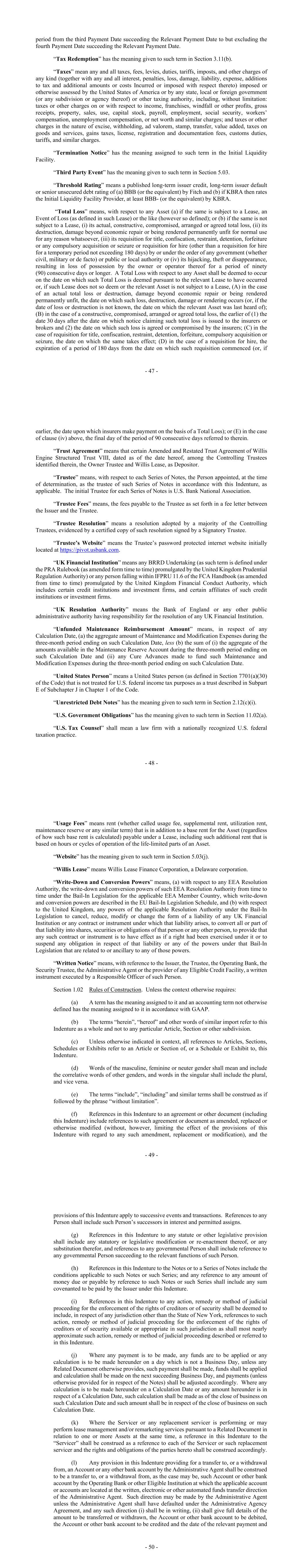 - 47 - period from the third Payment Date succeeding the Relevant Payment Date to but excluding the fourth Payment Date succeeding the Relevant Payment Date. “Tax Redemption” has the meaning given to such term in Section 3.11(b). “Taxes” mean any and all taxes, fees, levies, duties, tariffs, imposts, and other charges of any kind (together with any and all interest, penalties, loss, damage, liability, expense, additions to tax and additional amounts or costs Incurred or imposed with respect thereto) imposed or otherwise assessed by the United States of America or by any state, local or foreign government (or any subdivision or agency thereof) or other taxing authority, including, without limitation: taxes or other charges on or with respect to income, franchises, windfall or other profits, gross receipts, property, sales, use, capital stock, payroll, employment, social security, workers’ compensation, unemployment compensation, or net worth and similar charges; and taxes or other charges in the nature of excise, withholding, ad valorem, stamp, transfer, value added, taxes on goods and services, gains taxes, license, registration and documentation fees, customs duties, tariffs, and similar charges. “Termination Notice” has the meaning assigned to such term in the Initial Liquidity Facility. “Third Party Event” has the meaning given to such term in Section 5.03. “Threshold Rating” means a published long-term issuer credit, long-term issuer default or senior unsecured debt rating of (a) BBB (or the equivalent) by Fitch and (b) if KBRA then rates the Initial Liquidity Facility Provider, at least BBB- (or the equivalent) by KBRA. “Total Loss” means, with respect to any Asset (a) if the same is subject to a Lease, an Event of Loss (as defined in such Lease) or the like (however so defined); or (b) if the same is not subject to a Lease, (i) its actual, constructive, compromised, arranged or agreed total loss, (ii) its destruction, damage beyond economic repair or being rendered permanently unfit for normal use for any reason whatsoever, (iii) its requisition for title, confiscation, restraint, detention, forfeiture or any compulsory acquisition or seizure or requisition for hire (other than a requisition for hire for a temporary period not exceeding 180 days) by or under the order of any government (whether civil, military or de facto) or public or local authority or (iv) its hijacking, theft or disappearance, resulting in loss of possession by the owner or operator thereof for a period of ninety (90) consecutive days or longer. A Total Loss with respect to any Asset shall be deemed to occur on the date on which such Total Loss is deemed pursuant to the relevant Lease to have occurred or, if such Lease does not so deem or the relevant Asset is not subject to a Lease, (A) in the case of an actual total loss or destruction, damage beyond economic repair or being rendered permanently unfit, the date on which such loss, destruction, damage or rendering occurs (or, if the date of loss or destruction is not known, the date on which the relevant Asset was last heard of); (B) in the case of a constructive, compromised, arranged or agreed total loss, the earlier of (1) the date 30 days after the date on which notice claiming such total loss is issued to the insurers or brokers and (2) the date on which such loss is agreed or compromised by the insurers; (C) in the case of requisition for title, confiscation, restraint, detention, forfeiture, compulsory acquisition or seizure, the date on which the same takes effect; (D) in the case of a requisition for hire, the expiration of a period of 180 days from the date on which such requisition commenced (or, if - 48 - earlier, the date upon which insurers make payment on the basis of a Total Loss); or (E) in the case of clause (iv) above, the final day of the period of 90 consecutive days referred to therein. “Trust Agreement” means that certain Amended and Restated Trust Agreement of Willis Engine Structured Trust VIII, dated as of the date hereof, among the Controlling Trustees identified therein, the Owner Trustee and Willis Lease, as Depositor. “Trustee” means, with respect to each Series of Notes, the Person appointed, at the time of determination, as the trustee of such Series of Notes in accordance with this Indenture, as applicable. The initial Trustee for each Series of Notes is U.S. Bank National Association. “Trustee Fees” means, the fees payable to the Trustee as set forth in a fee letter between the Issuer and the Trustee. “Trustee Resolution” means a resolution adopted by a majority of the Controlling Trustees, evidenced by a certified copy of such resolution signed by a Signatory Trustee. “Trustee’s Website” means the Trustee’s password protected internet website initially located at https://pivot.usbank.com. “UK Financial Institution” means any BRRD Undertaking (as such term is defined under the PRA Rulebook (as amended form time to time) promulgated by the United Kingdom Prudential Regulation Authority) or any person falling within IFPRU 11.6 of the FCA Handbook (as amended from time to time) promulgated by the United Kingdom Financial Conduct Authority, which includes certain credit institutions and investment firms, and certain affiliates of such credit institutions or investment firms. “UK Resolution Authority” means the Bank of England or any other public administrative authority having responsibility for the resolution of any UK Financial Institution. “Unfunded Maintenance Reimbursement Amount” means, in respect of any Calculation Date, (a) the aggregate amount of Maintenance and Modification Expenses during the three-month period ending on such Calculation Date, less (b) the sum of (i) the aggregate of the amounts available in the Maintenance Reserve Account during the three-month period ending on such Calculation Date and (ii) any Cure Advances made to fund such Maintenance an