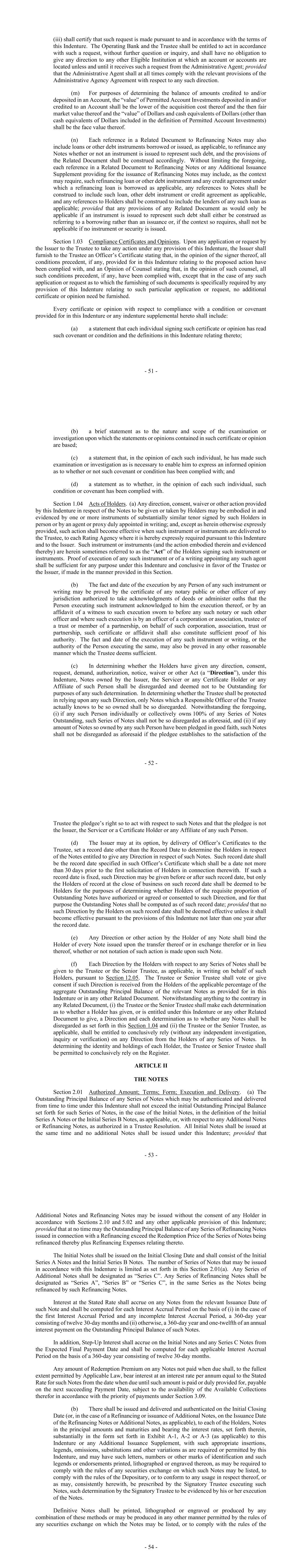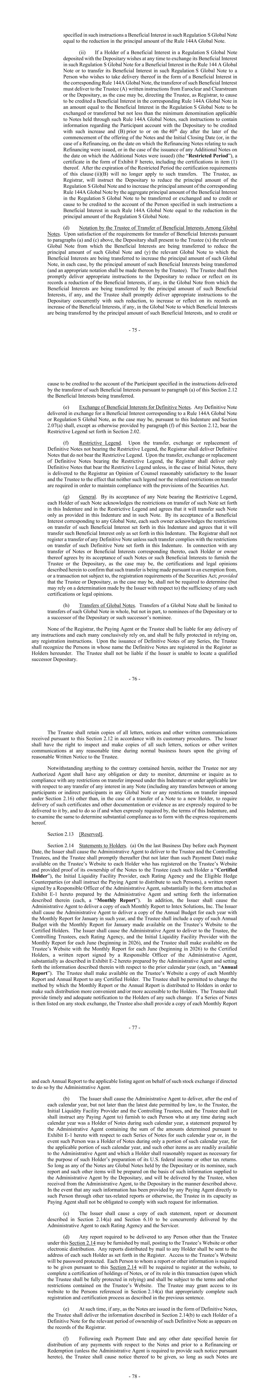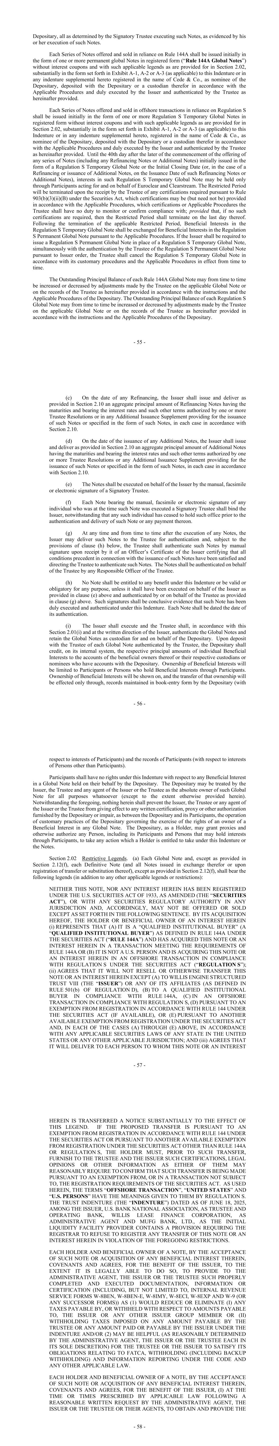 - 55 - Depositary, all as determined by the Signatory Trustee executing such Notes, as evidenced by his or her execution of such Notes. Each Series of Notes offered and sold in reliance on Rule 144A shall be issued initially in the form of one or more permanent global Notes in registered form (“Rule 144A Global Notes”) without interest coupons and with such applicable legends as are provided for in Section 2.02, substantially in the form set forth in Exhibit A-1, A-2 or A-3 (as applicable) to this Indenture or in any indenture supplemental hereto registered in the name of Cede & Co., as nominee of the Depositary, deposited with the Depositary or a custodian therefor in accordance with the Applicable Procedures and duly executed by the Issuer and authenticated by the Trustee as hereinafter provided. Each Series of Notes offered and sold in offshore transactions in reliance on Regulation S shall be issued initially in the form of one or more Regulation S Temporary Global Notes in registered form without interest coupons and with such applicable legends as are provided for in Section 2.02, substantially in the form set forth in Exhibit A-1, A-2 or A-3 (as applicable) to this Indenture or in any indenture supplemental hereto, registered in the name of Cede & Co., as nominee of the Depositary, deposited with the Depositary or a custodian therefor in accordance with the Applicable Procedures and duly executed by the Issuer and authenticated by the Trustee as hereinafter provided. Until the 40th day after the later of the commencement of the offering of any series of Notes (including any Refinancing Notes or Additional Notes) initially issued in the form of a Regulation S Temporary Global Note or the Initial Closing Date (or, in the case of a Refinancing or issuance of Additional Notes, on the Issuance Date of such Refinancing Notes or Additional Notes), interests in such Regulation S Temporary Global Note may be held only through Participants acting for and on behalf of Euroclear and Clearstream. The Restricted Period will be terminated upon the receipt by the Trustee of any certifications required pursuant to Rule 903(b)(3)(ii)(B) under the Securities Act, which certifications may be (but need not be) provided in accordance with the Applicable Procedures, which certifications or Applicable Procedures the Trustee shall have no duty to monitor or confirm compliance with; provided that, if no such certifications are required, then the Restricted Period shall terminate on the last day thereof. Following the termination of the applicable Restricted Period, Beneficial Interests in the Regulation S Temporary Global Note shall be exchanged for Beneficial Interests in the Regulation S Permanent Global Note pursuant to the Applicable Procedures. If the Issuer shall be required to issue a Regulation S Permanent Global Note in place of a Regulation S Temporary Global Note, simultaneously with the authentication by the Trustee of the Regulation S Permanent Global Note pursuant to Issuer order, the Trustee shall cancel the Regulation S Temporary Global Note in accordance with its customary procedures and the Applicable Procedures in effect from time to time. The Outstanding Principal Balance of each Rule 144A Global Note may from time to time be increased or decreased by adjustments made by the Trustee on the applicable Global Note or on the records of the Trustee as hereinafter provided in accordance with the instructions and the Applicable Procedures of the Depositary. The Outstanding Principal Balance of each Regulation S Global Note may from time to time be increased or decreased by adjustments made by the Trustee on the applicable Global Note or on the records of the Trustee as hereinafter provided in accordance with the instructions and the Applicable Procedures of the Depositary. - 56 - (c) On the date of any Refinancing, the Issuer shall issue and deliver as provided in Section 2.10 an aggregate principal amount of Refinancing Notes having the maturities and bearing the interest rates and such other terms authorized by one or more Trustee Resolutions or in any Additional Issuance Supplement providing for the issuance of such Notes or specified in the form of such Notes, in each case in accordance with Section 2.10. (d) On the date of the issuance of any Additional Notes, the Issuer shall issue and deliver as provided in Section 2.10 an aggregate principal amount of Additional Notes having the maturities and bearing the interest rates and such other terms authorized by one or more Trustee Resolutions or any Additional Issuance Supplement providing for the issuance of such Notes or specified in the form of such Notes, in each case in accordance with Section 2.10. (e) The Notes shall be executed on behalf of the Issuer by the manual, facsimile or electronic signature of a Signatory Trustee. (f) Each Note bearing the manual, facsimile or electronic signature of any individual who was at the time such Note was executed a Signatory Trustee shall bind the Issuer, notwithstanding that any such individual has ceased to hold such office prior to the authentication and delivery of such Note or any payment thereon. (g) At any time and from time to time after the execution of any Notes, the Issuer may deliver such Notes to the Trustee for authentication and, subject to the provisions of clause (h) below, the Trustee shall authenticate such Notes by manual signature upon receipt by it of an Officer’s Certificate of the Issuer certifying that all conditions precedent in connection with the issuance of such Notes have been satisfied and directing the Trustee to authenticate such Notes. The Notes shall be authenticated on behalf of the Trustee by any Responsible Officer of the Trustee. (h) No Note shall be entitled to any benefit under this Indenture or be valid or obligatory for any purpose, unless it shall have been executed on behalf of the Issuer as provided in clause (e) above and authenticated by or on 