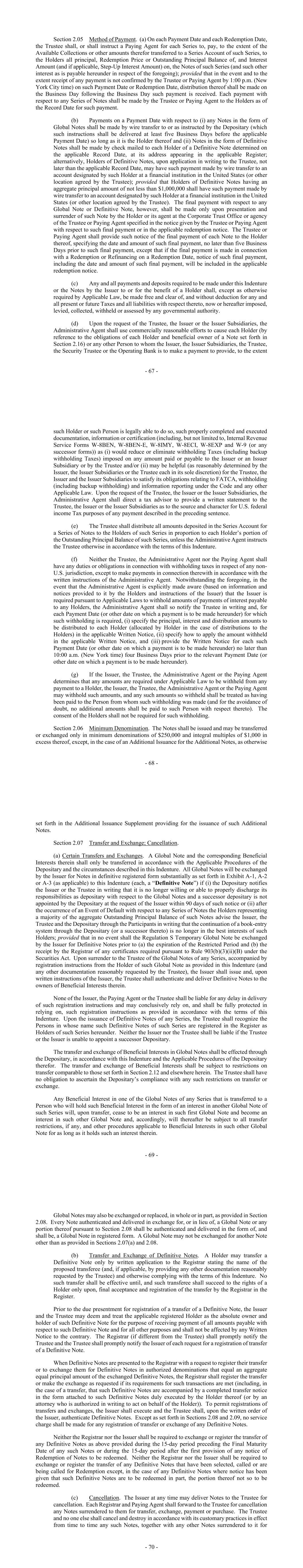 - 67 - Section 2.05 Method of Payment. (a) On each Payment Date and each Redemption Date, the Trustee shall, or shall instruct a Paying Agent for each Series to, pay, to the extent of the Available Collections or other amounts therefor transferred to a Series Account of such Series, to the Holders all principal, Redemption Price or Outstanding Principal Balance of, and Interest Amount (and if applicable, Step-Up Interest Amount) on, the Notes of such Series (and such other interest as is payable hereunder in respect of the foregoing); provided that in the event and to the extent receipt of any payment is not confirmed by the Trustee or Paying Agent by 1:00 p.m. (New York City time) on such Payment Date or Redemption Date, distribution thereof shall be made on the Business Day following the Business Day such payment is received. Each payment with respect to any Series of Notes shall be made by the Trustee or Paying Agent to the Holders as of the Record Date for such payment. (b) Payments on a Payment Date with respect to (i) any Notes in the form of Global Notes shall be made by wire transfer to or as instructed by the Depositary (which such instructions shall be delivered at least five Business Days before the applicable Payment Date) so long as it is the Holder thereof and (ii) Notes in the form of Definitive Notes shall be made by check mailed to each Holder of a Definitive Note determined on the applicable Record Date, at its address appearing in the applicable Register; alternatively, Holders of Definitive Notes, upon application in writing to the Trustee, not later than the applicable Record Date, may have such payment made by wire transfer to an account designated by such Holder at a financial institution in the United States (or other location agreed by the Trustee); provided that Holders of Definitive Notes having an aggregate principal amount of not less than $1,000,000 shall have such payment made by wire transfer to an account designated by such Holder at a financial institution in the United States (or other location agreed by the Trustee). The final payment with respect to any Global Note or Definitive Note, however, shall be made only upon presentation and surrender of such Note by the Holder or its agent at the Corporate Trust Office or agency of the Trustee or Paying Agent specified in the notice given by the Trustee or Paying Agent with respect to such final payment or in the applicable redemption notice. The Trustee or Paying Agent shall provide such notice of the final payment of each Note to the Holder thereof, specifying the date and amount of such final payment, no later than five Business Days prior to such final payment, except that if the final payment is made in connection with a Redemption or Refinancing on a Redemption Date, notice of such final payment, including the date and amount of such final payment, will be included in the applicable redemption notice. (c) Any and all payments and deposits required to be made under this Indenture or the Notes by the Issuer to or for the benefit of a Holder shall, except as otherwise required by Applicable Law, be made free and clear of, and without deduction for any and all present or future Taxes and all liabilities with respect thereto, now or hereafter imposed, levied, collected, withheld or assessed by any governmental authority. (d) Upon the request of the Trustee, the Issuer or the Issuer Subsidiaries, the Administrative Agent shall use commercially reasonable efforts to cause each Holder (by reference to the obligations of each Holder and beneficial owner of a Note set forth in Section 2.16) or any other Person to whom the Issuer, the Issuer Subsidiaries, the Trustee, the Security Trustee or the Operating Bank is to make a payment to provide, to the extent - 68 - such Holder or such Person is legally able to do so, such properly completed and executed documentation, information or certification (including, but not limited to, Internal Revenue Service Forms W-8BEN, W-8BEN-E, W-8IMY, W-8ECI, W-8EXP and W-9 (or any successor forms)) as (i) would reduce or eliminate withholding Taxes (including backup withholding Taxes) imposed on any amount paid or payable to the Issuer or an Issuer Subsidiary or by the Trustee and/or (ii) may be helpful (as reasonably determined by the Issuer, the Issuer Subsidiaries or the Trustee each in its sole discretion) for the Trustee, the Issuer and the Issuer Subsidiaries to satisfy its obligations relating to FATCA, withholding (including backup withholding) and information reporting under the Code and any other Applicable Law. Upon the request of the Trustee, the Issuer or the Issuer Subsidiaries, the Administrative Agent shall direct a tax advisor to provide a written statement to the Trustee, the Issuer or the Issuer Subsidiaries as to the source and character for U.S. federal income Tax purposes of any payment described in the preceding sentence. (e) The Trustee shall distribute all amounts deposited in the Series Account for a Series of Notes to the Holders of such Series in proportion to each Holder’s portion of the Outstanding Principal Balance of such Series, unless the Administrative Agent instructs the Trustee otherwise in accordance with the terms of this Indenture. (f) Neither the Trustee, the Administrative Agent nor the Paying Agent shall have any duties or obligations in connection with withholding taxes in respect of any non- U.S. jurisdiction, except to make payments in connection therewith in accordance with the written instructions of the Administrative Agent. Notwithstanding the foregoing, in the event that the Administrative Agent is explicitly made aware (based on information and notices provided to it by the Holders and instructions of the Issuer) that the Issuer is required pursuant to Applicable Laws to withhold amounts of payments of interest payable to any Holders, the Administrative Agent shall so notify the Trustee in writing and, for each Payment Date (or 