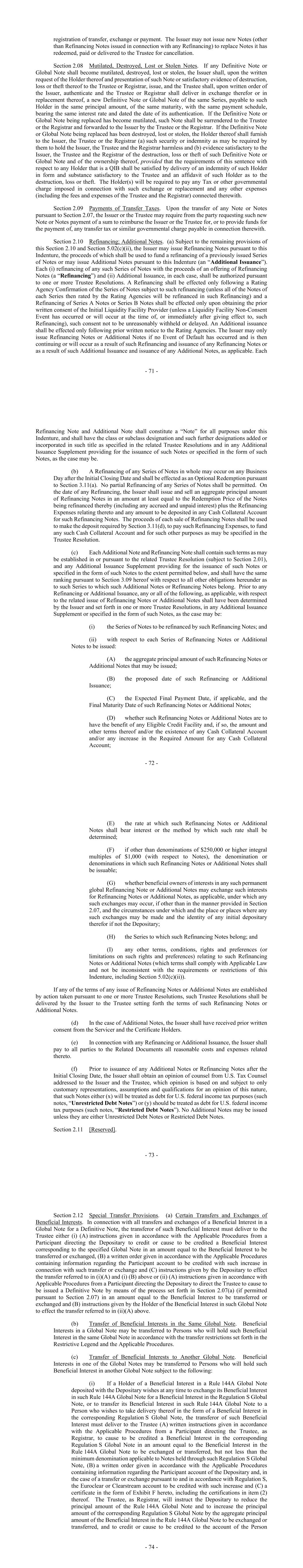 - 71 - registration of transfer, exchange or payment. The Issuer may not issue new Notes (other than Refinancing Notes issued in connection with any Refinancing) to replace Notes it has redeemed, paid or delivered to the Trustee for cancellation. Section 2.08 Mutilated, Destroyed, Lost or Stolen Notes. If any Definitive Note or Global Note shall become mutilated, destroyed, lost or stolen, the Issuer shall, upon the written request of the Holder thereof and presentation of such Note or satisfactory evidence of destruction, loss or theft thereof to the Trustee or Registrar, issue, and the Trustee shall, upon written order of the Issuer, authenticate and the Trustee or Registrar shall deliver in exchange therefor or in replacement thereof, a new Definitive Note or Global Note of the same Series, payable to such Holder in the same principal amount, of the same maturity, with the same payment schedule, bearing the same interest rate and dated the date of its authentication. If the Definitive Note or Global Note being replaced has become mutilated, such Note shall be surrendered to the Trustee or the Registrar and forwarded to the Issuer by the Trustee or the Registrar. If the Definitive Note or Global Note being replaced has been destroyed, lost or stolen, the Holder thereof shall furnish to the Issuer, the Trustee or the Registrar (a) such security or indemnity as may be required by them to hold the Issuer, the Trustee and the Registrar harmless and (b) evidence satisfactory to the Issuer, the Trustee and the Registrar of the destruction, loss or theft of such Definitive Note or Global Note and of the ownership thereof, provided that the requirements of this sentence with respect to any Holder that is a QIB shall be satisfied by delivery of an indemnity of such Holder in form and substance satisfactory to the Trustee and an affidavit of such Holder as to the destruction, loss or theft. The Holder(s) will be required to pay any Tax or other governmental charge imposed in connection with such exchange or replacement and any other expenses (including the fees and expenses of the Trustee and the Registrar) connected therewith. Section 2.09 Payments of Transfer Taxes. Upon the transfer of any Note or Notes pursuant to Section 2.07, the Issuer or the Trustee may require from the party requesting such new Note or Notes payment of a sum to reimburse the Issuer or the Trustee for, or to provide funds for the payment of, any transfer tax or similar governmental charge payable in connection therewith. Section 2.10 Refinancing; Additional Notes. (a) Subject to the remaining provisions of this Section 2.10 and Section 5.02(c)(ii), the Issuer may issue Refinancing Notes pursuant to this Indenture, the proceeds of which shall be used to fund a refinancing of a previously issued Series of Notes or may issue Additional Notes pursuant to this Indenture (an “Additional Issuance”). Each (i) refinancing of any such Series of Notes with the proceeds of an offering of Refinancing Notes (a “Refinancing”) and (ii) Additional Issuance, in each case, shall be authorized pursuant to one or more Trustee Resolutions. A Refinancing shall be effected only following a Rating Agency Confirmation of the Series of Notes subject to such refinancing (unless all of the Notes of each Series then rated by the Rating Agencies will be refinanced in such Refinancing) and a Refinancing of Series A Notes or Series B Notes shall be effected only upon obtaining the prior written consent of the Initial Liquidity Facility Provider (unless a Liquidity Facility Non-Consent Event has occurred or will occur at the time of, or immediately after giving effect to, such Refinancing), such consent not to be unreasonably withheld or delayed. An Additional issuance shall be effected only following prior written notice to the Rating Agencies. The Issuer may only issue Refinancing Notes or Additional Notes if no Event of Default has occurred and is then continuing or will occur as a result of such Refinancing and issuance of any Refinancing Notes or as a result of such Additional Issuance and issuance of any Additional Notes, as applicable. Each - 72 - Refinancing Note and Additional Note shall constitute a “Note” for all purposes under this Indenture, and shall have the class or subclass designation and such further designations added or incorporated in such title as specified in the related Trustee Resolutions and in any Additional Issuance Supplement providing for the issuance of such Notes or specified in the form of such Notes, as the case may be. (b) A Refinancing of any Series of Notes in whole may occur on any Business Day after the Initial Closing Date and shall be effected as an Optional Redemption pursuant to Section 3.11(a). No partial Refinancing of any Series of Notes shall be permitted. On the date of any Refinancing, the Issuer shall issue and sell an aggregate principal amount of Refinancing Notes in an amount at least equal to the Redemption Price of the Notes being refinanced thereby (including any accrued and unpaid interest) plus the Refinancing Expenses relating thereto and any amount to be deposited in any Cash Collateral Account for such Refinancing Notes. The proceeds of each sale of Refinancing Notes shall be used to make the deposit required by Section 3.11(d), to pay such Refinancing Expenses, to fund any such Cash Collateral Account and for such other purposes as may be specified in the Trustee Resolution. (c) Each Additional Note and Refinancing Note shall contain such terms as may be established in or pursuant to the related Trustee Resolution (subject to Section 2.01), and any Additional Issuance Supplement providing for the issuance of such Notes or specified in the form of such Notes to the extent permitted below, and shall have the same ranking pursuant to Section 3.09 hereof with respect to all other obligations hereunder as to such Series to which such Additional Notes or Refinancing Notes belong. Prior 