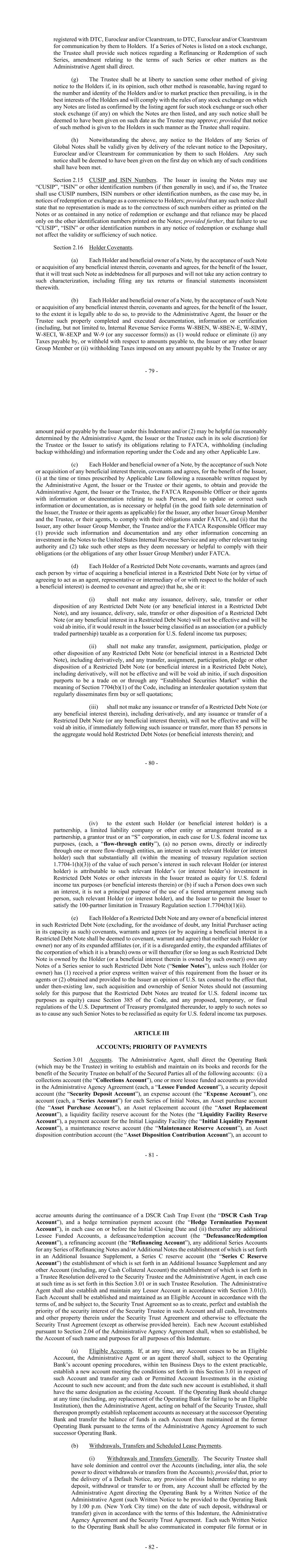 - A-1-6 – The Outstanding Principal Balance of this Note may be repaid prior to the Final Maturity Date through the application on the Payment Dates of the Available Collections to the principal hereof as provided in Section 3.09 of the Indenture (after making payments entitled to priority under Section 3.09 of the Indenture). In addition, the Issuer may optionally redeem all or part of the Outstanding Principal Balance of this Note, in the case of a redemption in whole, on any Business Day, and in the case of a redemption in part, on any Payment Date, at the applicable Redemption Price (calculated as provided in the Indenture), or, in the case of a Tax Redemption, at the Outstanding Principal Balance hereof plus accrued and unpaid interest hereon. Further, the Issuer may provide for the defeasance of this Note in accordance with Article XI of the Indenture. Interest, including Step-Up Interest, and premium on this Note that is not paid when due shall bear interest at the rate, and as and to the extent, provided in the Indenture. The indebtedness evidenced by the Series A Notes is, to the extent and in the manner provided in the Indenture and the Security Trust Agreement, subordinate and subject in right of payment to the prior payment in full of all Senior Claims, and this Note is issued subject to the provisions thereof providing for such subordination. Each Holder of this Note, by accepting the same, (a) agrees to and shall be bound by such provisions, (b) authorizes and directs the Trustee and the Security Trustee on its behalf to take such action as may be necessary or appropriate to effectuate the subordination as provided in the Indenture and (c) appoints each of the Trustee and the Security Trustee its attorney-in-fact for such purpose. All payments or distributions upon or with respect to any Obligations, which include payment of principal, premium and interest on this Note, that are received by the Holder of this Note contrary to the priority of payment provisions of the Indenture or in excess of the amounts to which the Holder of this Note is entitled under Section 3.09 of the Indenture, shall be received for the benefit of the Senior Claimant, shall be segregated from other funds and property held by the Holder of this Note and shall be forthwith paid over to the Trustee in the same form as so received (with any necessary endorsement) to be applied (in the case of cash) to or held as collateral (in the case of non-cash property or securities) for the payment or prepayment of the Senior Claims in accordance with the terms of the Indenture. The maturity of this Note is subject to Acceleration upon the occurrence and during the continuance of the Events of Default specified in the Indenture. This Note is and will be secured, on a subordinated basis as referred to above, by the collateral pledged as security therefor as provided in the Security Trust Agreement. Subject to and in accordance with the terms of the Indenture, there will be distributed with respect to this Note monthly on each Payment Date commencing on [________], to the Holder hereof, such Holder’s pro rata share (based on the aggregate percentage of the Outstanding Principal Balance of the Series A Notes held by such Holder) of the aggregate amount as may be distributable to all Holders of Series A Notes on such Payment Date pursuant to Section 3.09 of the Indenture. All amounts payable in respect of this Note shall be payable in U.S. dollars in immediately available funds in the manner provided in the Indenture to the Holder hereof. The final payment with respect to this Note, however, shall be made only upon presentation and surrender of this Note by the Holder or its agent at the Corporate Trust Office or agency of the Trustee or Paying - A-1-7 – Agent specified in the notice given by the Trustee or Paying Agent with respect to such final payment. At such time, if any, as this Note is issued in the form of one or more Definitive Notes, payments on a Payment Date shall be made by check mailed to each Holder of such a Definitive Note on the applicable Record Date at its address appearing on the Register maintained with respect to the Notes. Alternatively, upon application in writing to the Trustee, not later than the applicable Record Date, a Holder of one or more Definitive Notes, may have such payments made by wire transfer to an account designated by such Holder at a financial institution in the United States (or other location agreed by the Trustee); provided that Holders of Definitive Notes having an aggregate principal amount of not less than $1,000,000 shall have such payment made by wire transfer to an account designated by such Holder at a financial institution in the United States (or other location agreed by the Trustee). The Trustee or Paying Agent shall provide such notice of the final payment of a Note to the Holder thereof, specifying the date and amount of such final payment, no later than five Business Days prior to such final payment. The Series A Notes are issuable in a single series only in fully registered form without interest coupons. A Holder may transfer a Global Note by delivery thereof and otherwise complying with the terms of the Indenture. No transfer of a Definitive Note shall be effective until, and such transferee shall succeed to the rights of a Holder only upon, final acceptance and registration of the transfer by the Registrar in the Register; provided that in no event may any Note be transferred in any transaction that is required to be registered under the Securities Act. When a Definitive Note is presented to the Registrar with a request to register the transfer or to exchange it for Series A Notes of authorized denominations in an aggregate principal amount equal to the exchanged Notes, the Registrar shall register the transfer or make the exchange as requested if its requirements for such transactions are met (including, in the case of a transfer, that such Definitive 
