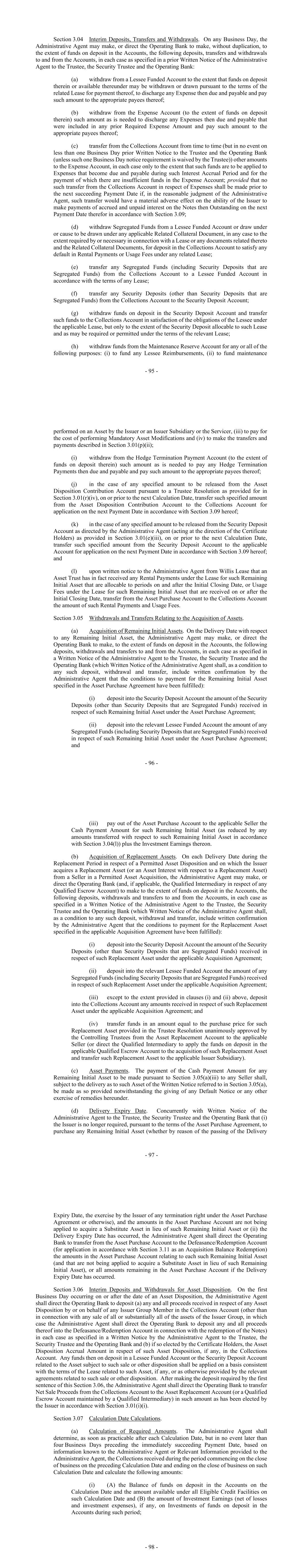 - 95 - Section 3.04 Interim Deposits, Transfers and Withdrawals. On any Business Day, the Administrative Agent may make, or direct the Operating Bank to make, without duplication, to the extent of funds on deposit in the Accounts, the following deposits, transfers and withdrawals to and from the Accounts, in each case as specified in a prior Written Notice of the Administrative Agent to the Trustee, the Security Trustee and the Operating Bank: (a) withdraw from a Lessee Funded Account to the extent that funds on deposit therein or available thereunder may be withdrawn or drawn pursuant to the terms of the related Lease for payment thereof, to discharge any Expense then due and payable and pay such amount to the appropriate payees thereof; (b) withdraw from the Expense Account (to the extent of funds on deposit therein) such amount as is needed to discharge any Expenses then due and payable that were included in any prior Required Expense Amount and pay such amount to the appropriate payees thereof; (c) transfer from the Collections Account from time to time (but in no event on less than one Business Day prior Written Notice to the Trustee and the Operating Bank (unless such one Business Day notice requirement is waived by the Trustee)) other amounts to the Expense Account, in each case only to the extent that such funds are to be applied to Expenses that become due and payable during such Interest Accrual Period and for the payment of which there are insufficient funds in the Expense Account; provided that no such transfer from the Collections Account in respect of Expenses shall be made prior to the next succeeding Payment Date if, in the reasonable judgment of the Administrative Agent, such transfer would have a material adverse effect on the ability of the Issuer to make payments of accrued and unpaid interest on the Notes then Outstanding on the next Payment Date therefor in accordance with Section 3.09; (d) withdraw Segregated Funds from a Lessee Funded Account or draw under or cause to be drawn under any applicable Related Collateral Document, in any case to the extent required by or necessary in connection with a Lease or any documents related thereto and the Related Collateral Documents, for deposit in the Collections Account to satisfy any default in Rental Payments or Usage Fees under any related Lease; (e) transfer any Segregated Funds (including Security Deposits that are Segregated Funds) from the Collections Account to a Lessee Funded Account in accordance with the terms of any Lease; (f) transfer any Security Deposits (other than Security Deposits that are Segregated Funds) from the Collections Account to the Security Deposit Account; (g) withdraw funds on deposit in the Security Deposit Account and transfer such funds to the Collections Account in satisfaction of the obligations of the Lessee under the applicable Lease, but only to the extent of the Security Deposit allocable to such Lease and as may be required or permitted under the terms of the relevant Lease; (h) withdraw funds from the Maintenance Reserve Account for any or all of the following purposes: (i) to fund any Lessee Reimbursements, (ii) to fund maintenance - 96 - performed on an Asset by the Issuer or an Issuer Subsidiary or the Servicer, (iii) to pay for the cost of performing Mandatory Asset Modifications and (iv) to make the transfers and payments described in Section 3.01(p)(ii); (i) withdraw from the Hedge Termination Payment Account (to the extent of funds on deposit therein) such amount as is needed to pay any Hedge Termination Payments then due and payable and pay such amount to the appropriate payees thereof; (j) in the case of any specified amount to be released from the Asset Disposition Contribution Account pursuant to a Trustee Resolution as provided for in Section 3.01(r)(iv), on or prior to the next Calculation Date, transfer such specified amount from the Asset Disposition Contribution Account to the Collections Account for application on the next Payment Date in accordance with Section 3.09 hereof; (k) in the case of any specified amount to be released from the Security Deposit Account as directed by the Administrative Agent (acting at the direction of the Certificate Holders) as provided in Section 3.01(e)(iii), on or prior to the next Calculation Date, transfer such specified amount from the Security Deposit Account to the applicable Account for application on the next Payment Date in accordance with Section 3.09 hereof; and (l) upon written notice to the Administrative Agent from Willis Lease that an Asset Trust has in fact received any Rental Payments under the Lease for such Remaining Initial Asset that are allocable to periods on and after the Initial Closing Date, or Usage Fees under the Lease for such Remaining Initial Asset that are received on or after the Initial Closing Date, transfer from the Asset Purchase Account to the Collections Account the amount of such Rental Payments and Usage Fees. Section 3.05 Withdrawals and Transfers Relating to the Acquisition of Assets. (a) Acquisition of Remaining Initial Assets. On the Delivery Date with respect to any Remaining Initial Asset, the Administrative Agent may make, or direct the Operating Bank to make, to the extent of funds on deposit in the Accounts, the following deposits, withdrawals and transfers to and from the Accounts, in each case as specified in a Written Notice of the Administrative Agent to the Trustee, the Security Trustee and the Operating Bank (which Written Notice of the Administrative Agent shall, as a condition to any such deposit, withdrawal and transfer, include written confirmation by the Administrative Agent that the conditions to payment for the Remaining Initial Asset specified in the Asset Purchase Agreement have been fulfilled): (i) deposit into the Security Deposit Account the amount of the Security Deposits (other than Security Deposits that are Segregated Funds) received in respect of such Remaining In