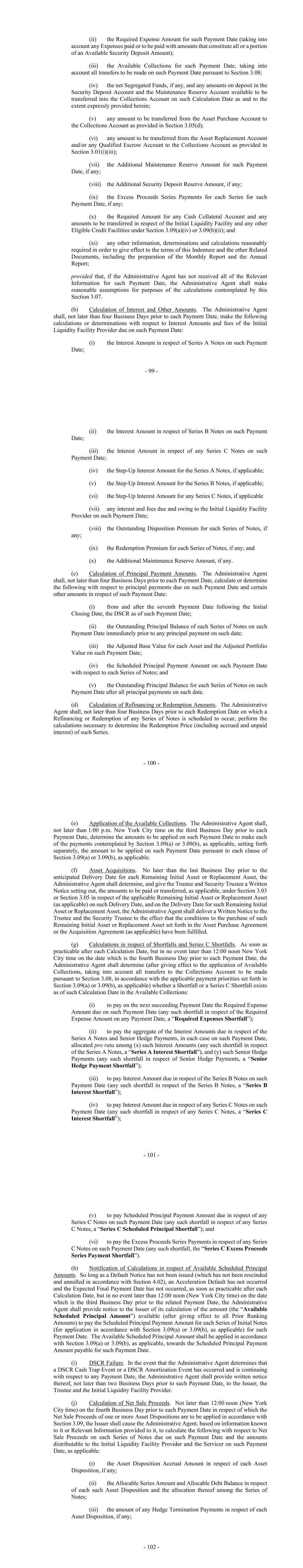 - 107 - (vii) to the Security Deposit Account, an amount equal to the Additional Security Deposit Reserve Amount; (viii) to the Maintenance Reserve Account, (A) so long as no Rapid Amortization Event (other than the Expected Final Payment Date) has occurred and is continuing, the lesser of (1) an amount equal to the Additional Maintenance Reserve Amount and (2) 85% of the Available Collections after giving effect to clauses (i) through (vii) above or (B) if a Rapid Amortization Event (other than the Expected Final Payment Date) has occurred and is continuing, an amount equal to the Additional Maintenance Reserve Amount; (ix) so long as no Rapid Amortization Event has occurred and is continuing, first, to the Series Account for the Series A Notes, the Excess Proceeds Series Payment for the Series A Notes for such Payment Date and, second, to the Series Account for the Series B Notes, the Excess Proceeds Series Payment for the Series B Notes for such Payment Date; (x) if a DSCR Cash Trap Event has occurred and is continuing, but no Rapid Amortization Event has occurred and is continuing, to the DSCR Cash Trap Account, all remaining amounts; (xi) if a Rapid Amortization Event has occurred and is continuing, to the Series Account for the Series A Notes, (a) first, an amount equal to the Scheduled Principal Payment Amount of the Series A Notes for such Payment Date and (b) second, an amount equal to the Outstanding Principal Balance of such Series A Notes; (xii) if a Rapid Amortization Event has occurred and is continuing, to the Series Account for the Series B Notes, (a) first, an amount equal to the Scheduled Principal Payment Amount of the Series B Notes for such Payment Date and (b) second, an amount equal to the Outstanding Principal Balance of such Series B Notes; (xiii) to the Series Account for the Series C Notes, the Interest Amount on such Series C Notes; (xiv) to the Series Account for the Series C Notes, an amount equal to the Scheduled Principal Payment Amount of the Series C Notes for such Payment Date; (xv) to the Series Account for the Series C Notes, the Excess Proceeds Series Payment for the Series C Notes for such Payment Date; (xvi) to the Series C Reserve Account, the Additional Series C Reserve Amount; (xvii) after the Expected Final Payment Date, to the Series Account for the Series A Notes, the Step-Up Interest Amount for the Series A Notes; - 108 - (xviii) after the Expected Final Payment Date, to the Series Account for the Series B Notes, the Step-Up Interest Amount for the Series B Notes; (xix) after the Expected Final Payment Date, to the Series Account for the Series C Notes, the Step-Up Interest Amount for the Series C Notes; (xx) to the Servicer, the Subordinated Rent Based Fees; (xxi) in no order of priority inter se, but pro rata (A) to the Eligible Hedge Counterparties, in no order of priority inter se, but pro rata, to pay the Subordinated Hedge Payments, and (B) to pay Subordinated Expenses to the applicable parties in no order of priority inter se, but pro rata; (xxii) first, to the payment of any Outstanding Disposition Premium, to the Series Account for the Series A Notes, second, to the payment of any Outstanding Disposition Premium, to the Series Account for the Series B Notes and third, to the payment of any Outstanding Disposition Premium, to the Series Account for the Series C Notes; (xxiii) to the Asset Disposition Contribution Account, the Asset Disposition Accrual Deposit, if any, specified by the Certificate Holders; (xxiv) to the Asset Purchase Account, such amounts as have been approved by a Trustee Resolution in accordance with Section 5.02(r) hereof for Discretionary Asset Modifications; and (xxv) to the Issuer, all remaining amounts. (b) Anything to the contrary contained in Section 3.09(a) notwithstanding, after delivery to the Issuer and the Administrative Agent of a Default Notice or during the continuance of an Acceleration Default, the allocation of payments described in Section 3.09(a) shall not apply and the Administrative Agent shall direct the Operating Bank in writing to cause all amounts on deposit in the Collections Account to be applied on each Payment Date in the following order of priority: (i) to the Expense Account, an amount such that the amount on deposit therein is equal to the Required Expense Amount for such Payment Date, for payment of Expenses (including, without limitation, any amount payable by any Issuer Group Member to any Lessee pursuant to a Lease, Indemnification Amounts, Subordinated Expenses, Special Litigation Expenses, Trustee Fees and all Service Provider Fees (including the Senior Rent Based Fees and Disposition Fees, but excluding the Subordinated Rent Based Fees), but excluding, for the avoidance of doubt, the portion of any Maintenance and Modification Expenses funded from the Maintenance Reserve Account, and excluding any Credit Facility Advance Obligations) that are due and payable or reimbursable on such Payment Date and included in the Required Expense Amount for such Payment Date, with the balance to be retained in the Expense Account, in each case less the amount of any withdrawals from the Liquidity Facility Reserve Account or any Facility Drawings - 109 - in respect of the Required Expenses Shortfall for such Payment Date withdrawn or paid (as applicable) on or before such Payment Date in respect of such Payment Date; (ii) to any Persons providing any Eligible Credit Facilities, pro rata inter se, first, any Credit Facility Obligations consisting of interest and second, any other Credit Facility Advance Obligations, in each case payable to such Persons under the terms of their respective Eligible Credit Facilities; (iii) in no order of priority inter se, but pro rata as to the amounts described in clauses (A) and (B) as follows: (A) to the Series Account for the Series A Notes, the Interest Amount on such Series A Notes and (B) pro rata, to any Eligible Hedge Counterparties, an amount equal to
