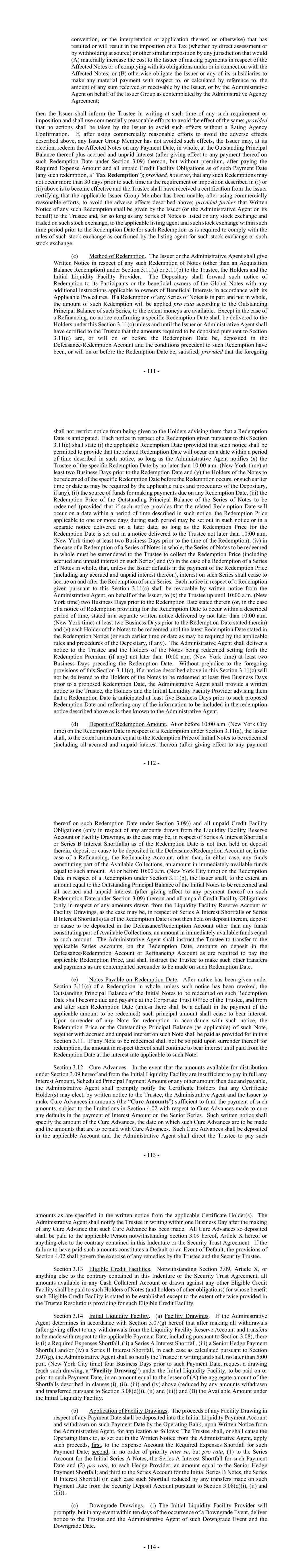 - 111 - convention, or the interpretation or application thereof, or otherwise) that has resulted or will result in the imposition of a Tax (whether by direct assessment or by withholding at source) or other similar imposition by any jurisdiction that would (A) materially increase the cost to the Issuer of making payments in respect of the Affected Notes or of complying with its obligations under or in connection with the Affected Notes; or (B) otherwise obligate the Issuer or any of its subsidiaries to make any material payment with respect to, or calculated by reference to, the amount of any sum received or receivable by the Issuer, or by the Administrative Agent on behalf of the Issuer Group as contemplated by the Administrative Agency Agreement; then the Issuer shall inform the Trustee in writing at such time of any such requirement or imposition and shall use commercially reasonable efforts to avoid the effect of the same; provided that no actions shall be taken by the Issuer to avoid such effects without a Rating Agency Confirmation. If, after using commercially reasonable efforts to avoid the adverse effects described above, any Issuer Group Member has not avoided such effects, the Issuer may, at its election, redeem the Affected Notes on any Payment Date, in whole, at the Outstanding Principal Balance thereof plus accrued and unpaid interest (after giving effect to any payment thereof on such Redemption Date under Section 3.09) thereon, but without premium, after paying the Required Expense Amount and all unpaid Credit Facility Obligations as of such Payment Date (any such redemption, a “Tax Redemption”); provided, however, that any such Redemptions may not occur more than 30 days prior to such time as the requirement or imposition described in (i) or (ii) above is to become effective and the Trustee shall have received a certification from the Issuer certifying that the applicable Issuer Group Member has been unable, after using commercially reasonable efforts, to avoid the adverse effects described above; provided further that Written Notice of any such Redemption shall be given by the Issuer (or the Administrative Agent on its behalf) to the Trustee and, for so long as any Series of Notes is listed on any stock exchange and traded on such stock exchange, to the applicable listing agent and such stock exchange within such time period prior to the Redemption Date for such Redemption as is required to comply with the rules of such stock exchange as confirmed by the listing agent for such stock exchange or such stock exchange. (c) Method of Redemption. The Issuer or the Administrative Agent shall give Written Notice in respect of any such Redemption of Notes (other than an Acquisition Balance Redemption) under Section 3.11(a) or 3.11(b) to the Trustee, the Holders and the Initial Liquidity Facility Provider. The Depositary shall forward such notice of Redemption to its Participants or the beneficial owners of the Global Notes with any additional instructions applicable to owners of Beneficial Interests in accordance with its Applicable Procedures. If a Redemption of any Series of Notes is in part and not in whole, the amount of such Redemption will be applied pro rata according to the Outstanding Principal Balance of such Series, to the extent moneys are available. Except in the case of a Refinancing, no notice confirming a specific Redemption Date shall be delivered to the Holders under this Section 3.11(c) unless and until the Issuer or Administrative Agent shall have certified to the Trustee that the amounts required to be deposited pursuant to Section 3.11(d) are, or will on or before the Redemption Date be, deposited in the Defeasance/Redemption Account and the conditions precedent to such Redemption have been, or will on or before the Redemption Date be, satisfied; provided that the foregoing - 112 - shall not restrict notice from being given to the Holders advising them that a Redemption Date is anticipated. Each notice in respect of a Redemption given pursuant to this Section 3.11(c) shall state (i) the applicable Redemption Date (provided that such notice shall be permitted to provide that the related Redemption Date will occur on a date within a period of time described in such notice, so long as the Administrative Agent notifies (x) the Trustee of the specific Redemption Date by no later than 10:00 a.m. (New York time) at least two Business Days prior to the Redemption Date and (y) the Holders of the Notes to be redeemed of the specific Redemption Date before the Redemption occurs, or such earlier time or date as may be required by the applicable rules and procedures of the Depositary, if any), (ii) the source of funds for making payments due on any Redemption Date, (iii) the Redemption Price of the Outstanding Principal Balance of the Series of Notes to be redeemed (provided that if such notice provides that the related Redemption Date will occur on a date within a period of time described in such notice, the Redemption Price applicable to one or more days during such period may be set out in such notice or in a separate notice delivered on a later date, so long as the Redemption Price for the Redemption Date is set out in a notice delivered to the Trustee not later than 10:00 a.m. (New York time) at least two Business Days prior to the time of the Redemption), (iv) in the case of a Redemption of a Series of Notes in whole, the Series of Notes to be redeemed in whole must be surrendered to the Trustee to collect the Redemption Price (including accrued and unpaid interest on such Series) and (v) in the case of a Redemption of a Series of Notes in whole, that, unless the Issuer defaults in the payment of the Redemption Price (including any accrued and unpaid interest thereon), interest on such Series shall cease to accrue on and after the Redemption of such Series. Each notice in respect of a Redemption given pursuant to this Section 3.11(c) shall be revocable by wri