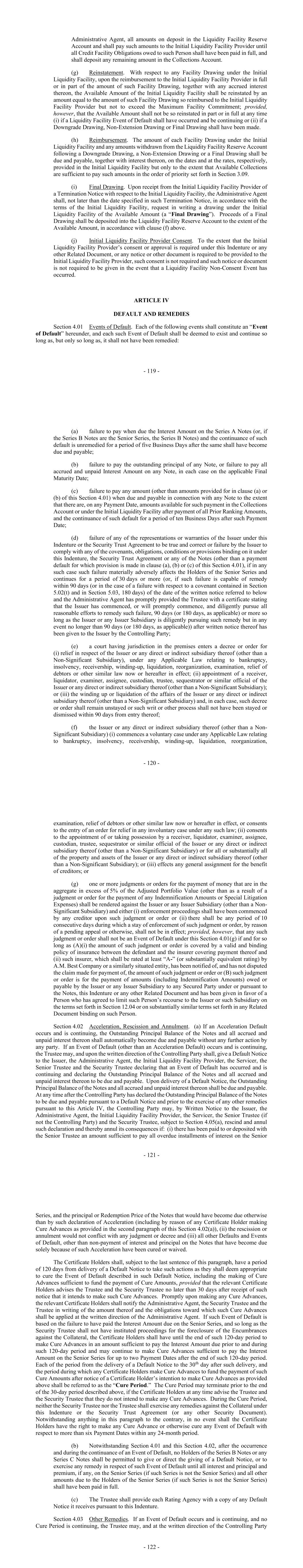 - 119 - Administrative Agent, all amounts on deposit in the Liquidity Facility Reserve Account and shall pay such amounts to the Initial Liquidity Facility Provider until all Credit Facility Obligations owed to such Person shall have been paid in full, and shall deposit any remaining amount in the Collections Account. (g) Reinstatement. With respect to any Facility Drawing under the Initial Liquidity Facility, upon the reimbursement to the Initial Liquidity Facility Provider in full or in part of the amount of such Facility Drawing, together with any accrued interest thereon, the Available Amount of the Initial Liquidity Facility shall be reinstated by an amount equal to the amount of such Facility Drawing so reimbursed to the Initial Liquidity Facility Provider but not to exceed the Maximum Facility Commitment; provided, however, that the Available Amount shall not be so reinstated in part or in full at any time (i) if a Liquidity Facility Event of Default shall have occurred and be continuing or (ii) if a Downgrade Drawing, Non-Extension Drawing or Final Drawing shall have been made. (h) Reimbursement. The amount of each Facility Drawing under the Initial Liquidity Facility and any amounts withdrawn from the Liquidity Facility Reserve Account following a Downgrade Drawing, a Non-Extension Drawing or a Final Drawing shall be due and payable, together with interest thereon, on the dates and at the rates, respectively, provided in the Initial Liquidity Facility but only to the extent that Available Collections are sufficient to pay such amounts in the order of priority set forth in Section 3.09. (i) Final Drawing. Upon receipt from the Initial Liquidity Facility Provider of a Termination Notice with respect to the Initial Liquidity Facility, the Administrative Agent shall, not later than the date specified in such Termination Notice, in accordance with the terms of the Initial Liquidity Facility, request in writing a drawing under the Initial Liquidity Facility of the Available Amount (a “Final Drawing”). Proceeds of a Final Drawing shall be deposited into the Liquidity Facility Reserve Account to the extent of the Available Amount, in accordance with clause (f) above. (j) Initial Liquidity Facility Provider Consent. To the extent that the Initial Liquidity Facility Provider’s consent or approval is required under this Indenture or any other Related Document, or any notice or other document is required to be provided to the Initial Liquidity Facility Provider, such consent is not required and such notice or document is not required to be given in the event that a Liquidity Facility Non-Consent Event has occurred. ARTICLE IV DEFAULT AND REMEDIES Section 4.01 Events of Default. Each of the following events shall constitute an “Event of Default” hereunder, and each such Event of Default shall be deemed to exist and continue so long as, but only so long as, it shall not have been remedied: - 120 - (a) failure to pay when due the Interest Amount on the Series A Notes (or, if the Series B Notes are the Senior Series, the Series B Notes) and the continuance of such default is unremedied for a period of five Business Days after the same shall have become due and payable; (b) failure to pay the outstanding principal of any Note, or failure to pay all accrued and unpaid Interest Amount on any Note, in each case on the applicable Final Maturity Date; (c) failure to pay any amount (other than amounts provided for in clause (a) or (b) of this Section 4.01) when due and payable in connection with any Note to the extent that there are, on any Payment Date, amounts available for such payment in the Collections Account or under the Initial Liquidity Facility after payment of all Prior Ranking Amounts, and the continuance of such default for a period of ten Business Days after such Payment Date; (d) failure of any of the representations or warranties of the Issuer under this Indenture or the Security Trust Agreement to be true and correct or failure by the Issuer to comply with any of the covenants, obligations, conditions or provisions binding on it under this Indenture, the Security Trust Agreement or any of the Notes (other than a payment default for which provision is made in clause (a), (b) or (c) of this Section 4.01), if in any such case such failure materially adversely affects the Holders of the Senior Series and continues for a period of 30 days or more (or, if such failure is capable of remedy within 90 days (or in the case of a failure with respect to a covenant contained in Section 5.02(t) and in Section 5.03, 180 days) of the date of the written notice referred to below and the Administrative Agent has promptly provided the Trustee with a certificate stating that the Issuer has commenced, or will promptly commence, and diligently pursue all reasonable efforts to remedy such failure, 90 days (or 180 days, as applicable) or more so long as the Issuer or any Issuer Subsidiary is diligently pursuing such remedy but in any event no longer than 90 days (or 180 days, as applicable)) after written notice thereof has been given to the Issuer by the Controlling Party; (e) a court having jurisdiction in the premises enters a decree or order for (i) relief in respect of the Issuer or any direct or indirect subsidiary thereof (other than a Non-Significant Subsidiary), under any Applicable Law relating to bankruptcy, insolvency, receivership, winding-up, liquidation, reorganization, examination, relief of debtors or other similar law now or hereafter in effect; (ii) appointment of a receiver, liquidator, examiner, assignee, custodian, trustee, sequestrator or similar official of the Issuer or any direct or indirect subsidiary thereof (other than a Non-Significant Subsidiary); or (iii) the winding up or liquidation of the affairs of the Issuer or any direct or indirect subsidiary thereof (other than a Non-Significant Subsidiary) and, in each case, such decree or order shall remain unstayed or such