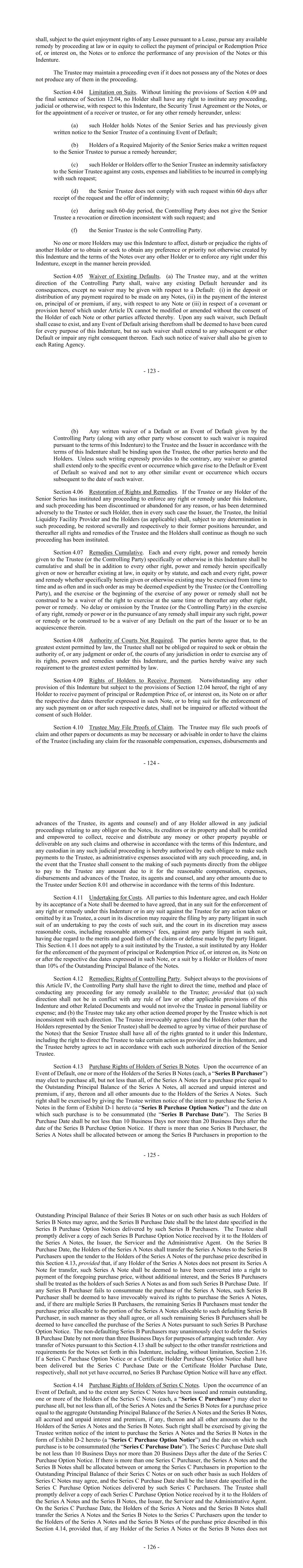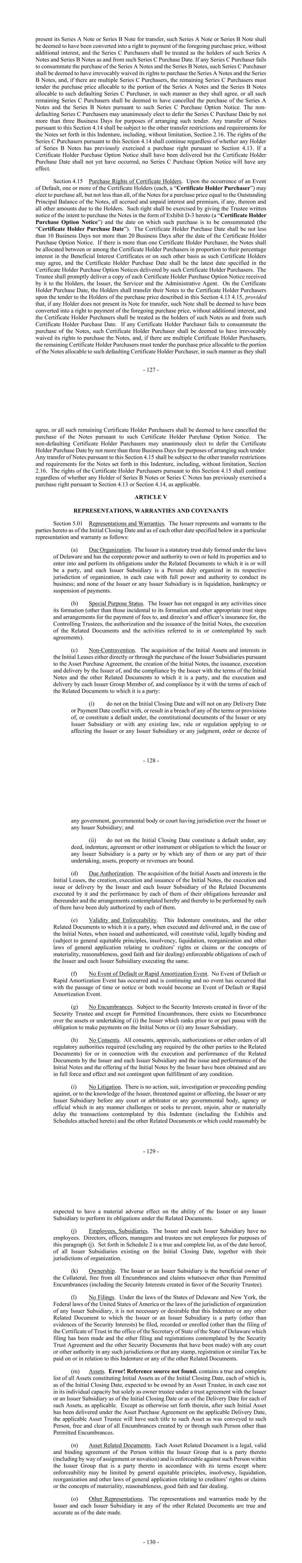 - 127 - present its Series A Note or Series B Note for transfer, such Series A Note or Series B Note shall be deemed to have been converted into a right to payment of the foregoing purchase price, without additional interest, and the Series C Purchasers shall be treated as the holders of such Series A Notes and Series B Notes as and from such Series C Purchase Date. If any Series C Purchaser fails to consummate the purchase of the Series A Notes and the Series B Notes, such Series C Purchaser shall be deemed to have irrevocably waived its rights to purchase the Series A Notes and the Series B Notes, and, if there are multiple Series C Purchasers, the remaining Series C Purchasers must tender the purchase price allocable to the portion of the Series A Notes and the Series B Notes allocable to such defaulting Series C Purchaser, in such manner as they shall agree, or all such remaining Series C Purchasers shall be deemed to have cancelled the purchase of the Series A Notes and the Series B Notes pursuant to such Series C Purchase Option Notice. The non- defaulting Series C Purchasers may unanimously elect to defer the Series C Purchase Date by not more than three Business Days for purposes of arranging such tender. Any transfer of Notes pursuant to this Section 4.14 shall be subject to the other transfer restrictions and requirements for the Notes set forth in this Indenture, including, without limitation, Section 2.16. The rights of the Series C Purchasers pursuant to this Section 4.14 shall continue regardless of whether any Holder of Series B Notes has previously exercised a purchase right pursuant to Section 4.13. If a Certificate Holder Purchase Option Notice shall have been delivered but the Certificate Holder Purchase Date shall not yet have occurred, no Series C Purchase Option Notice will have any effect. Section 4.15 Purchase Rights of Certificate Holders. Upon the occurrence of an Event of Default, one or more of the Certificate Holders (each, a “Certificate Holder Purchaser”) may elect to purchase all, but not less than all, of the Notes for a purchase price equal to the Outstanding Principal Balance of the Notes, all accrued and unpaid interest and premium, if any, thereon and all other amounts due to the Holders. Such right shall be exercised by giving the Trustee written notice of the intent to purchase the Notes in the form of Exhibit D-3 hereto (a “Certificate Holder Purchase Option Notice”) and the date on which such purchase is to be consummated (the “Certificate Holder Purchase Date”). The Certificate Holder Purchase Date shall be not less than 10 Business Days nor more than 20 Business Days after the date of the Certificate Holder Purchase Option Notice. If there is more than one Certificate Holder Purchaser, the Notes shall be allocated between or among the Certificate Holder Purchasers in proportion to their percentage interest in the Beneficial Interest Certificates or on such other basis as such Certificate Holders may agree, and the Certificate Holder Purchase Date shall be the latest date specified in the Certificate Holder Purchase Option Notices delivered by such Certificate Holder Purchasers. The Trustee shall promptly deliver a copy of each Certificate Holder Purchase Option Notice received by it to the Holders, the Issuer, the Servicer and the Administrative Agent. On the Certificate Holder Purchase Date, the Holders shall transfer their Notes to the Certificate Holder Purchasers upon the tender to the Holders of the purchase price described in this Section 4.13 4.15, provided that, if any Holder does not present its Note for transfer, such Note shall be deemed to have been converted into a right to payment of the foregoing purchase price, without additional interest, and the Certificate Holder Purchasers shall be treated as the holders of such Notes as and from such Certificate Holder Purchase Date. If any Certificate Holder Purchaser fails to consummate the purchase of the Notes, such Certificate Holder Purchaser shall be deemed to have irrevocably waived its rights to purchase the Notes, and, if there are multiple Certificate Holder Purchasers, the remaining Certificate Holder Purchasers must tender the purchase price allocable to the portion of the Notes allocable to such defaulting Certificate Holder Purchaser, in such manner as they shall - 128 - agree, or all such remaining Certificate Holder Purchasers shall be deemed to have cancelled the purchase of the Notes pursuant to such Certificate Holder Purchase Option Notice. The non-defaulting Certificate Holder Purchasers may unanimously elect to defer the Certificate Holder Purchase Date by not more than three Business Days for purposes of arranging such tender. Any transfer of Notes pursuant to this Section 4.15 shall be subject to the other transfer restrictions and requirements for the Notes set forth in this Indenture, including, without limitation, Section 2.16. The rights of the Certificate Holder Purchasers pursuant to this Section 4.15 shall continue regardless of whether any Holder of Series B Notes or Series C Notes has previously exercised a purchase right pursuant to Section 4.13 or Section 4.14, as applicable. ARTICLE V REPRESENTATIONS, WARRANTIES AND COVENANTS Section 5.01 Representations and Warranties. The Issuer represents and warrants to the parties hereto as of the Initial Closing Date and as of each other date specified below in a particular representation and warranty as follows: (a) Due Organization. The Issuer is a statutory trust duly formed under the laws of Delaware and has the corporate power and authority to own or hold its properties and to enter into and perform its obligations under the Related Documents to which it is or will be a party, and each Issuer Subsidiary is a Person duly organized in its respective jurisdiction of organization, in each case with full power and authority to conduct its business; and none of the Issuer or any Issuer Subsidiary is in li