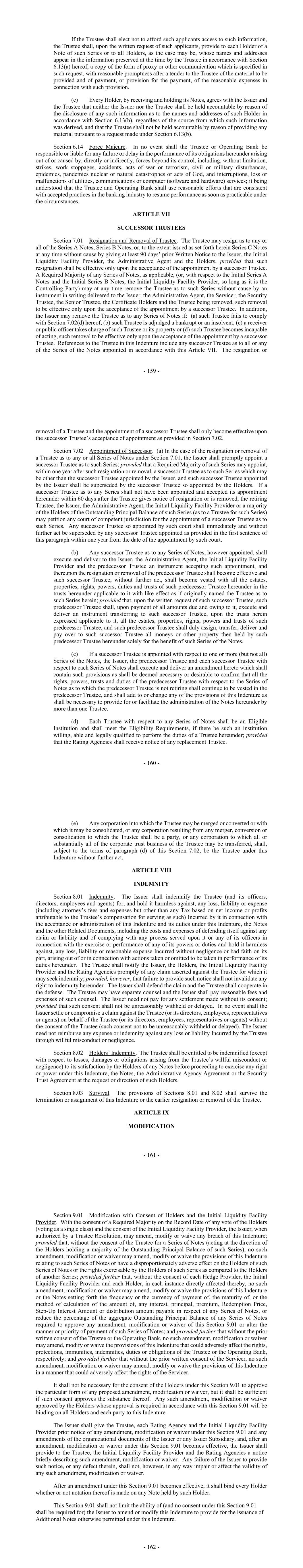 - 159 - If the Trustee shall elect not to afford such applicants access to such information, the Trustee shall, upon the written request of such applicants, provide to each Holder of a Note of such Series or to all Holders, as the case may be, whose names and addresses appear in the information preserved at the time by the Trustee in accordance with Section 6.13(a) hereof, a copy of the form of proxy or other communication which is specified in such request, with reasonable promptness after a tender to the Trustee of the material to be provided and of payment, or provision for the payment, of the reasonable expenses in connection with such provision. (c) Every Holder, by receiving and holding its Notes, agrees with the Issuer and the Trustee that neither the Issuer nor the Trustee shall be held accountable by reason of the disclosure of any such information as to the names and addresses of such Holder in accordance with Section 6.13(b), regardless of the source from which such information was derived, and that the Trustee shall not be held accountable by reason of providing any material pursuant to a request made under Section 6.13(b). Section 6.14 Force Majeure. In no event shall the Trustee or Operating Bank be responsible or liable for any failure or delay in the performance of its obligations hereunder arising out of or caused by, directly or indirectly, forces beyond its control, including, without limitation, strikes, work stoppages, accidents, acts of war or terrorism, civil or military disturbances, epidemics, pandemics nuclear or natural catastrophes or acts of God, and interruptions, loss or malfunctions of utilities, communications or computer (software and hardware) services; it being understood that the Trustee and Operating Bank shall use reasonable efforts that are consistent with accepted practices in the banking industry to resume performance as soon as practicable under the circumstances. ARTICLE VII SUCCESSOR TRUSTEES Section 7.01 Resignation and Removal of Trustee. The Trustee may resign as to any or all of the Series A Notes, Series B Notes, or, to the extent issued as set forth herein Series C Notes at any time without cause by giving at least 90 days’ prior Written Notice to the Issuer, the Initial Liquidity Facility Provider, the Administrative Agent and the Holders, provided that such resignation shall be effective only upon the acceptance of the appointment by a successor Trustee. A Required Majority of any Series of Notes, as applicable, (or, with respect to the Initial Series A Notes and the Initial Series B Notes, the Initial Liquidity Facility Provider, so long as it is the Controlling Party) may at any time remove the Trustee as to such Series without cause by an instrument in writing delivered to the Issuer, the Administrative Agent, the Servicer, the Security Trustee, the Senior Trustee, the Certificate Holders and the Trustee being removed, such removal to be effective only upon the acceptance of the appointment by a successor Trustee. In addition, the Issuer may remove the Trustee as to any Series of Notes if: (a) such Trustee fails to comply with Section 7.02(d) hereof, (b) such Trustee is adjudged a bankrupt or an insolvent, (c) a receiver or public officer takes charge of such Trustee or its property or (d) such Trustee becomes incapable of acting, such removal to be effective only upon the acceptance of the appointment by a successor Trustee. References to the Trustee in this Indenture include any successor Trustee as to all or any of the Series of the Notes appointed in accordance with this Article VII. The resignation or - 160 - removal of a Trustee and the appointment of a successor Trustee shall only become effective upon the successor Trustee’s acceptance of appointment as provided in Section 7.02. Section 7.02 Appointment of Successor. (a) In the case of the resignation or removal of a Trustee as to any or all Series of Notes under Section 7.01, the Issuer shall promptly appoint a successor Trustee as to such Series; provided that a Required Majority of such Series may appoint, within one year after such resignation or removal, a successor Trustee as to such Series which may be other than the successor Trustee appointed by the Issuer, and such successor Trustee appointed by the Issuer shall be superseded by the successor Trustee so appointed by the Holders. If a successor Trustee as to any Series shall not have been appointed and accepted its appointment hereunder within 60 days after the Trustee gives notice of resignation or is removed, the retiring Trustee, the Issuer, the Administrative Agent, the Initial Liquidity Facility Provider or a majority of the Holders of the Outstanding Principal Balance of such Series (as to a Trustee for such Series) may petition any court of competent jurisdiction for the appointment of a successor Trustee as to such Series. Any successor Trustee so appointed by such court shall immediately and without further act be superseded by any successor Trustee appointed as provided in the first sentence of this paragraph within one year from the date of the appointment by such court. (b) Any successor Trustee as to any Series of Notes, however appointed, shall execute and deliver to the Issuer, the Administrative Agent, the Initial Liquidity Facility Provider and the predecessor Trustee an instrument accepting such appointment, and thereupon the resignation or removal of the predecessor Trustee shall become effective and such successor Trustee, without further act, shall become vested with all the estates, properties, rights, powers, duties and trusts of such predecessor Trustee hereunder in the trusts hereunder applicable to it with like effect as if originally named the Trustee as to such Series herein; provided that, upon the written request of such successor Trustee, such predecessor Trustee shall, upon payment of all amounts due and owing to it, execute and deliver an instrument transferring to such successor