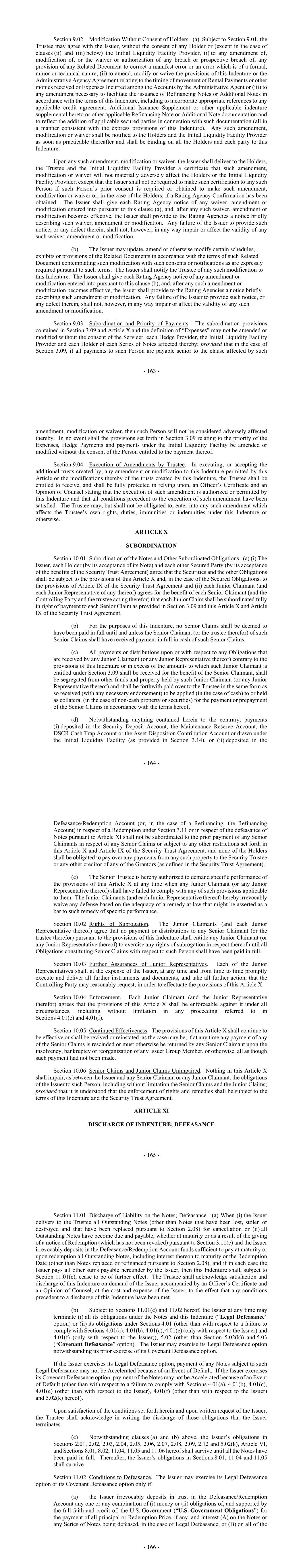 - 163 - Section 9.02 Modification Without Consent of Holders. (a) Subject to Section 9.01, the Trustee may agree with the Issuer, without the consent of any Holder or (except in the case of clauses (ii) and (iii) below) the Initial Liquidity Facility Provider, (i) to any amendment of, modification of, or the waiver or authorization of any breach or prospective breach of, any provision of any Related Document to correct a manifest error or an error which is of a formal, minor or technical nature, (ii) to amend, modify or waive the provisions of this Indenture or the Administrative Agency Agreement relating to the timing of movement of Rental Payments or other monies received or Expenses Incurred among the Accounts by the Administrative Agent or (iii) to any amendment necessary to facilitate the issuance of Refinancing Notes or Additional Notes in accordance with the terms of this Indenture, including to incorporate appropriate references to any applicable credit agreement, Additional Issuance Supplement or other applicable indenture supplemental hereto or other applicable Refinancing Note or Additional Note documentation and to reflect the addition of applicable secured parties in connection with such documentation (all in a manner consistent with the express provisions of this Indenture). Any such amendment, modification or waiver shall be notified to the Holders and the Initial Liquidity Facility Provider as soon as practicable thereafter and shall be binding on all the Holders and each party to this Indenture. Upon any such amendment, modification or waiver, the Issuer shall deliver to the Holders, the Trustee and the Initial Liquidity Facility Provider a certificate that such amendment, modification or waiver will not materially adversely affect the Holders or the Initial Liquidity Facility Provider, except that the Issuer shall not be required to make such certification to any such Person if such Person’s prior consent is required or obtained to make such amendment, modification or waiver or, in the case of the Holders, if a Rating Agency Confirmation has been obtained. The Issuer shall give each Rating Agency notice of any waiver, amendment or modification entered into pursuant to this clause (a), and, after any such waiver, amendment or modification becomes effective, the Issuer shall provide to the Rating Agencies a notice briefly describing such waiver, amendment or modification. Any failure of the Issuer to provide such notice, or any defect therein, shall not, however, in any way impair or affect the validity of any such waiver, amendment or modification. (b) The Issuer may update, amend or otherwise modify certain schedules, exhibits or provisions of the Related Documents in accordance with the terms of such Related Document contemplating such modification with such consents or notifications as are expressly required pursuant to such terms. The Issuer shall notify the Trustee of any such modification to this Indenture. The Issuer shall give each Rating Agency notice of any amendment or modification entered into pursuant to this clause (b), and, after any such amendment or modification becomes effective, the Issuer shall provide to the Rating Agencies a notice briefly describing such amendment or modification. Any failure of the Issuer to provide such notice, or any defect therein, shall not, however, in any way impair or affect the validity of any such amendment or modification. Section 9.03 Subordination and Priority of Payments. The subordination provisions contained in Section 3.09 and Article X and the definition of “Expenses” may not be amended or modified without the consent of the Servicer, each Hedge Provider, the Initial Liquidity Facility Provider and each Holder of each Series of Notes affected thereby; provided that in the case of Section 3.09, if all payments to such Person are payable senior to the clause affected by such - 164 - amendment, modification or waiver, then such Person will not be considered adversely affected thereby. In no event shall the provisions set forth in Section 3.09 relating to the priority of the Expenses, Hedge Payments and payments under the Initial Liquidity Facility be amended or modified without the consent of the Person entitled to the payment thereof. Section 9.04 Execution of Amendments by Trustee. In executing, or accepting the additional trusts created by, any amendment or modification to this Indenture permitted by this Article or the modifications thereby of the trusts created by this Indenture, the Trustee shall be entitled to receive, and shall be fully protected in relying upon, an Officer’s Certificate and an Opinion of Counsel stating that the execution of such amendment is authorized or permitted by this Indenture and that all conditions precedent to the execution of such amendment have been satisfied. The Trustee may, but shall not be obligated to, enter into any such amendment which affects the Trustee’s own rights, duties, immunities or indemnities under this Indenture or otherwise. ARTICLE X SUBORDINATION Section 10.01 Subordination of the Notes and Other Subordinated Obligations. (a) (i) The Issuer, each Holder (by its acceptance of its Note) and each other Secured Party (by its acceptance of the benefits of the Security Trust Agreement) agree that the Securities and the other Obligations shall be subject to the provisions of this Article X and, in the case of the Secured Obligations, to the provisions of Article IX of the Security Trust Agreement and (ii) each Junior Claimant (and each Junior Representative of any thereof) agrees for the benefit of each Senior Claimant (and the Controlling Party and the trustee acting therefor) that each Junior Claim shall be subordinated fully in right of payment to each Senior Claim as provided in Section 3.09 and this Article X and Article IX of the Security Trust Agreement. (b) For the purposes of this Indenture, no Senior Claims shall be deemed to have been paid in fu