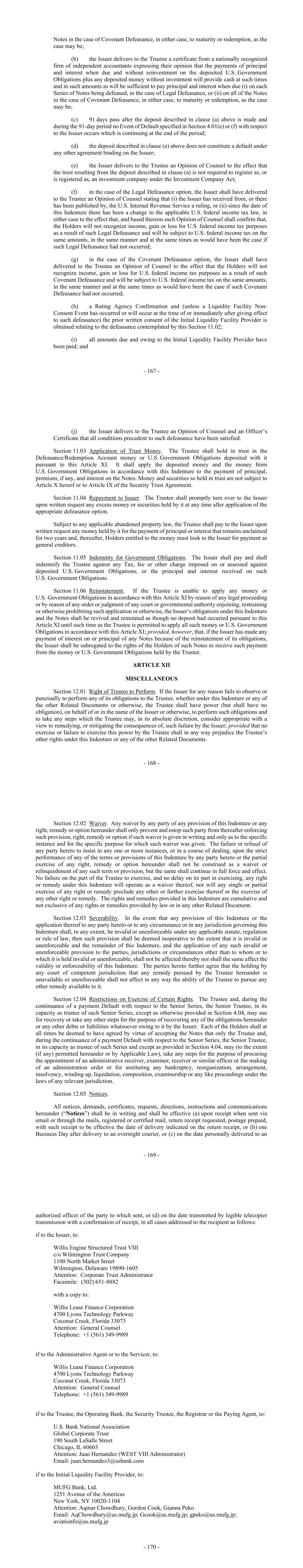 - iv – Section 11.03 Application of Trust Money .................................................................... 168 Section 11.04 Repayment to Issuer ................................................................................ 168 Section 11.05 Indemnity for Government Obligations .................................................. 168 Section 11.06 Reinstatement .......................................................................................... 168 ARTICLE XII MISCELLANEOUS ........................................................................................... 168 Section 12.01 Right of Trustee to Perform .................................................................... 168 Section 12.02 Waiver ..................................................................................................... 169 Section 12.03 Severability ............................................................................................. 169 Section 12.04 Restrictions on Exercise of Certain Rights ............................................. 169 Section 12.05 Notices .................................................................................................... 169 Section 12.06 Assignments; Third Party Beneficiary .................................................... 171 Section 12.07 Currency Conversion .............................................................................. 172 Section 12.08 Application to Court ............................................................................... 172 Section 12.09 Governing Law ....................................................................................... 173 Section 12.10 Jurisdiction .............................................................................................. 173 Section 12.11 Counterparts; Electronic Execution ........................................................ 174 Section 12.12 Table of Contents, Headings, Etc ........................................................... 174 Section 12.13 Compliance with Applicable Regulations .............................................. 174 Section 12.14 Limited Recourse .................................................................................... 174 Section 12.15 Contractual Recognition of Bail-In ......................................................... 175 - v – Schedules Schedule 1 – Initial Assets Schedule 2 – Issuer Subsidiaries Schedule 3 – Asset Subsidiaries Schedule 4 – Asset Trust Agreements Schedule 5 – Scheduled Series Percentage Schedule 6 – Maintenance Reduction Amount Exhibits Exhibit A-1 – Form of Series A Note Exhibit A-2 – Form of Series B Note Exhibit A-3 – Form of Series C Note Exhibit B – Concentration Limits Exhibit C – Insurance Provisions Exhibit D-1 – Form of Series B Purchase Option Notice Exhibit D-2 – Form of Series C Purchase Option Notice Exhibit D-3 – Form of Certificate Holder Purchase Option Notice Exhibit E-1 – Form of Monthly Report to Each Holder Exhibit E-2 – Annual Report to Each Holder Exhibit F – Form of Certificate of Transfer Exhibit G – Core Lease Provisions Exhibit H – Form of Compliance Certificate - 1 - This TRUST INDENTURE, dated as of June 18, 2025 (this “Indenture”), is made among WILLIS ENGINE STRUCTURED TRUST VIII (the “Issuer”), U.S. BANK NATIONAL ASSOCIATION, a national banking association, as the Trustee and Operating Bank, WILLIS LEASE FINANCE CORPORATION, in its capacity as Administrative Agent, and MUFG BANK, LTD., (“MUFG”), as the Initial Liquidity Facility Provider. For the consideration set forth herein and other good and valuable consideration, the adequacy, receipt and sufficiency of which are hereby acknowledged, each of the parties hereto hereby agree as follows: ARTICLE I DEFINITIONS Section 1.01 Definitions. For purposes of this Indenture, the following terms have the meanings indicated below: “Accelerated” has a meaning correlative to the meaning of Acceleration. “Acceleration” means, with respect to the principal, interest and other amounts payable in respect of the Notes, such amounts becoming immediately due and payable by declaration or otherwise. “Acceleration Default” means any Event of Default of the type described in Section 4.01(e) or 4.01(f). “Account” means any or, in its plural form, all of the accounts established pursuant to Section 3.01(a) and any ledger accounts and ledger subaccounts maintained therein in accordance with this Indenture. “Acquisition Agreement” means the Asset Purchase Agreement and any acquisition agreement pursuant to which one or more Replacement Assets (or related Asset Interests) are acquired. “Acquisition Balance Redemption” has the meaning given to such term in Section 3.11(a). “Act” has, with respect to any Holder, the meaning given to such term in Section 1.04(a). “Additional Advances” means the proceeds of the issuance of Additional Certificates. “Additional Certificates” means any Beneficial Interest Certificates issued pursuant to the Trust Agreement, the proceeds of which are used, in substantial part, to fund (a) the cost of Discretionary Asset Modifications, other Asset modifications (including cargo conversions in respect of an Asset that is an Airframe) and maintenance on an Asset; (b) an increase in the amount on deposit in the Asset Disposition Contribution Account, (c) the Redemption of a Series of Notes in accordance with Section 3.11, or (d) additional amounts to be included in the Net Sale Proceeds in respect of any Asset Disposition. - 2 - “Additional Issuance” has the meaning given to such term in Section 2.10(a). “Additional Issuance Supplement” means an amendment or indenture supplement, or Trustee Resolution referred to in Section 2.10, providing for the issuance of Refinancing Notes or Additional Notes. “Additional Lease” means, with respect to each Asset other than an Initial Asset, each lease agreement, conditional sale a