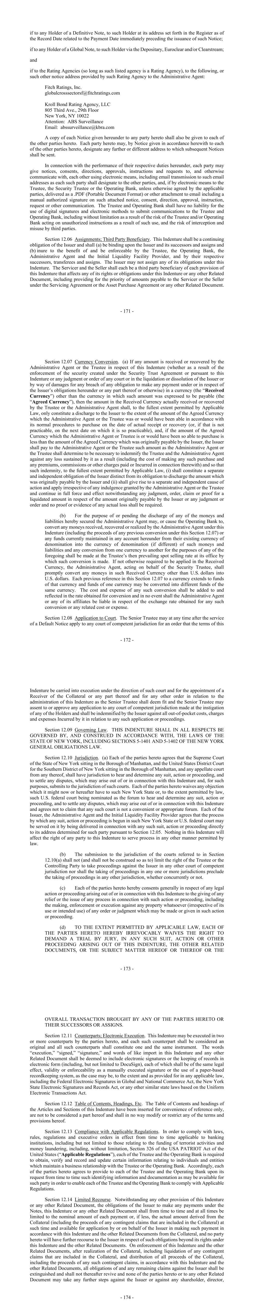 - 171 - if to any Holder of a Definitive Note, to such Holder at its address set forth in the Register as of the Record Date related to the Payment Date immediately preceding the issuance of such Notice; if to any Holder of a Global Note, to such Holder via the Depositary, Euroclear and/or Clearstream; and if to the Rating Agencies (so long as such listed agency is a Rating Agency), to the following, or such other notice address provided by such Rating Agency to the Administrative Agent: Fitch Ratings, Inc. globalcrosssectorsf@fitchratings.com Kroll Bond Rating Agency, LLC 805 Third Ave., 29th Floor New York, NY 10022 Attention: ABS Surveillance Email: abssurveillance@kbra.com A copy of each Notice given hereunder to any party hereto shall also be given to each of the other parties hereto. Each party hereto may, by Notice given in accordance herewith to each of the other parties hereto, designate any further or different address to which subsequent Notices shall be sent. In connection with the performance of their respective duties hereunder, each party may give notices, consents, directions, approvals, instructions and requests to, and otherwise communicate with, each other using electronic means, including email transmission to such email addresses as each such party shall designate to the other parties, and, if by electronic means to the Trustee, the Security Trustee or the Operating Bank, unless otherwise agreed by the applicable parties, delivered as a .PDF (Portable Document Format) or other attachment to email including a manual authorized signature on such attached notice, consent, direction, approval, instruction, request or other communication. The Trustee and Operating Bank shall have no liability for the use of digital signatures and electronic methods to submit communications to the Trustee and Operating Bank, including without limitation as a result of the risk of the Trustee and/or Operating Bank acting on unauthorized instructions as a result of such use, and the risk of interception and misuse by third parties. Section 12.06 Assignments; Third Party Beneficiary. This Indenture shall be a continuing obligation of the Issuer and shall (a) be binding upon the Issuer and its successors and assigns and (b) inure to the benefit of and be enforceable by the Trustee, the Operating Bank, the Administrative Agent and the Initial Liquidity Facility Provider, and by their respective successors, transferees and assigns. The Issuer may not assign any of its obligations under this Indenture. The Servicer and the Seller shall each be a third party beneficiary of each provision of this Indenture that affects any of its rights or obligations under this Indenture or any other Related Document, including providing for the priority of amounts payable to the Servicer or the Seller under the Servicing Agreement or the Asset Purchase Agreement or any other Related Document. - 172 - Section 12.07 Currency Conversion. (a) If any amount is received or recovered by the Administrative Agent or the Trustee in respect of this Indenture (whether as a result of the enforcement of the security created under the Security Trust Agreement or pursuant to this Indenture or any judgment or order of any court or in the liquidation or dissolution of the Issuer or by way of damages for any breach of any obligation to make any payment under or in respect of the Issuer’s obligations hereunder or any part thereof or otherwise) in a currency (the “Received Currency”) other than the currency in which such amount was expressed to be payable (the “Agreed Currency”), then the amount in the Received Currency actually received or recovered by the Trustee or the Administrative Agent shall, to the fullest extent permitted by Applicable Law, only constitute a discharge to the Issuer to the extent of the amount of the Agreed Currency which the Administrative Agent or the Trustee was or would have been able in accordance with its normal procedures to purchase on the date of actual receipt or recovery (or, if that is not practicable, on the next date on which it is so practicable), and, if the amount of the Agreed Currency which the Administrative Agent or Trustee is or would have been so able to purchase is less than the amount of the Agreed Currency which was originally payable by the Issuer, the Issuer shall pay to the Administrative Agent or the Trustee such amount as the Administrative Agent or the Trustee shall determine to be necessary to indemnify the Trustee and the Administrative Agent against any loss sustained by it as a result (including the cost of making any such purchase and any premiums, commissions or other charges paid or Incurred in connection therewith) and so that such indemnity, to the fullest extent permitted by Applicable Law, (i) shall constitute a separate and independent obligation of the Issuer distinct from its obligation to discharge the amount which was originally payable by the Issuer and (ii) shall give rise to a separate and independent cause of action and apply irrespective of any indulgence granted by the Administrative Agent or the Trustee and continue in full force and effect notwithstanding any judgment, order, claim or proof for a liquidated amount in respect of the amount originally payable by the Issuer or any judgment or order and no proof or evidence of any actual loss shall be required. (b) For the purpose of or pending the discharge of any of the moneys and liabilities hereby secured the Administrative Agent may, or cause the Operating Bank to, convert any moneys received, recovered or realized by the Administrative Agent under this Indenture (including the proceeds of any previous conversion under this Section 12.07) or any funds currently maintained in any account hereunder from their existing currency of denomination into the currency of denomination (if different) of such moneys and liabilities and any conversion from one currency to another for the purposes of any of 