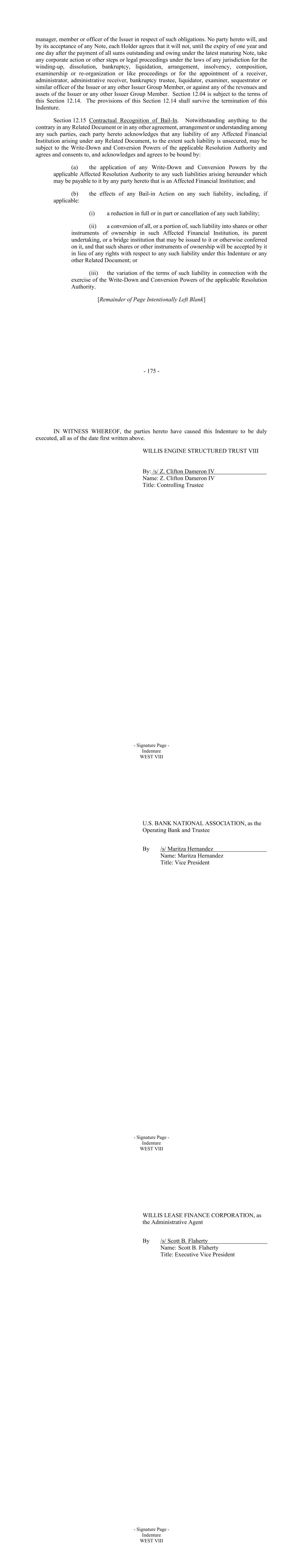 - 175 - manager, member or officer of the Issuer in respect of such obligations. No party hereto will, and by its acceptance of any Note, each Holder agrees that it will not, until the expiry of one year and one day after the payment of all sums outstanding and owing under the latest maturing Note, take any corporate action or other steps or legal proceedings under the laws of any jurisdiction for the winding-up, dissolution, bankruptcy, liquidation, arrangement, insolvency, composition, examinership or re-organization or like proceedings or for the appointment of a receiver, administrator, administrative receiver, bankruptcy trustee, liquidator, examiner, sequestrator or similar officer of the Issuer or any other Issuer Group Member, or against any of the revenues and assets of the Issuer or any other Issuer Group Member. Section 12.04 is subject to the terms of this Section 12.14. The provisions of this Section 12.14 shall survive the termination of this Indenture. Section 12.15 Contractual Recognition of Bail-In. Notwithstanding anything to the contrary in any Related Document or in any other agreement, arrangement or understanding among any such parties, each party hereto acknowledges that any liability of any Affected Financial Institution arising under any Related Document, to the extent such liability is unsecured, may be subject to the Write-Down and Conversion Powers of the applicable Resolution Authority and agrees and consents to, and acknowledges and agrees to be bound by: (a) the application of any Write-Down and Conversion Powers by the applicable Affected Resolution Authority to any such liabilities arising hereunder which may be payable to it by any party hereto that is an Affected Financial Institution; and (b) the effects of any Bail-in Action on any such liability, including, if applicable: (i) a reduction in full or in part or cancellation of any such liability; (ii) a conversion of all, or a portion of, such liability into shares or other instruments of ownership in such Affected Financial Institution, its parent undertaking, or a bridge institution that may be issued to it or otherwise conferred on it, and that such shares or other instruments of ownership will be accepted by it in lieu of any rights with respect to any such liability under this Indenture or any other Related Document; or (iii) the variation of the terms of such liability in connection with the exercise of the Write-Down and Conversion Powers of the applicable Resolution Authority. [Remainder of Page Intentionally Left Blank] - Signature Page - Indenture WEST VIII IN WITNESS WHEREOF, the parties hereto have caused this Indenture to be duly executed, all as of the date first written above. WILLIS ENGINE STRUCTURED TRUST VIII By: /s/ Z. Clifton Dameron IV Name: Z. Clifton Dameron IV Title: Controlling Trustee - Signature Page - Indenture WEST VIII U.S. BANK NATIONAL ASSOCIATION, as the Operating Bank and Trustee By /s/ Maritza Hernandez Name: Maritza Hernandez Title: Vice President - Signature Page - Indenture WEST VIII WILLIS LEASE FINANCE CORPORATION, as the Administrative Agent By /s/ Scott B. Flaherty Name: Scott B. Flaherty Title: Executive Vice President