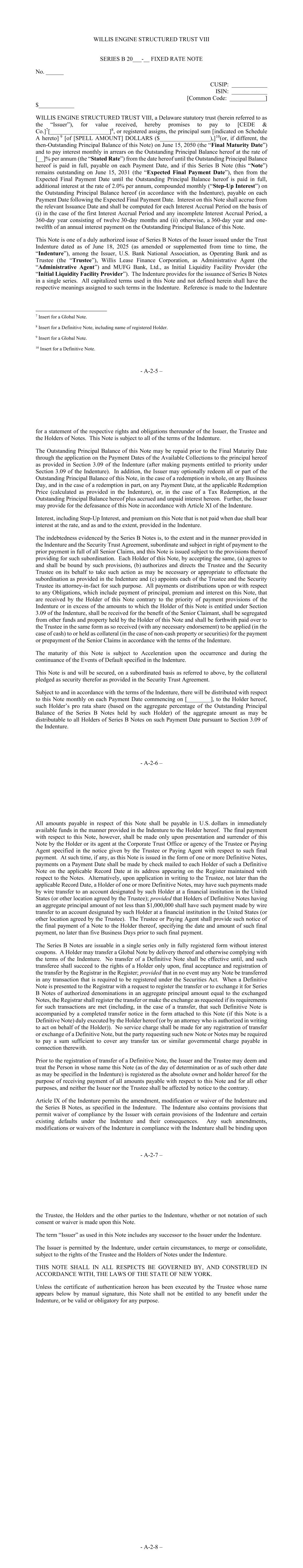 - A-2-5 – WILLIS ENGINE STRUCTURED TRUST VIII SERIES B 20___-__ FIXED RATE NOTE No. ______ CUSIP: ____________ ISIN: ____________ [Common Code: ____________] $____________ WILLIS ENGINE STRUCTURED TRUST VIII, a Delaware statutory trust (herein referred to as the “Issuer”), for value received, hereby promises to pay to [CEDE & Co.]7[____________________]8, or registered assigns, the principal sum [indicated on Schedule A hereto] 9 [of [SPELL AMOUNT] DOLLARS ($_________________),]10(or, if different, the then-Outstanding Principal Balance of this Note) on June 15, 2050 (the “Final Maturity Date”) and to pay interest monthly in arrears on the Outstanding Principal Balance hereof at the rate of [__]% per annum (the “Stated Rate”) from the date hereof until the Outstanding Principal Balance hereof is paid in full, payable on each Payment Date, and if this Series B Note (this “Note”) remains outstanding on June 15, 2031 (the “Expected Final Payment Date”), then from the Expected Final Payment Date until the Outstanding Principal Balance hereof is paid in full, additional interest at the rate of 2.0% per annum, compounded monthly (“Step-Up Interest”) on the Outstanding Principal Balance hereof (in accordance with the Indenture), payable on each Payment Date following the Expected Final Payment Date. Interest on this Note shall accrue from the relevant Issuance Date and shall be computed for each Interest Accrual Period on the basis of (i) in the case of the first Interest Accrual Period and any incomplete Interest Accrual Period, a 360-day year consisting of twelve 30-day months and (ii) otherwise, a 360-day year and one- twelfth of an annual interest payment on the Outstanding Principal Balance of this Note. This Note is one of a duly authorized issue of Series B Notes of the Issuer issued under the Trust Indenture dated as of June 18, 2025 (as amended or supplemented from time to time, the “Indenture”), among the Issuer, U.S. Bank National Association, as Operating Bank and as Trustee (the “Trustee”), Willis Lease Finance Corporation, as Administrative Agent (the “Administrative Agent”) and MUFG Bank, Ltd., as Initial Liquidity Facility Provider (the “Initial Liquidity Facility Provider”). The Indenture provides for the issuance of Series B Notes in a single series. All capitalized terms used in this Note and not defined herein shall have the respective meanings assigned to such terms in the Indenture. Reference is made to the Indenture 7 Insert for a Global Note. 8 Insert for a Definitive Note, including name of registered Holder. 9 Insert for a Global Note. 10 Insert for a Definitive Note. - A-2-6 – for a statement of the respective rights and obligations thereunder of the Issuer, the Trustee and the Holders of Notes. This Note is subject to all of the terms of the Indenture. The Outstanding Principal Balance of this Note may be repaid prior to the Final Maturity Date through the application on the Payment Dates of the Available Collections to the principal hereof as provided in Section 3.09 of the Indenture (after making payments entitled to priority under Section 3.09 of the Indenture). In addition, the Issuer may optionally redeem all or part of the Outstanding Principal Balance of this Note, in the case of a redemption in whole, on any Business Day, and in the case of a redemption in part, on any Payment Date, at the applicable Redemption Price (calculated as provided in the Indenture), or, in the case of a Tax Redemption, at the Outstanding Principal Balance hereof plus accrued and unpaid interest hereon. Further, the Issuer may provide for the defeasance of this Note in accordance with Article XI of the Indenture. Interest, including Step-Up Interest, and premium on this Note that is not paid when due shall bear interest at the rate, and as and to the extent, provided in the Indenture. The indebtedness evidenced by the Series B Notes is, to the extent and in the manner provided in the Indenture and the Security Trust Agreement, subordinate and subject in right of payment to the prior payment in full of all Senior Claims, and this Note is issued subject to the provisions thereof providing for such subordination. Each Holder of this Note, by accepting the same, (a) agrees to and shall be bound by such provisions, (b) authorizes and directs the Trustee and the Security Trustee on its behalf to take such action as may be necessary or appropriate to effectuate the subordination as provided in the Indenture and (c) appoints each of the Trustee and the Security Trustee its attorney-in-fact for such purpose. All payments or distributions upon or with respect to any Obligations, which include payment of principal, premium and interest on this Note, that are received by the Holder of this Note contrary to the priority of payment provisions of the Indenture or in excess of the amounts to which the Holder of this Note is entitled under Section 3.09 of the Indenture, shall be received for the benefit of the Senior Claimant, shall be segregated from other funds and property held by the Holder of this Note and shall be forthwith paid over to the Trustee in the same form as so received (with any necessary endorsement) to be applied (in the case of cash) to or held as collateral (in the case of non-cash property or securities) for the payment or prepayment of the Senior Claims in accordance with the terms of the Indenture. The maturity of this Note is subject to Acceleration upon the occurrence and during the continuance of the Events of Default specified in the Indenture. This Note is and will be secured, on a subordinated basis as referred to above, by the collateral pledged as security therefor as provided in the Security Trust Agreement. Subject to and in accordance with the terms of the Indenture, there will be distributed with respect to this Note monthly on each Payment Date commencing on [________], to the Holder hereof, such Holder’s pro rata shar