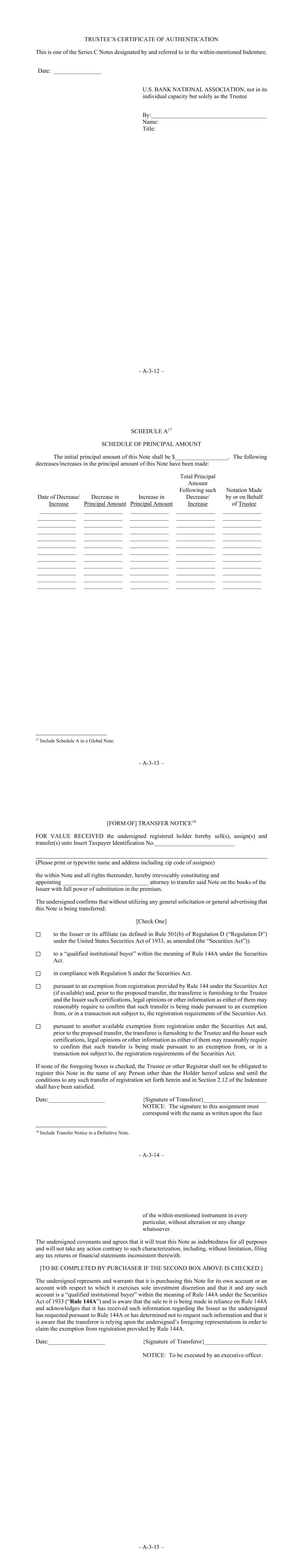 - A-3-12 – TRUSTEE’S CERTIFICATE OF AUTHENTICATION This is one of the Series C Notes designated by and referred to in the within-mentioned Indenture. Date: ________________ U.S. BANK NATIONAL ASSOCIATION, not in its individual capacity but solely as the Trustee By:_______________________________________ Name: Title: - A-3-13 – SCHEDULE A17 SCHEDULE OF PRINCIPAL AMOUNT The initial principal amount of this Note shall be $__________________. The following decreases/increases in the principal amount of this Note have been made: Date of Decrease/ Increase Decrease in Principal Amount Increase in Principal Amount Total Principal Amount Following such Decrease/ Increase Notation Made by or on Behalf of Trustee _____________ _____________ _____________ _____________ _____________ _____________ _____________ _____________ _____________ _____________ _____________ _____________ _____________ _____________ _____________ _____________ _____________ _____________ _____________ _____________ _____________ _____________ _____________ _____________ _____________ _____________ _____________ _____________ _____________ _____________ _____________ _____________ _____________ _____________ _____________ _____________ _____________ _____________ _____________ _____________ _____________ _____________ _____________ _____________ _____________ _____________ _____________ _____________ _____________ _____________ _____________ _____________ _____________ _____________ _____________ _____________ _____________ _____________ _____________ _____________ 17 Include Schedule A in a Global Note. - A-3-14 – [FORM OF] TRANSFER NOTICE18 FOR VALUE RECEIVED the undersigned registered holder hereby sell(s), assign(s) and transfer(s) unto Insert Taxpayer Identification No.___________________________ (Please print or typewrite name and address including zip code of assignee) the within Note and all rights thereunder, hereby irrevocably constituting and appointing _____________________________ attorney to transfer said Note on the books of the Issuer with full power of substitution in the premises. The undersigned confirms that without utilizing any general solicitation or general advertising that this Note is being transferred: [Check One] to the Issuer or its affiliate (as defined in Rule 501(b) of Regulation D (“Regulation D”) under the United States Securities Act of 1933, as amended (the “Securities Act”)). to a “qualified institutional buyer” within the meaning of Rule 144A under the Securities Act. in compliance with Regulation S under the Securities Act. pursuant to an exemption from registration provided by Rule 144 under the Securities Act (if available) and, prior to the proposed transfer, the transferee is furnishing to the Trustee and the Issuer such certifications, legal opinions or other information as either of them may reasonably require to confirm that such transfer is being made pursuant to an exemption from, or in a transaction not subject to, the registration requirements of the Securities Act. pursuant to another available exemption from registration under the Securities Act and, prior to the proposed transfer, the transferee is furnishing to the Trustee and the Issuer such certifications, legal opinions or other information as either of them may reasonably require to confirm that such transfer is being made pursuant to an exemption from, or in a transaction not subject to, the registration requirements of the Securities Act. If none of the foregoing boxes is checked, the Trustee or other Registrar shall not be obligated to register this Note in the name of any Person other than the Holder hereof unless and until the conditions to any such transfer of registration set forth herein and in Section 2.12 of the Indenture shall have been satisfied. Date:___________________ {Signature of Transferor}_____________________ NOTICE: The signature to this assignment must correspond with the name as written upon the face 18 Include Transfer Notice in a Definitive Note. - A-3-15 – of the within-mentioned instrument in every particular, without alteration or any change whatsoever. The undersigned covenants and agrees that it will treat this Note as indebtedness for all purposes and will not take any action contrary to such characterization, including, without limitation, filing any tax returns or financial statements inconsistent therewith. [TO BE COMPLETED BY PURCHASER IF THE SECOND BOX ABOVE IS CHECKED:] The undersigned represents and warrants that it is purchasing this Note for its own account or an account with respect to which it exercises sole investment discretion and that it and any such account is a “qualified institutional buyer” within the meaning of Rule 144A under the Securities Act of 1933 (“Rule 144A”) and is aware that the sale to it is being made in reliance on Rule 144A and acknowledges that it has received such information regarding the Issuer as the undersigned has requested pursuant to Rule 144A or has determined not to request such information and that it is aware that the transferor is relying upon the undersigned’s foregoing representations in order to claim the exemption from registration provided by Rule 144A. Date:___________________ {Signature of Transferor}_____________________ NOTICE: To be executed by an executive officer.