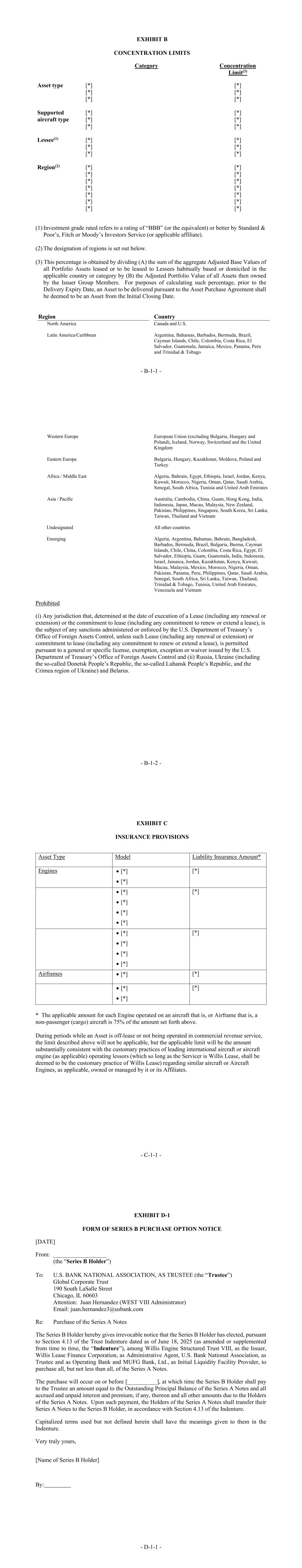 - B-1-1 - EXHIBIT B CONCENTRATION LIMITS Category Concentration Limit(3) Asset type [*] [*] [*] [*] [*] [*] Supported [*] [*] aircraft type [*] [*] [*] [*] Lessee(1) [*] [*] [*] [*] [*] [*] Region(2) [*] [*] [*] [*] [*] [*] [*] [*] [*] [*] [*] [*] [*] [*] (1) Investment grade rated refers to a rating of “BBB” (or the equivalent) or better by Standard & Poor’s, Fitch or Moody’s Investors Service (or applicable affiliate). (2) The designation of regions is set out below. (3) This percentage is obtained by dividing (A) the sum of the aggregate Adjusted Base Values of all Portfolio Assets leased or to be leased to Lessees habitually based or domiciled in the applicable country or category by (B) the Adjusted Portfolio Value of all Assets then owned by the Issuer Group Members. For purposes of calculating such percentage, prior to the Delivery Expiry Date, an Asset to be delivered pursuant to the Asset Purchase Agreement shall be deemed to be an Asset from the Initial Closing Date. Region Country North America Canada and U.S. Latin America/Caribbean Argentina, Bahamas, Barbados, Bermuda, Brazil, Cayman Islands, Chile, Colombia, Costa Rica, El Salvador, Guatemala, Jamaica, Mexico, Panama, Peru and Trinidad & Tobago - B-1-2 - Western Europe European Union (excluding Bulgaria, Hungary and Poland), Iceland, Norway, Switzerland and the United Kingdom Eastern Europe Africa / Middle East Bulgaria, Hungary, Kazakhstan, Moldova, Poland and Turkey Algeria, Bahrain, Egypt, Ethiopia, Israel, Jordan, Kenya, Kuwait, Morocco, Nigeria, Oman, Qatar, Saudi Arabia, Senegal, South Africa, Tunisia and United Arab Emirates Asia / Pacific Australia, Cambodia, China, Guam, Hong Kong, India, Indonesia, Japan, Macau, Malaysia, New Zealand, Pakistan, Philippines, Singapore, South Korea, Sri Lanka, Taiwan, Thailand and Vietnam Undesignated All other countries Emerging Algeria, Argentina, Bahamas, Bahrain, Bangladesh, Barbados, Bermuda, Brazil, Bulgaria, Burma, Cayman Islands, Chile, China, Colombia, Costa Rica, Egypt, El Salvador, Ethiopia, Guam, Guatemala, India, Indonesia, Israel, Jamaica, Jordan, Kazakhstan, Kenya, Kuwait, Macau, Malaysia, Mexico, Morocco, Nigeria, Oman, Pakistan, Panama, Peru, Philippines, Qatar, Saudi Arabia, Senegal, South Africa, Sri Lanka, Taiwan, Thailand, Trinidad & Tobago, Tunisia, United Arab Emirates, Venezuela and Vietnam Prohibited (i) Any jurisdiction that, determined at the date of execution of a Lease (including any renewal or extension) or the commitment to lease (including any commitment to renew or extend a lease), is the subject of any sanctions administered or enforced by the U.S. Department of Treasury’s Office of Foreign Assets Control, unless such Lease (including any renewal or extension) or commitment to lease (including any commitment to renew or extend a lease), is permitted pursuant to a general or specific license, exemption, exception or waiver issued by the U.S. Department of Treasury’s Office of Foreign Assets Control and (ii) Russia, Ukraine (including the so-called Donetsk People’s Republic, the so-called Luhansk People’s Republic, and the Crimea region of Ukraine) and Belarus. - C-1-1 - EXHIBIT C INSURANCE PROVISIONS Asset Type Model Liability Insurance Amount* Engines [*] [*] [*] [*] [*] [*] [*] [*] [*] [*] [*] [*] [*] Airframes [*] [*] [*] [*] [*] * The applicable amount for each Engine operated on an aircraft that is, or Airframe that is, a non-passenger (cargo) aircraft is 75% of the amount set forth above. During periods while an Asset is off-lease or not being operated in commercial revenue service, the limit described above will not be applicable, but the applicable limit will be the amount substantially consistent with the customary practices of leading international aircraft or aircraft engine (as applicable) operating lessors (which so long as the Servicer is Willis Lease, shall be deemed to be the customary practice of Willis Lease) regarding similar aircraft or Aircraft Engines, as applicable, owned or managed by it or its Affiliates. - D-1-1 - EXHIBIT D-1 FORM OF SERIES B PURCHASE OPTION NOTICE [DATE] From: __________________ (the “Series B Holder”) To: U.S. BANK NATIONAL ASSOCIATION, AS TRUSTEE (the “Trustee”) Global Corporate Trust 190 South LaSalle Street Chicago, IL 60603 Attention: Juan Hernandez (WEST VIII Administrator) Email: juan.hernandez3@usbank.com Re: Purchase of the Series A Notes The Series B Holder hereby gives irrevocable notice that the Series B Holder has elected, pursuant to Section 4.13 of the Trust Indenture dated as of June 18, 2025 (as amended or supplemented from time to time, the “Indenture”), among Willis Engine Structured Trust VIII, as the Issuer, Willis Lease Finance Corporation, as Administrative Agent, U.S. Bank National Association, as Trustee and as Operating Bank and MUFG Bank, Ltd., as Initial Liquidity Facility Provider, to purchase all, but not less than all, of the Series A Notes. The purchase will occur on or before [__________], at which time the Series B Holder shall pay to the Trustee an amount equal to the Outstanding Principal Balance of the Series A Notes and all accrued and unpaid interest and premium, if any, thereon and all other amounts due to the Holders of the Series A Notes. Upon such payment, the Holders of the Series A Notes shall transfer their Series A Notes to the Series B Holder, in accordance with Section 4.13 of the Indenture. Capitalized terms used but not defined herein shall have the meanings given to them in the Indenture. Very truly yours, [Name of Series B Holder] By: