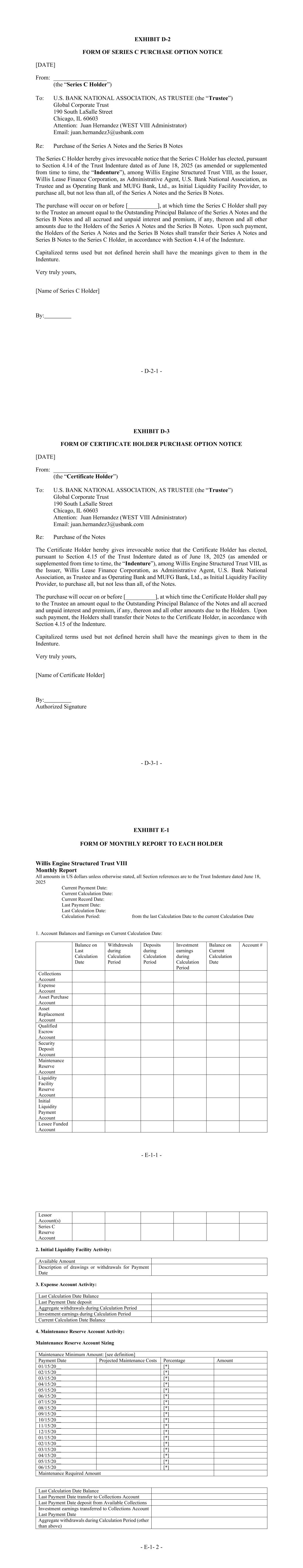 - D-2-1 - EXHIBIT D-2 FORM OF SERIES C PURCHASE OPTION NOTICE [DATE] From: __________________ (the “Series C Holder”) To: U.S. BANK NATIONAL ASSOCIATION, AS TRUSTEE (the “Trustee”) Global Corporate Trust 190 South LaSalle Street Chicago, IL 60603 Attention: Juan Hernandez (WEST VIII Administrator) Email: juan.hernandez3@usbank.com Re: Purchase of the Series A Notes and the Series B Notes The Series C Holder hereby gives irrevocable notice that the Series C Holder has elected, pursuant to Section 4.14 of the Trust Indenture dated as of June 18, 2025 (as amended or supplemented from time to time, the “Indenture”), among Willis Engine Structured Trust VIII, as the Issuer, Willis Lease Finance Corporation, as Administrative Agent, U.S. Bank National Association, as Trustee and as Operating Bank and MUFG Bank, Ltd., as Initial Liquidity Facility Provider, to purchase all, but not less than all, of the Series A Notes and the Series B Notes. The purchase will occur on or before [__________], at which time the Series C Holder shall pay to the Trustee an amount equal to the Outstanding Principal Balance of the Series A Notes and the Series B Notes and all accrued and unpaid interest and premium, if any, thereon and all other amounts due to the Holders of the Series A Notes and the Series B Notes. Upon such payment, the Holders of the Series A Notes and the Series B Notes shall transfer their Series A Notes and Series B Notes to the Series C Holder, in accordance with Section 4.14 of the Indenture. Capitalized terms used but not defined herein shall have the meanings given to them in the Indenture. Very truly yours, [Name of Series C Holder] By: - D-3-1 - EXHIBIT D-3 FORM OF CERTIFICATE HOLDER PURCHASE OPTION NOTICE [DATE] From: __________________ (the “Certificate Holder”) To: U.S. BANK NATIONAL ASSOCIATION, AS TRUSTEE (the “Trustee”) Global Corporate Trust 190 South LaSalle Street Chicago, IL 60603 Attention: Juan Hernandez (WEST VIII Administrator) Email: juan.hernandez3@usbank.com Re: Purchase of the Notes The Certificate Holder hereby gives irrevocable notice that the Certificate Holder has elected, pursuant to Section 4.15 of the Trust Indenture dated as of June 18, 2025 (as amended or supplemented from time to time, the “Indenture”), among Willis Engine Structured Trust VIII, as the Issuer, Willis Lease Finance Corporation, as Administrative Agent, U.S. Bank National Association, as Trustee and as Operating Bank and MUFG Bank, Ltd., as Initial Liquidity Facility Provider, to purchase all, but not less than all, of the Notes. The purchase will occur on or before [__________], at which time the Certificate Holder shall pay to the Trustee an amount equal to the Outstanding Principal Balance of the Notes and all accrued and unpaid interest and premium, if any, thereon and all other amounts due to the Holders. Upon such payment, the Holders shall transfer their Notes to the Certificate Holder, in accordance with Section 4.15 of the Indenture. Capitalized terms used but not defined herein shall have the meanings given to them in the Indenture. Very truly yours, [Name of Certificate Holder] By: Authorized Signature - E-1-1 - EXHIBIT E-1 FORM OF MONTHLY REPORT TO EACH HOLDER Willis Engine Structured Trust VIII Monthly Report All amounts in US dollars unless otherwise stated, all Section references are to the Trust Indenture dated June 18, 2025 Current Payment Date: Current Calculation Date: Current Record Date: Last Payment Date: Last Calculation Date: Calculation Period: from the last Calculation Date to the current Calculation Date 1. Account Balances and Earnings on Current Calculation Date: Balance on Last Calculation Date Withdrawals during Calculation Period Deposits during Calculation Period Investment earnings during Calculation Period Balance on Current Calculation Date Account # Collections Account Expense Account Asset Purchase Account Asset Replacement Account Qualified Escrow Account Security Deposit Account Maintenance Reserve Account Liquidity Facility Reserve Account Initial Liquidity Payment Account Lessee Funded Account - E-1- 2 - Lessor Account(s) Series C Reserve Account 2. Initial Liquidity Facility Activity: Available Amount Description of drawings or withdrawals for Payment Date 3. Expense Account Activity: Last Calculation Date Balance Last Payment Date deposit Aggregate withdrawals during Calculation Period Investment earnings during Calculation Period Current Calculation Date Balance 4. Maintenance Reserve Account Activity: Maintenance Reserve Account Sizing Maintenance Minimum Amount: [see definition] Payment Date Projected Maintenance Costs Percentage Amount 01/15/20__ [*] 02/15/20__ [*] 03/15/20__ [*] 04/15/20__ [*] 05/15/20__ [*] 06/15/20__ [*] 07/15/20__ [*] 08/15/20__ [*] 09/15/20__ [*] 10/15/20__ [*] 11/15/20__ [*] 12/15/20__ [*] 01/15/20__ [*] 02/15/20__ [*] 03/15/20__ [*] 04/15/20__ [*] 05/15/20__ [*] 06/15/20__ [*] Maintenance Required Amount Last Calculation Date Balance Last Payment Date transfer to Collections Account Last Payment Date deposit from Available Collections Investment earnings transferred to Collections Account Last Payment Date Aggregate withdrawals during Calculation Period (other than above)