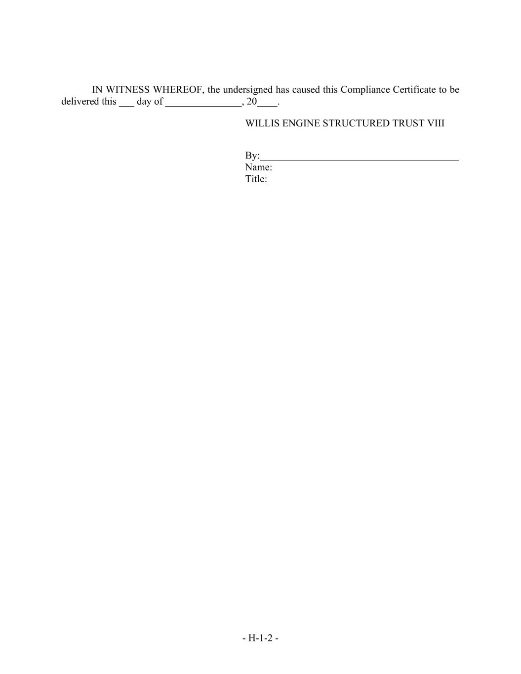 - H-1-2 - IN WITNESS WHEREOF, the undersigned has caused this Compliance Certificate to be delivered this ___ day of _______________, 20____. WILLIS ENGINE STRUCTURED TRUST VIII By:_______________________________________ Name: Title: