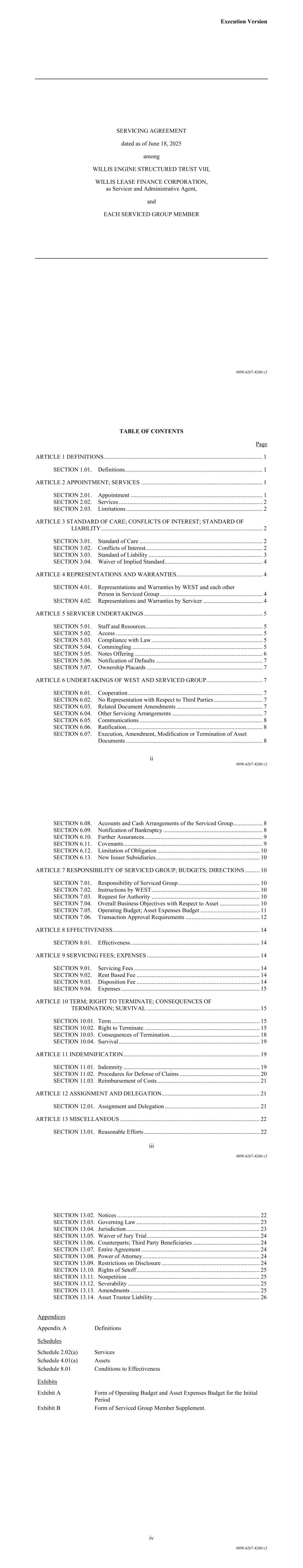 Execution Version 4898-6267-4260.v2 SERVICING AGREEMENT dated as of June 18, 2025 among WILLIS ENGINE STRUCTURED TRUST VIII, WILLIS LEASE FINANCE CORPORATION, as Servicer and Administrative Agent, and EACH SERVICED GROUP MEMBER ii 4898-6267-4260.v2 TABLE OF CONTENTS Page ARTICLE 1 DEFINITIONS ........................................................................................................... 1 SECTION 1.01. Definitions............................................................................................. 1 ARTICLE 2 APPOINTMENT; SERVICES .................................................................................. 1 SECTION 2.01. Appointment ......................................................................................... 1 SECTION 2.02. Services ................................................................................................. 2 SECTION 2.03. Limitations ............................................................................................ 2 ARTICLE 3 STANDARD OF CARE; CONFLICTS OF INTEREST; STANDARD OF LIABILITY ............................................................................................................. 2 SECTION 3.01. Standard of Care ................................................................................... 2 SECTION 3.02. Conflicts of Interest............................................................................... 2 SECTION 3.03. Standard of Liability ............................................................................. 3 SECTION 3.04. Waiver of Implied Standard .................................................................. 4 ARTICLE 4 REPRESENTATIONS AND WARRANTIES .......................................................... 4 SECTION 4.01. Representations and Warranties by WEST and each other Person in Serviced Group ..................................................................... 4 SECTION 4.02. Representations and Warranties by Servicer ........................................ 4 ARTICLE 5 SERVICER UNDERTAKINGS ................................................................................ 5 SECTION 5.01. Staff and Resources............................................................................... 5 SECTION 5.02. Access ................................................................................................... 5 SECTION 5.03. Compliance with Law ........................................................................... 5 SECTION 5.04. Commingling ........................................................................................ 5 SECTION 5.05. Notes Offering ...................................................................................... 6 SECTION 5.06. Notification of Defaults ........................................................................ 7 SECTION 5.07. Ownership Placards .............................................................................. 7 ARTICLE 6 UNDERTAKINGS OF WEST AND SERVICED GROUP...................................... 7 SECTION 6.01. Cooperation ........................................................................................... 7 SECTION 6.02. No Representation with Respect to Third Parties ................................. 7 SECTION 6.03. Related Document Amendments .......................................................... 7 SECTION 6.04. Other Servicing Arrangements ............................................................. 7 SECTION 6.05. Communications ................................................................................... 8 SECTION 6.06. Ratification ............................................................................................ 8 SECTION 6.07. Execution, Amendment, Modification or Termination of Asset Documents ............................................................................................ 8 iii 4898-6267-4260.v2 SECTION 6.08. Accounts and Cash Arrangements of the Serviced Group.................... 8 SECTION 6.09. Notification of Bankruptcy ................................................................... 8 SECTION 6.10. Further Assurances................................................................................ 9 SECTION 6.11. Covenants .............................................................................................. 9 SECTION 6.12. Limitation of Obligation ..................................................................... 10 SECTION 6.13. New Issuer Subsidiaries ...................................................................... 10 ARTICLE 7 RESPONSIBILITY OF SERVICED GROUP; BUDGETS; DIRECTIONS .......... 10 SECTION 7.01. Responsibility of Serviced Group ....................................................... 10 SECTION 7.02. Instructions by WEST ......................................................................... 10 SECTION 7.03. Request for Authority ......................................................................... 10 SECTION 7.04. Overall Business Objectives with Respect to Asset ........................... 10 SECTION 7.05. Operating Budget; Asset Expenses Budget ........................................ 11 SECTION 7.06. Transaction Approval Requirements .................................................. 12 ARTICLE 8 EFFECTIVENESS ................................................................................................... 14 SECTION 8.01. Effectiveness ....................................................................................... 14 ARTICLE 9 SERVICING FEES; EXPENSES ............................................................................ 14 SECTION 9.01. Servicing Fees ..................................................................................... 14 SECTION 9.02. Rent Based Fee ................................................................................... 14 SECTION 9.03. Disposition Fee ................................................................................... 14 SECTION 9.04. Expenses ..