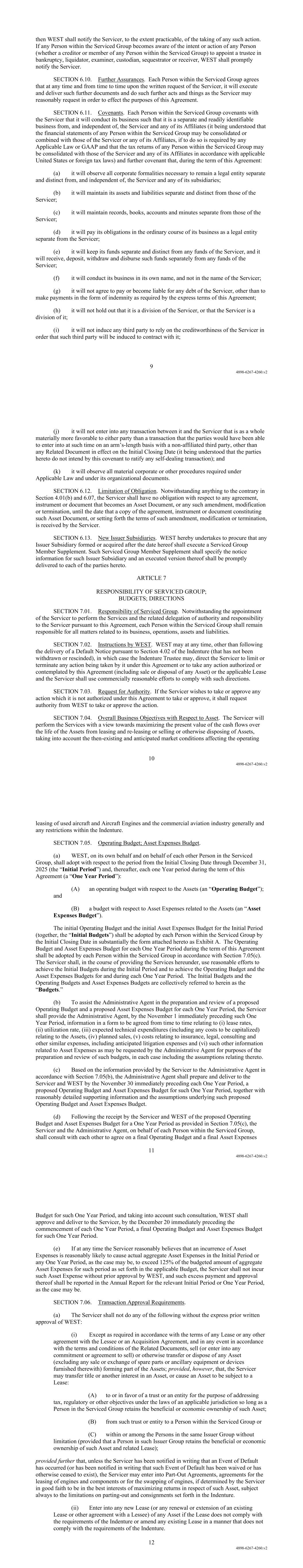 9 4898-6267-4260.v2 then WEST shall notify the Servicer, to the extent practicable, of the taking of any such action. If any Person within the Serviced Group becomes aware of the intent or action of any Person (whether a creditor or member of any Person within the Serviced Group) to appoint a trustee in bankruptcy, liquidator, examiner, custodian, sequestrator or receiver, WEST shall promptly notify the Servicer. SECTION 6.10. Further Assurances. Each Person within the Serviced Group agrees that at any time and from time to time upon the written request of the Servicer, it will execute and deliver such further documents and do such further acts and things as the Servicer may reasonably request in order to effect the purposes of this Agreement. SECTION 6.11. Covenants. Each Person within the Serviced Group covenants with the Servicer that it will conduct its business such that it is a separate and readily identifiable business from, and independent of, the Servicer and any of its Affiliates (it being understood that the financial statements of any Person within the Serviced Group may be consolidated or combined with those of the Servicer or any of its Affiliates, if to do so is required by any Applicable Law or GAAP and that the tax returns of any Person within the Serviced Group may be consolidated with those of the Servicer and any of its Affiliates in accordance with applicable United States or foreign tax laws) and further covenant that, during the term of this Agreement: (a) it will observe all corporate formalities necessary to remain a legal entity separate and distinct from, and independent of, the Servicer and any of its subsidiaries; (b) it will maintain its assets and liabilities separate and distinct from those of the Servicer; (c) it will maintain records, books, accounts and minutes separate from those of the Servicer; (d) it will pay its obligations in the ordinary course of its business as a legal entity separate from the Servicer; (e) it will keep its funds separate and distinct from any funds of the Servicer, and it will receive, deposit, withdraw and disburse such funds separately from any funds of the Servicer; (f) it will conduct its business in its own name, and not in the name of the Servicer; (g) it will not agree to pay or become liable for any debt of the Servicer, other than to make payments in the form of indemnity as required by the express terms of this Agreement; (h) it will not hold out that it is a division of the Servicer, or that the Servicer is a division of it; (i) it will not induce any third party to rely on the creditworthiness of the Servicer in order that such third party will be induced to contract with it; 10 4898-6267-4260.v2 (j) it will not enter into any transaction between it and the Servicer that is as a whole materially more favorable to either party than a transaction that the parties would have been able to enter into at such time on an arm’s-length basis with a non-affiliated third party, other than any Related Document in effect on the Initial Closing Date (it being understood that the parties hereto do not intend by this covenant to ratify any self-dealing transaction); and (k) it will observe all material corporate or other procedures required under Applicable Law and under its organizational documents. SECTION 6.12. Limitation of Obligation. Notwithstanding anything to the contrary in Section 4.01(b) and 6.07, the Servicer shall have no obligation with respect to any agreement, instrument or document that becomes an Asset Document, or any such amendment, modification or termination, until the date that a copy of the agreement, instrument or document constituting such Asset Document, or setting forth the terms of such amendment, modification or termination, is received by the Servicer. SECTION 6.13. New Issuer Subsidiaries. WEST hereby undertakes to procure that any Issuer Subsidiary formed or acquired after the date hereof shall execute a Serviced Group Member Supplement. Such Serviced Group Member Supplement shall specify the notice information for such Issuer Subsidiary and an executed version thereof shall be promptly delivered to each of the parties hereto. ARTICLE 7 RESPONSIBILITY OF SERVICED GROUP; BUDGETS; DIRECTIONS SECTION 7.01. Responsibility of Serviced Group. Notwithstanding the appointment of the Servicer to perform the Services and the related delegation of authority and responsibility to the Servicer pursuant to this Agreement, each Person within the Serviced Group shall remain responsible for all matters related to its business, operations, assets and liabilities. SECTION 7.02. Instructions by WEST. WEST may at any time, other than following the delivery of a Default Notice pursuant to Section 4.02 of the Indenture (that has not been withdrawn or rescinded), in which case the Indenture Trustee may, direct the Servicer to limit or terminate any action being taken by it under this Agreement or to take any action authorized or contemplated by this Agreement (including sale or disposal of any Asset) or the applicable Lease and the Servicer shall use commercially reasonable efforts to comply with such directions. SECTION 7.03. Request for Authority. If the Servicer wishes to take or approve any action which it is not authorized under this Agreement to take or approve, it shall request authority from WEST to take or approve the action. SECTION 7.04. Overall Business Objectives with Respect to Asset. The Servicer will perform the Services with a view towards maximizing the present value of the cash flows over the life of the Assets from leasing and re-leasing or selling or otherwise disposing of Assets, taking into account the then-existing and anticipated market conditions affecting the operating 11 4898-6267-4260.v2 leasing of used aircraft and Aircraft Engines and the commercial aviation industry generally and any restrictions within the Indenture. SECTION 7.05. Operating Budget; Asset Expenses Budget. (a) WEST, on its