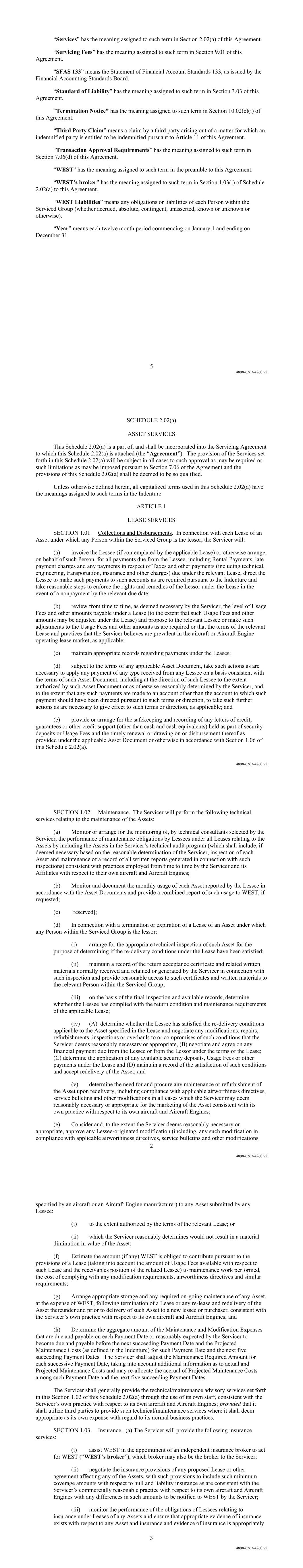 5 4898-6267-4260.v2 “Services” has the meaning assigned to such term in Section 2.02(a) of this Agreement. “Servicing Fees” has the meaning assigned to such term in Section 9.01 of this Agreement. “SFAS 133” means the Statement of Financial Account Standards 133, as issued by the Financial Accounting Standards Board. “Standard of Liability” has the meaning assigned to such term in Section 3.03 of this Agreement. “Termination Notice” has the meaning assigned to such term in Section 10.02(c)(i) of this Agreement. “Third Party Claim” means a claim by a third party arising out of a matter for which an indemnified party is entitled to be indemnified pursuant to Article 11 of this Agreement. “Transaction Approval Requirements” has the meaning assigned to such term in Section 7.06(d) of this Agreement. “WEST” has the meaning assigned to such term in the preamble to this Agreement. “WEST’s broker” has the meaning assigned to such term in Section 1.03(i) of Schedule 2.02(a) to this Agreement. “WEST Liabilities” means any obligations or liabilities of each Person within the Serviced Group (whether accrued, absolute, contingent, unasserted, known or unknown or otherwise). “Year” means each twelve month period commencing on January 1 and ending on December 31. 4898-6267-4260.v2 SCHEDULE 2.02(a) ASSET SERVICES This Schedule 2.02(a) is a part of, and shall be incorporated into the Servicing Agreement to which this Schedule 2.02(a) is attached (the “Agreement”). The provision of the Services set forth in this Schedule 2.02(a) will be subject in all cases to such approval as may be required or such limitations as may be imposed pursuant to Section 7.06 of the Agreement and the provisions of this Schedule 2.02(a) shall be deemed to be so qualified. Unless otherwise defined herein, all capitalized terms used in this Schedule 2.02(a) have the meanings assigned to such terms in the Indenture. ARTICLE 1 LEASE SERVICES SECTION 1.01. Collections and Disbursements. In connection with each Lease of an Asset under which any Person within the Serviced Group is the lessor, the Servicer will: (a) invoice the Lessee (if contemplated by the applicable Lease) or otherwise arrange, on behalf of such Person, for all payments due from the Lessee, including Rental Payments, late payment charges and any payments in respect of Taxes and other payments (including technical, engineering, transportation, insurance and other charges) due under the relevant Lease, direct the Lessee to make such payments to such accounts as are required pursuant to the Indenture and take reasonable steps to enforce the rights and remedies of the Lessor under the Lease in the event of a nonpayment by the relevant due date; (b) review from time to time, as deemed necessary by the Servicer, the level of Usage Fees and other amounts payable under a Lease (to the extent that such Usage Fees and other amounts may be adjusted under the Lease) and propose to the relevant Lessee or make such adjustments to the Usage Fees and other amounts as are required or that the terms of the relevant Lease and practices that the Servicer believes are prevalent in the aircraft or Aircraft Engine operating lease market, as applicable; (c) maintain appropriate records regarding payments under the Leases; (d) subject to the terms of any applicable Asset Document, take such actions as are necessary to apply any payment of any type received from any Lessee on a basis consistent with the terms of such Asset Document, including at the direction of such Lessee to the extent authorized by such Asset Document or as otherwise reasonably determined by the Servicer, and, to the extent that any such payments are made to an account other than the account to which such payment should have been directed pursuant to such terms or direction, to take such further actions as are necessary to give effect to such terms or direction, as applicable; and (e) provide or arrange for the safekeeping and recording of any letters of credit, guarantees or other credit support (other than cash and cash equivalents) held as part of security deposits or Usage Fees and the timely renewal or drawing on or disbursement thereof as provided under the applicable Asset Document or otherwise in accordance with Section 1.06 of this Schedule 2.02(a). 2 4898-6267-4260.v2 SECTION 1.02. Maintenance. The Servicer will perform the following technical services relating to the maintenance of the Assets: (a) Monitor or arrange for the monitoring of, by technical consultants selected by the Servicer, the performance of maintenance obligations by Lessees under all Leases relating to the Assets by including the Assets in the Servicer’s technical audit program (which shall include, if deemed necessary based on the reasonable determination of the Servicer, inspection of each Asset and maintenance of a record of all written reports generated in connection with such inspections) consistent with practices employed from time to time by the Servicer and its Affiliates with respect to their own aircraft and Aircraft Engines; (b) Monitor and document the monthly usage of each Asset reported by the Lessee in accordance with the Asset Documents and provide a combined report of such usage to WEST, if requested; (c) [reserved]; (d) In connection with a termination or expiration of a Lease of an Asset under which any Person within the Serviced Group is the lessor: (i) arrange for the appropriate technical inspection of such Asset for the purpose of determining if the re-delivery conditions under the Lease have been satisfied; (ii) maintain a record of the return acceptance certificate and related written materials normally received and retained or generated by the Servicer in connection with such inspection and provide reasonable access to such certificates and written materials to the relevant Person within the Serviced Group; (iii) on the basis of the final inspection and available rec