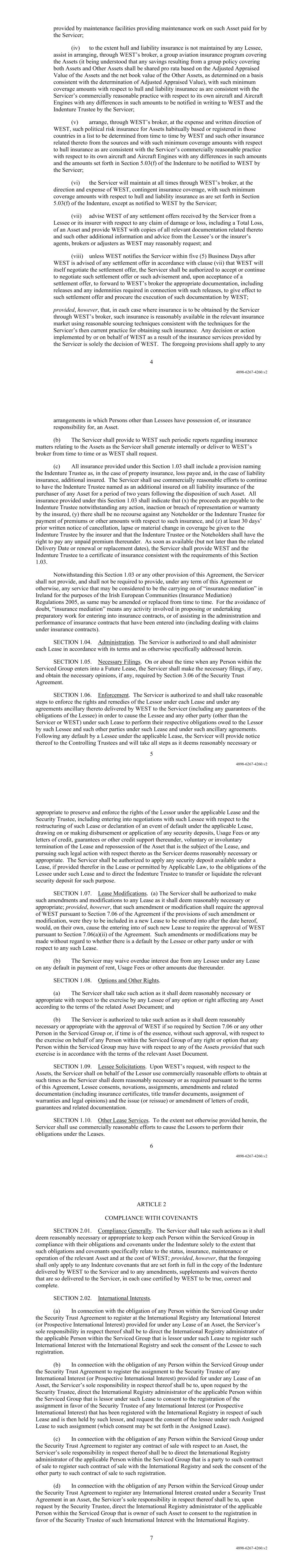 4 4898-6267-4260.v2 provided by maintenance facilities providing maintenance work on such Asset paid for by the Servicer; (iv) to the extent hull and liability insurance is not maintained by any Lessee, assist in arranging, through WEST’s broker, a group aviation insurance program covering the Assets (it being understood that any savings resulting from a group policy covering both Assets and Other Assets shall be shared pro rata based on the Adjusted Appraised Value of the Assets and the net book value of the Other Assets, as determined on a basis consistent with the determination of Adjusted Appraised Value), with such minimum coverage amounts with respect to hull and liability insurance as are consistent with the Servicer’s commercially reasonable practice with respect to its own aircraft and Aircraft Engines with any differences in such amounts to be notified in writing to WEST and the Indenture Trustee by the Servicer; (v) arrange, through WEST’s broker, at the expense and written direction of WEST, such political risk insurance for Assets habitually based or registered in those countries in a list to be determined from time to time by WEST and such other insurance related thereto from the sources and with such minimum coverage amounts with respect to hull insurance as are consistent with the Servicer’s commercially reasonable practice with respect to its own aircraft and Aircraft Engines with any differences in such amounts and the amounts set forth in Section 5.03(f) of the Indenture to be notified to WEST by the Servicer; (vi) the Servicer will maintain at all times through WEST’s broker, at the direction and expense of WEST, contingent insurance coverage, with such minimum coverage amounts with respect to hull and liability insurance as are set forth in Section 5.03(f) of the Indenture, except as notified to WEST by the Servicer; (vii) advise WEST of any settlement offers received by the Servicer from a Lessee or its insurer with respect to any claim of damage or loss, including a Total Loss, of an Asset and provide WEST with copies of all relevant documentation related thereto and such other additional information and advice from the Lessee’s or the insurer’s agents, brokers or adjusters as WEST may reasonably request; and (viii) unless WEST notifies the Servicer within five (5) Business Days after WEST is advised of any settlement offer in accordance with clause (vii) that WEST will itself negotiate the settlement offer, the Servicer shall be authorized to accept or continue to negotiate such settlement offer or such advisement and, upon acceptance of a settlement offer, to forward to WEST’s broker the appropriate documentation, including releases and any indemnities required in connection with such releases, to give effect to such settlement offer and procure the execution of such documentation by WEST; provided, however, that, in each case where insurance is to be obtained by the Servicer through WEST’s broker, such insurance is reasonably available in the relevant insurance market using reasonable sourcing techniques consistent with the techniques for the Servicer’s then current practice for obtaining such insurance. Any decision or action implemented by or on behalf of WEST as a result of the insurance services provided by the Servicer is solely the decision of WEST. The foregoing provisions shall apply to any 5 4898-6267-4260.v2 arrangements in which Persons other than Lessees have possession of, or insurance responsibility for, an Asset. (b) The Servicer shall provide to WEST such periodic reports regarding insurance matters relating to the Assets as the Servicer shall generate internally or deliver to WEST’s broker from time to time or as WEST shall request. (c) All insurance provided under this Section 1.03 shall include a provision naming the Indenture Trustee as, in the case of property insurance, loss payee and, in the case of liability insurance, additional insured. The Servicer shall use commercially reasonable efforts to continue to have the Indenture Trustee named as an additional insured on all liability insurance of the purchaser of any Asset for a period of two years following the disposition of such Asset. All insurance provided under this Section 1.03 shall indicate that (x) the proceeds are payable to the Indenture Trustee notwithstanding any action, inaction or breach of representation or warranty by the insured, (y) there shall be no recourse against any Noteholder or the Indenture Trustee for payment of premiums or other amounts with respect to such insurance, and (z) at least 30 days’ prior written notice of cancellation, lapse or material change in coverage be given to the Indenture Trustee by the insurer and that the Indenture Trustee or the Noteholders shall have the right to pay any unpaid premium thereunder. As soon as available (but not later than the related Delivery Date or renewal or replacement dates), the Servicer shall provide WEST and the Indenture Trustee to a certificate of insurance consistent with the requirements of this Section 1.03. Notwithstanding this Section 1.03 or any other provision of this Agreement, the Servicer shall not provide, and shall not be required to provide, under any term of this Agreement or otherwise, any service that may be considered to be the carrying on of “insurance mediation” in Ireland for the purposes of the Irish European Communities (Insurance Mediation) Regulations 2005, as same may be amended or replaced from time to time. For the avoidance of doubt, “insurance mediation” means any activity involved in proposing or undertaking preparatory work for entering into insurance contracts, or of assisting in the administration and performance of insurance contracts that have been entered into (including dealing with claims under insurance contracts). SECTION 1.04. Administration. The Servicer is authorized to and shall administer each Lease in accordance with its terms and as o