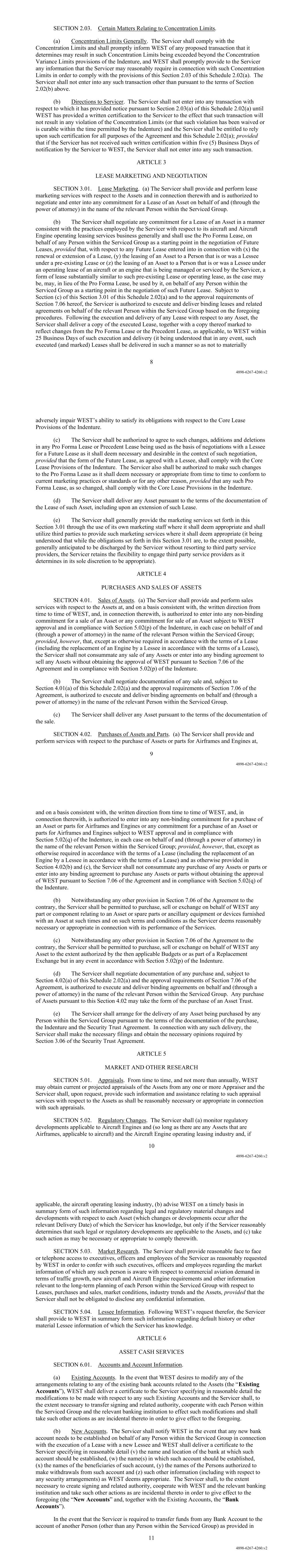 8 4898-6267-4260.v2 SECTION 2.03. Certain Matters Relating to Concentration Limits. (a) Concentration Limits Generally. The Servicer shall comply with the Concentration Limits and shall promptly inform WEST of any proposed transaction that it determines may result in such Concentration Limits being exceeded beyond the Concentration Variance Limits provisions of the Indenture, and WEST shall promptly provide to the Servicer any information that the Servicer may reasonably require in connection with such Concentration Limits in order to comply with the provisions of this Section 2.03 of this Schedule 2.02(a). The Servicer shall not enter into any such transaction other than pursuant to the terms of Section 2.02(b) above. (b) Directions to Servicer. The Servicer shall not enter into any transaction with respect to which it has provided notice pursuant to Section 2.03(a) of this Schedule 2.02(a) until WEST has provided a written certification to the Servicer to the effect that such transaction will not result in any violation of the Concentration Limits (or that such violation has been waived or is curable within the time permitted by the Indenture) and the Servicer shall be entitled to rely upon such certification for all purposes of the Agreement and this Schedule 2.02(a); provided that if the Servicer has not received such written certification within five (5) Business Days of notification by the Servicer to WEST, the Servicer shall not enter into any such transaction. ARTICLE 3 LEASE MARKETING AND NEGOTIATION SECTION 3.01. Lease Marketing. (a) The Servicer shall provide and perform lease marketing services with respect to the Assets and in connection therewith and is authorized to negotiate and enter into any commitment for a Lease of an Asset on behalf of and (through the power of attorney) in the name of the relevant Person within the Serviced Group. (b) The Servicer shall negotiate any commitment for a Lease of an Asset in a manner consistent with the practices employed by the Servicer with respect to its aircraft and Aircraft Engine operating leasing services business generally and shall use the Pro Forma Lease, on behalf of any Person within the Serviced Group as a starting point in the negotiation of Future Leases, provided that, with respect to any Future Lease entered into in connection with (x) the renewal or extension of a Lease, (y) the leasing of an Asset to a Person that is or was a Lessee under a pre-existing Lease or (z) the leasing of an Asset to a Person that is or was a Lessee under an operating lease of an aircraft or an engine that is being managed or serviced by the Servicer, a form of lease substantially similar to such pre-existing Lease or operating lease, as the case may be, may, in lieu of the Pro Forma Lease, be used by it, on behalf of any Person within the Serviced Group as a starting point in the negotiation of such Future Lease. Subject to Section (c) of this Section 3.01 of this Schedule 2.02(a) and to the approval requirements of Section 7.06 hereof, the Servicer is authorized to execute and deliver binding leases and related agreements on behalf of the relevant Person within the Serviced Group based on the foregoing procedures. Following the execution and delivery of any Lease with respect to any Asset, the Servicer shall deliver a copy of the executed Lease, together with a copy thereof marked to reflect changes from the Pro Forma Lease or the Precedent Lease, as applicable, to WEST within 25 Business Days of such execution and delivery (it being understood that in any event, such executed (and marked) Leases shall be delivered in such a manner so as not to materially 9 4898-6267-4260.v2 adversely impair WEST’s ability to satisfy its obligations with respect to the Core Lease Provisions of the Indenture. (c) The Servicer shall be authorized to agree to such changes, additions and deletions in any Pro Forma Lease or Precedent Lease being used as the basis of negotiations with a Lessee for a Future Lease as it shall deem necessary and desirable in the context of such negotiation, provided that the form of the Future Lease, as agreed with a Lessee, shall comply with the Core Lease Provisions of the Indenture. The Servicer also shall be authorized to make such changes to the Pro Forma Lease as it shall deem necessary or appropriate from time to time to conform to current marketing practices or standards or for any other reason, provided that any such Pro Forma Lease, as so changed, shall comply with the Core Lease Provisions in the Indenture. (d) The Servicer shall deliver any Asset pursuant to the terms of the documentation of the Lease of such Asset, including upon an extension of such Lease. (e) The Servicer shall generally provide the marketing services set forth in this Section 3.01 through the use of its own marketing staff where it shall deem appropriate and shall utilize third parties to provide such marketing services where it shall deem appropriate (it being understood that while the obligations set forth in this Section 3.01 are, to the extent possible, generally anticipated to be discharged by the Servicer without resorting to third party service providers, the Servicer retains the flexibility to engage third party service providers as it determines in its sole discretion to be appropriate). ARTICLE 4 PURCHASES AND SALES OF ASSETS SECTION 4.01. Sales of Assets. (a) The Servicer shall provide and perform sales services with respect to the Assets at, and on a basis consistent with, the written direction from time to time of WEST, and, in connection therewith, is authorized to enter into any non-binding commitment for a sale of an Asset or any commitment for sale of an Asset subject to WEST approval and in compliance with Section 5.02(p) of the Indenture, in each case on behalf of and (through a power of attorney) in the name of the relevant Person within the Serviced Group; provided, however, that, except as otherwise required in accordance with