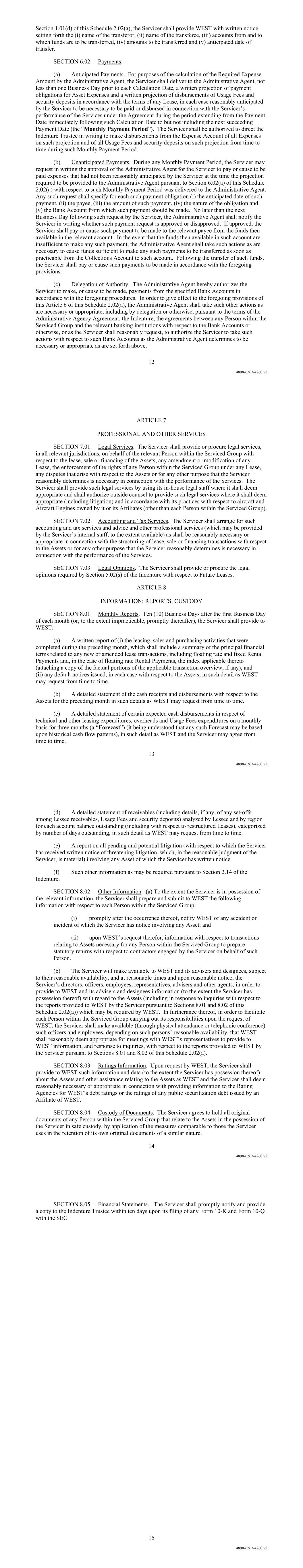 12 4898-6267-4260.v2 Section 1.01(d) of this Schedule 2.02(a), the Servicer shall provide WEST with written notice setting forth the (i) name of the transferor, (ii) name of the transferee, (iii) accounts from and to which funds are to be transferred, (iv) amounts to be transferred and (v) anticipated date of transfer. SECTION 6.02. Payments. (a) Anticipated Payments. For purposes of the calculation of the Required Expense Amount by the Administrative Agent, the Servicer shall deliver to the Administrative Agent, not less than one Business Day prior to each Calculation Date, a written projection of payment obligations for Asset Expenses and a written projection of disbursements of Usage Fees and security deposits in accordance with the terms of any Lease, in each case reasonably anticipated by the Servicer to be necessary to be paid or disbursed in connection with the Servicer’s performance of the Services under the Agreement during the period extending from the Payment Date immediately following such Calculation Date to but not including the next succeeding Payment Date (the “Monthly Payment Period”). The Servicer shall be authorized to direct the Indenture Trustee in writing to make disbursements from the Expense Account of all Expenses on such projection and of all Usage Fees and security deposits on such projection from time to time during such Monthly Payment Period. (b) Unanticipated Payments. During any Monthly Payment Period, the Servicer may request in writing the approval of the Administrative Agent for the Servicer to pay or cause to be paid expenses that had not been reasonably anticipated by the Servicer at the time the projection required to be provided to the Administrative Agent pursuant to Section 6.02(a) of this Schedule 2.02(a) with respect to such Monthly Payment Period was delivered to the Administrative Agent. Any such request shall specify for each such payment obligation (i) the anticipated date of such payment, (ii) the payee, (iii) the amount of such payment, (iv) the nature of the obligation and (v) the Bank Account from which such payment should be made. No later than the next Business Day following such request by the Servicer, the Administrative Agent shall notify the Servicer in writing whether such payment request is approved or disapproved. If approved, the Servicer shall pay or cause such payment to be made to the relevant payee from the funds then available in the relevant account. In the event that the funds then available in such account are insufficient to make any such payment, the Administrative Agent shall take such actions as are necessary to cause funds sufficient to make any such payments to be transferred as soon as practicable from the Collections Account to such account. Following the transfer of such funds, the Servicer shall pay or cause such payments to be made in accordance with the foregoing provisions. (c) Delegation of Authority. The Administrative Agent hereby authorizes the Servicer to make, or cause to be made, payments from the specified Bank Accounts in accordance with the foregoing procedures. In order to give effect to the foregoing provisions of this Article 6 of this Schedule 2.02(a), the Administrative Agent shall take such other actions as are necessary or appropriate, including by delegation or otherwise, pursuant to the terms of the Administrative Agency Agreement, the Indenture, the agreements between any Person within the Serviced Group and the relevant banking institutions with respect to the Bank Accounts or otherwise, or as the Servicer shall reasonably request, to authorize the Servicer to take such actions with respect to such Bank Accounts as the Administrative Agent determines to be necessary or appropriate as are set forth above. 13 4898-6267-4260.v2 ARTICLE 7 PROFESSIONAL AND OTHER SERVICES SECTION 7.01. Legal Services. The Servicer shall provide or procure legal services, in all relevant jurisdictions, on behalf of the relevant Person within the Serviced Group with respect to the lease, sale or financing of the Assets, any amendment or modification of any Lease, the enforcement of the rights of any Person within the Serviced Group under any Lease, any disputes that arise with respect to the Assets or for any other purpose that the Servicer reasonably determines is necessary in connection with the performance of the Services. The Servicer shall provide such legal services by using its in-house legal staff where it shall deem appropriate and shall authorize outside counsel to provide such legal services where it shall deem appropriate (including litigation) and in accordance with its practices with respect to aircraft and Aircraft Engines owned by it or its Affiliates (other than each Person within the Serviced Group). SECTION 7.02. Accounting and Tax Services. The Servicer shall arrange for such accounting and tax services and advice and other professional services (which may be provided by the Servicer’s internal staff, to the extent available) as shall be reasonably necessary or appropriate in connection with the structuring of lease, sale or financing transactions with respect to the Assets or for any other purpose that the Servicer reasonably determines is necessary in connection with the performance of the Services. SECTION 7.03. Legal Opinions. The Servicer shall provide or procure the legal opinions required by Section 5.02(s) of the Indenture with respect to Future Leases. ARTICLE 8 INFORMATION; REPORTS; CUSTODY SECTION 8.01. Monthly Reports. Ten (10) Business Days after the first Business Day of each month (or, to the extent impracticable, promptly thereafter), the Servicer shall provide to WEST: (a) A written report of (i) the leasing, sales and purchasing activities that were completed during the preceding month, which shall include a summary of the principal financial terms related to any new or amended lease transactions, including floating rate and fixed Rental Payments and, in the case of