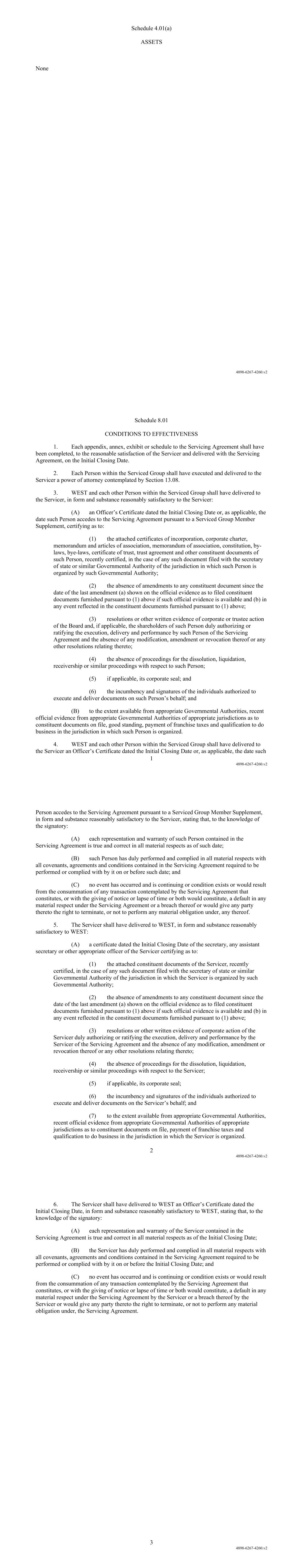 4898-6267-4260.v2 Schedule 4.01(a) ASSETS None 1 4898-6267-4260.v2 Schedule 8.01 CONDITIONS TO EFFECTIVENESS 1. Each appendix, annex, exhibit or schedule to the Servicing Agreement shall have been completed, to the reasonable satisfaction of the Servicer and delivered with the Servicing Agreement, on the Initial Closing Date. 2. Each Person within the Serviced Group shall have executed and delivered to the Servicer a power of attorney contemplated by Section 13.08. 3. WEST and each other Person within the Serviced Group shall have delivered to the Servicer, in form and substance reasonably satisfactory to the Servicer: (A) an Officer’s Certificate dated the Initial Closing Date or, as applicable, the date such Person accedes to the Servicing Agreement pursuant to a Serviced Group Member Supplement, certifying as to: (1) the attached certificates of incorporation, corporate charter, memorandum and articles of association, memorandum of association, constitution, by- laws, bye-laws, certificate of trust, trust agreement and other constituent documents of such Person, recently certified, in the case of any such document filed with the secretary of state or similar Governmental Authority of the jurisdiction in which such Person is organized by such Governmental Authority; (2) the absence of amendments to any constituent document since the date of the last amendment (a) shown on the official evidence as to filed constituent documents furnished pursuant to (1) above if such official evidence is available and (b) in any event reflected in the constituent documents furnished pursuant to (1) above; (3) resolutions or other written evidence of corporate or trustee action of the Board and, if applicable, the shareholders of such Person duly authorizing or ratifying the execution, delivery and performance by such Person of the Servicing Agreement and the absence of any modification, amendment or revocation thereof or any other resolutions relating thereto; (4) the absence of proceedings for the dissolution, liquidation, receivership or similar proceedings with respect to such Person; (5) if applicable, its corporate seal; and (6) the incumbency and signatures of the individuals authorized to execute and deliver documents on such Person’s behalf; and (B) to the extent available from appropriate Governmental Authorities, recent official evidence from appropriate Governmental Authorities of appropriate jurisdictions as to constituent documents on file, good standing, payment of franchise taxes and qualification to do business in the jurisdiction in which such Person is organized. 4. WEST and each other Person within the Serviced Group shall have delivered to the Servicer an Officer’s Certificate dated the Initial Closing Date or, as applicable, the date such 2 4898-6267-4260.v2 Person accedes to the Servicing Agreement pursuant to a Serviced Group Member Supplement, in form and substance reasonably satisfactory to the Servicer, stating that, to the knowledge of the signatory: (A) each representation and warranty of such Person contained in the Servicing Agreement is true and correct in all material respects as of such date; (B) such Person has duly performed and complied in all material respects with all covenants, agreements and conditions contained in the Servicing Agreement required to be performed or complied with by it on or before such date; and (C) no event has occurred and is continuing or condition exists or would result from the consummation of any transaction contemplated by the Servicing Agreement that constitutes, or with the giving of notice or lapse of time or both would constitute, a default in any material respect under the Servicing Agreement or a breach thereof or would give any party thereto the right to terminate, or not to perform any material obligation under, any thereof. 5. The Servicer shall have delivered to WEST, in form and substance reasonably satisfactory to WEST: (A) a certificate dated the Initial Closing Date of the secretary, any assistant secretary or other appropriate officer of the Servicer certifying as to: (1) the attached constituent documents of the Servicer, recently certified, in the case of any such document filed with the secretary of state or similar Governmental Authority of the jurisdiction in which the Servicer is organized by such Governmental Authority; (2) the absence of amendments to any constituent document since the date of the last amendment (a) shown on the official evidence as to filed constituent documents furnished pursuant to (1) above if such official evidence is available and (b) in any event reflected in the constituent documents furnished pursuant to (1) above; (3) resolutions or other written evidence of corporate action of the Servicer duly authorizing or ratifying the execution, delivery and performance by the Servicer of the Servicing Agreement and the absence of any modification, amendment or revocation thereof or any other resolutions relating thereto; (4) the absence of proceedings for the dissolution, liquidation, receivership or similar proceedings with respect to the Servicer; (5) if applicable, its corporate seal; (6) the incumbency and signatures of the individuals authorized to execute and deliver documents on the Servicer’s behalf; and (7) to the extent available from appropriate Governmental Authorities, recent official evidence from appropriate Governmental Authorities of appropriate jurisdictions as to constituent documents on file, payment of franchise taxes and qualification to do business in the jurisdiction in which the Servicer is organized. 3 4898-6267-4260.v2 6. The Servicer shall have delivered to WEST an Officer’s Certificate dated the Initial Closing Date, in form and substance reasonably satisfactory to WEST, stating that, to the knowledge of the signatory: (A) each representation and warranty of the Servicer contained in the Servicing Agreement is true and correct in all material respects as of the 
