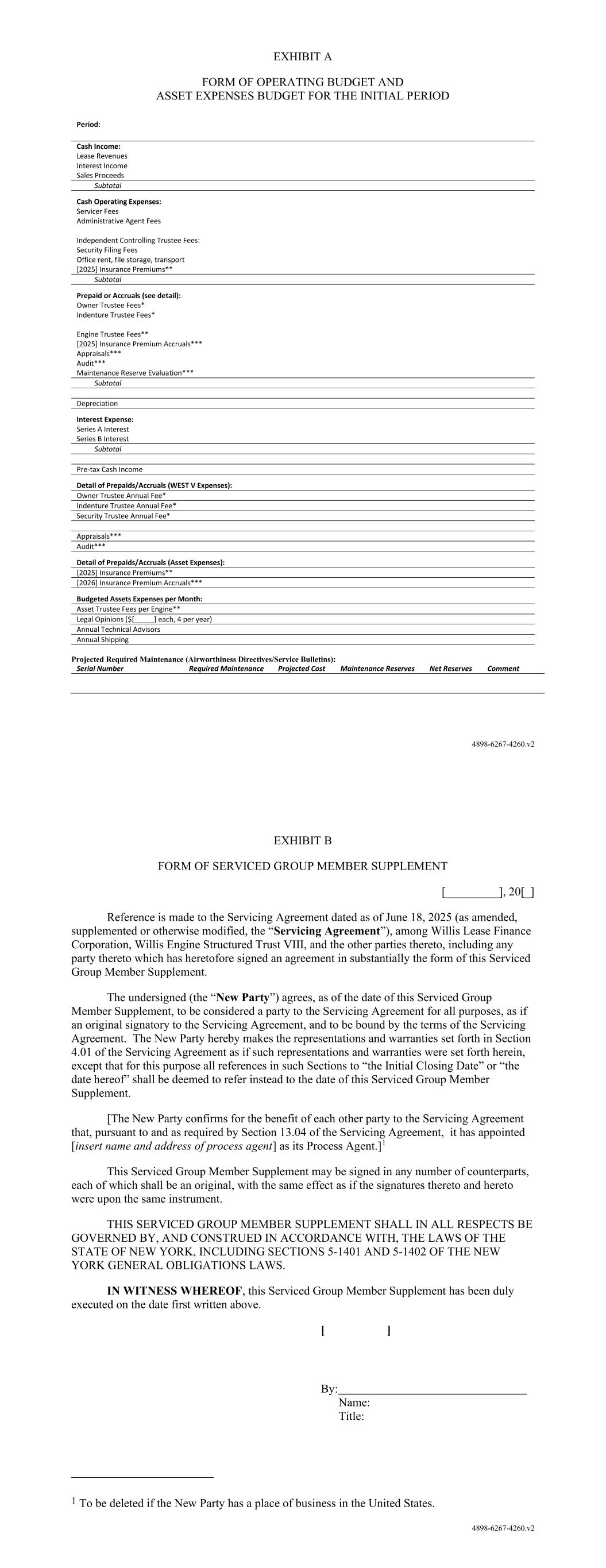 4898-6267-4260.v2 EXHIBIT A FORM OF OPERATING BUDGET AND ASSET EXPENSES BUDGET FOR THE INITIAL PERIOD Projected Required Maintenance (Airworthiness Directives/Service Bulletins): Serial Number Required Maintenance Projected Cost Maintenance Reserves Net Reserves Comment Period: Cash Income: Lease Revenues Interest Income Sales Proceeds Subtotal Cash Operating Expenses: Servicer Fees Administrative Agent Fees Independent Controlling Trustee Fees: Security Filing Fees Office rent, file storage, transport [2025] Insurance Premiums** Subtotal Prepaid or Accruals (see detail): Owner Trustee Fees* Indenture Trustee Fees* Engine Trustee Fees** [2025] Insurance Premium Accruals*** Appraisals*** Audit*** Maintenance Reserve Evaluation*** Subtotal Depreciation Interest Expense: Series A Interest Series B Interest Subtotal Pre-tax Cash Income Detail of Prepaids/Accruals (WEST V Expenses): Owner Trustee Annual Fee* Indenture Trustee Annual Fee* Security Trustee Annual Fee* Appraisals*** Audit*** Detail of Prepaids/Accruals (Asset Expenses): [2025] Insurance Premiums** [2026] Insurance Premium Accruals*** Budgeted Assets Expenses per Month: Asset Trustee Fees per Engine** Legal Opinions ($[_____] each, 4 per year) Annual Technical Advisors Annual Shipping 4898-6267-4260.v2 EXHIBIT B FORM OF SERVICED GROUP MEMBER SUPPLEMENT [_________], 20[_] Reference is made to the Servicing Agreement dated as of June 18, 2025 (as amended, supplemented or otherwise modified, the “Servicing Agreement”), among Willis Lease Finance Corporation, Willis Engine Structured Trust VIII, and the other parties thereto, including any party thereto which has heretofore signed an agreement in substantially the form of this Serviced Group Member Supplement. The undersigned (the “New Party”) agrees, as of the date of this Serviced Group Member Supplement, to be considered a party to the Servicing Agreement for all purposes, as if an original signatory to the Servicing Agreement, and to be bound by the terms of the Servicing Agreement. The New Party hereby makes the representations and warranties set forth in Section 4.01 of the Servicing Agreement as if such representations and warranties were set forth herein, except that for this purpose all references in such Sections to “the Initial Closing Date” or “the date hereof” shall be deemed to refer instead to the date of this Serviced Group Member Supplement. [The New Party confirms for the benefit of each other party to the Servicing Agreement that, pursuant to and as required by Section 13.04 of the Servicing Agreement, it has appointed [insert name and address of process agent] as its Process Agent.]1 This Serviced Group Member Supplement may be signed in any number of counterparts, each of which shall be an original, with the same effect as if the signatures thereto and hereto were upon the same instrument. THIS SERVICED GROUP MEMBER SUPPLEMENT SHALL IN ALL RESPECTS BE GOVERNED BY, AND CONSTRUED IN ACCORDANCE WITH, THE LAWS OF THE STATE OF NEW YORK, INCLUDING SECTIONS 5-1401 AND 5-1402 OF THE NEW YORK GENERAL OBLIGATIONS LAWS. IN WITNESS WHEREOF, this Serviced Group Member Supplement has been duly executed on the date first written above. [ ] By: Name: Title: 1 To be deleted if the New Party has a place of business in the United States.