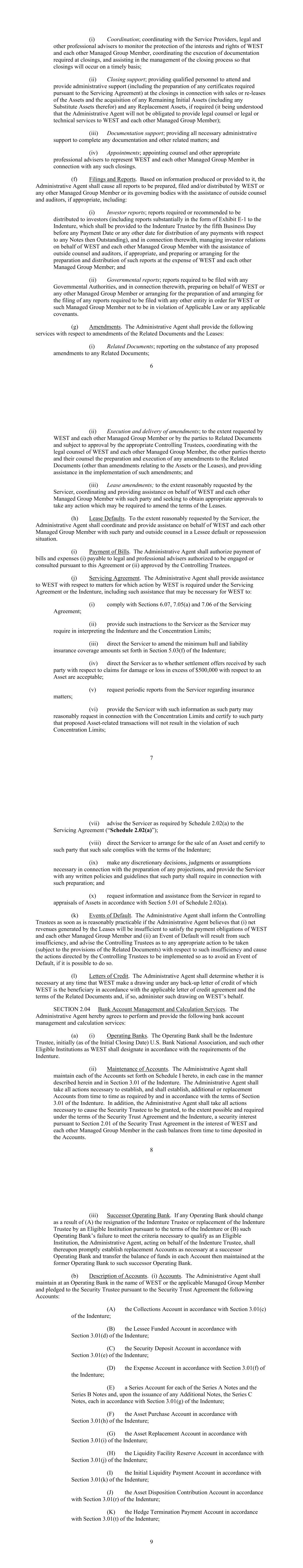6 (i) Coordination; coordinating with the Service Providers, legal and other professional advisers to monitor the protection of the interests and rights of WEST and each other Managed Group Member, coordinating the execution of documentation required at closings, and assisting in the management of the closing process so that closings will occur on a timely basis; (ii) Closing support; providing qualified personnel to attend and provide administrative support (including the preparation of any certificates required pursuant to the Servicing Agreement) at the closings in connection with sales or re-leases of the Assets and the acquisition of any Remaining Initial Assets (including any Substitute Assets therefor) and any Replacement Assets, if required (it being understood that the Administrative Agent will not be obligated to provide legal counsel or legal or technical services to WEST and each other Managed Group Member); (iii) Documentation support; providing all necessary administrative support to complete any documentation and other related matters; and (iv) Appointments; appointing counsel and other appropriate professional advisers to represent WEST and each other Managed Group Member in connection with any such closings. (f) Filings and Reports. Based on information produced or provided to it, the Administrative Agent shall cause all reports to be prepared, filed and/or distributed by WEST or any other Managed Group Member or its governing bodies with the assistance of outside counsel and auditors, if appropriate, including: (i) Investor reports; reports required or recommended to be distributed to investors (including reports substantially in the form of Exhibit E-1 to the Indenture, which shall be provided to the Indenture Trustee by the fifth Business Day before any Payment Date or any other date for distribution of any payments with respect to any Notes then Outstanding), and in connection therewith, managing investor relations on behalf of WEST and each other Managed Group Member with the assistance of outside counsel and auditors, if appropriate, and preparing or arranging for the preparation and distribution of such reports at the expense of WEST and each other Managed Group Member; and (ii) Governmental reports; reports required to be filed with any Governmental Authorities, and in connection therewith, preparing on behalf of WEST or any other Managed Group Member or arranging for the preparation of and arranging for the filing of any reports required to be filed with any other entity in order for WEST or such Managed Group Member not to be in violation of Applicable Law or any applicable covenants. (g) Amendments. The Administrative Agent shall provide the following services with respect to amendments of the Related Documents and the Leases: (i) Related Documents; reporting on the substance of any proposed amendments to any Related Documents; 7 (ii) Execution and delivery of amendments; to the extent requested by WEST and each other Managed Group Member or by the parties to Related Documents and subject to approval by the appropriate Controlling Trustees, coordinating with the legal counsel of WEST and each other Managed Group Member, the other parties thereto and their counsel the preparation and execution of any amendments to the Related Documents (other than amendments relating to the Assets or the Leases), and providing assistance in the implementation of such amendments; and (iii) Lease amendments; to the extent reasonably requested by the Servicer, coordinating and providing assistance on behalf of WEST and each other Managed Group Member with such party and seeking to obtain appropriate approvals to take any action which may be required to amend the terms of the Leases. (h) Lease Defaults. To the extent reasonably requested by the Servicer, the Administrative Agent shall coordinate and provide assistance on behalf of WEST and each other Managed Group Member with such party and outside counsel in a Lessee default or repossession situation. (i) Payment of Bills. The Administrative Agent shall authorize payment of bills and expenses (i) payable to legal and professional advisers authorized to be engaged or consulted pursuant to this Agreement or (ii) approved by the Controlling Trustees. (j) Servicing Agreement. The Administrative Agent shall provide assistance to WEST with respect to matters for which action by WEST is required under the Servicing Agreement or the Indenture, including such assistance that may be necessary for WEST to: (i) comply with Sections 6.07, 7.05(a) and 7.06 of the Servicing Agreement; (ii) provide such instructions to the Servicer as the Servicer may require in interpreting the Indenture and the Concentration Limits; (iii) direct the Servicer to amend the minimum hull and liability insurance coverage amounts set forth in Section 5.03(f) of the Indenture; (iv) direct the Servicer as to whether settlement offers received by such party with respect to claims for damage or loss in excess of $500,000 with respect to an Asset are acceptable; (v) request periodic reports from the Servicer regarding insurance matters; (vi) provide the Servicer with such information as such party may reasonably request in connection with the Concentration Limits and certify to such party that proposed Asset-related transactions will not result in the violation of such Concentration Limits; 8 (vii) advise the Servicer as required by Schedule 2.02(a) to the Servicing Agreement (“Schedule 2.02(a)”); (viii) direct the Servicer to arrange for the sale of an Asset and certify to such party that such sale complies with the terms of the Indenture; (ix) make any discretionary decisions, judgments or assumptions necessary in connection with the preparation of any projections, and provide the Servicer with any written policies and guidelines that such party shall require in connection with such preparation; and (x) request information and assistance from the Servicer in regard 