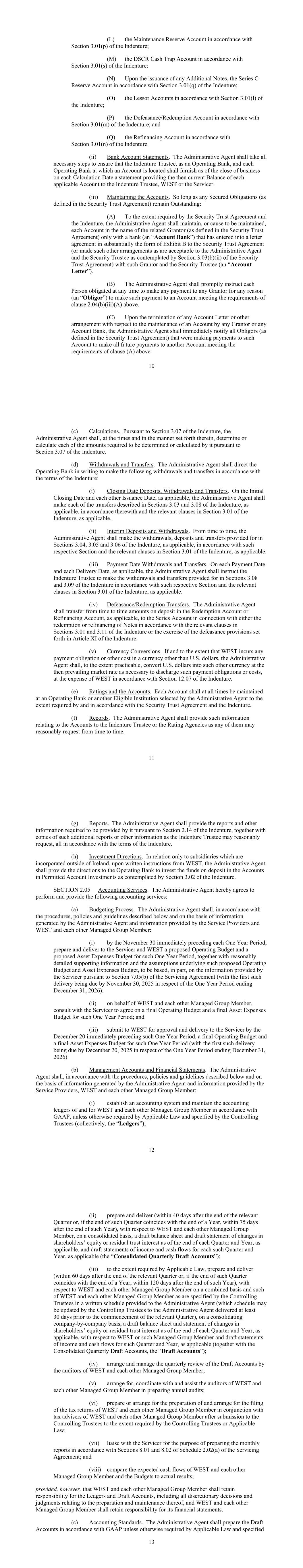 10 (L) the Maintenance Reserve Account in accordance with Section 3.01(p) of the Indenture; (M) the DSCR Cash Trap Account in accordance with Section 3.01(s) of the Indenture; (N) Upon the issuance of any Additional Notes, the Series C Reserve Account in accordance with Section 3.01(q) of the Indenture; (O) the Lessor Accounts in accordance with Section 3.01(l) of the Indenture; (P) the Defeasance/Redemption Account in accordance with Section 3.01(m) of the Indenture; and (Q) the Refinancing Account in accordance with Section 3.01(n) of the Indenture. (ii) Bank Account Statements. The Administrative Agent shall take all necessary steps to ensure that the Indenture Trustee, as an Operating Bank, and each Operating Bank at which an Account is located shall furnish as of the close of business on each Calculation Date a statement providing the then current Balance of each applicable Account to the Indenture Trustee, WEST or the Servicer. (iii) Maintaining the Accounts. So long as any Secured Obligations (as defined in the Security Trust Agreement) remain Outstanding: (A) To the extent required by the Security Trust Agreement and the Indenture, the Administrative Agent shall maintain, or cause to be maintained, each Account in the name of the related Grantor (as defined in the Security Trust Agreement) only with a bank (an “Account Bank”) that has entered into a letter agreement in substantially the form of Exhibit B to the Security Trust Agreement (or made such other arrangements as are acceptable to the Administrative Agent and the Security Trustee as contemplated by Section 3.03(b)(ii) of the Security Trust Agreement) with such Grantor and the Security Trustee (an “Account Letter”). (B) The Administrative Agent shall promptly instruct each Person obligated at any time to make any payment to any Grantor for any reason (an “Obligor”) to make such payment to an Account meeting the requirements of clause 2.04(b)(iii)(A) above. (C) Upon the termination of any Account Letter or other arrangement with respect to the maintenance of an Account by any Grantor or any Account Bank, the Administrative Agent shall immediately notify all Obligors (as defined in the Security Trust Agreement) that were making payments to such Account to make all future payments to another Account meeting the requirements of clause (A) above. 11 (c) Calculations. Pursuant to Section 3.07 of the Indenture, the Administrative Agent shall, at the times and in the manner set forth therein, determine or calculate each of the amounts required to be determined or calculated by it pursuant to Section 3.07 of the Indenture. (d) Withdrawals and Transfers. The Administrative Agent shall direct the Operating Bank in writing to make the following withdrawals and transfers in accordance with the terms of the Indenture: (i) Closing Date Deposits, Withdrawals and Transfers. On the Initial Closing Date and each other Issuance Date, as applicable, the Administrative Agent shall make each of the transfers described in Sections 3.03 and 3.08 of the Indenture, as applicable, in accordance therewith and the relevant clauses in Section 3.01 of the Indenture, as applicable. (ii) Interim Deposits and Withdrawals. From time to time, the Administrative Agent shall make the withdrawals, deposits and transfers provided for in Sections 3.04, 3.05 and 3.06 of the Indenture, as applicable, in accordance with such respective Section and the relevant clauses in Section 3.01 of the Indenture, as applicable. (iii) Payment Date Withdrawals and Transfers. On each Payment Date and each Delivery Date, as applicable, the Administrative Agent shall instruct the Indenture Trustee to make the withdrawals and transfers provided for in Sections 3.08 and 3.09 of the Indenture in accordance with such respective Section and the relevant clauses in Section 3.01 of the Indenture, as applicable. (iv) Defeasance/Redemption Transfers. The Administrative Agent shall transfer from time to time amounts on deposit in the Redemption Account or Refinancing Account, as applicable, to the Series Account in connection with either the redemption or refinancing of Notes in accordance with the relevant clauses in Sections 3.01 and 3.11 of the Indenture or the exercise of the defeasance provisions set forth in Article XI of the Indenture. (v) Currency Conversions. If and to the extent that WEST incurs any payment obligation or other cost in a currency other than U.S. dollars, the Administrative Agent shall, to the extent practicable, convert U.S. dollars into such other currency at the then prevailing market rate as necessary to discharge such payment obligations or costs, at the expense of WEST in accordance with Section 12.07 of the Indenture. (e) Ratings and the Accounts. Each Account shall at all times be maintained at an Operating Bank or another Eligible Institution selected by the Administrative Agent to the extent required by and in accordance with the Security Trust Agreement and the Indenture. (f) Records. The Administrative Agent shall provide such information relating to the Accounts to the Indenture Trustee or the Rating Agencies as any of them may reasonably request from time to time. 12 (g) Reports. The Administrative Agent shall provide the reports and other information required to be provided by it pursuant to Section 2.14 of the Indenture, together with copies of such additional reports or other information as the Indenture Trustee may reasonably request, all in accordance with the terms of the Indenture. (h) Investment Directions. In relation only to subsidiaries which are incorporated outside of Ireland, upon written instructions from WEST, the Administrative Agent shall provide the directions to the Operating Bank to invest the funds on deposit in the Accounts in Permitted Account Investments as contemplated by Section 3.02 of the Indenture. SECTION 2.05 Accounting Services. The Administrative Agent hereby agrees to perform and provide the following account