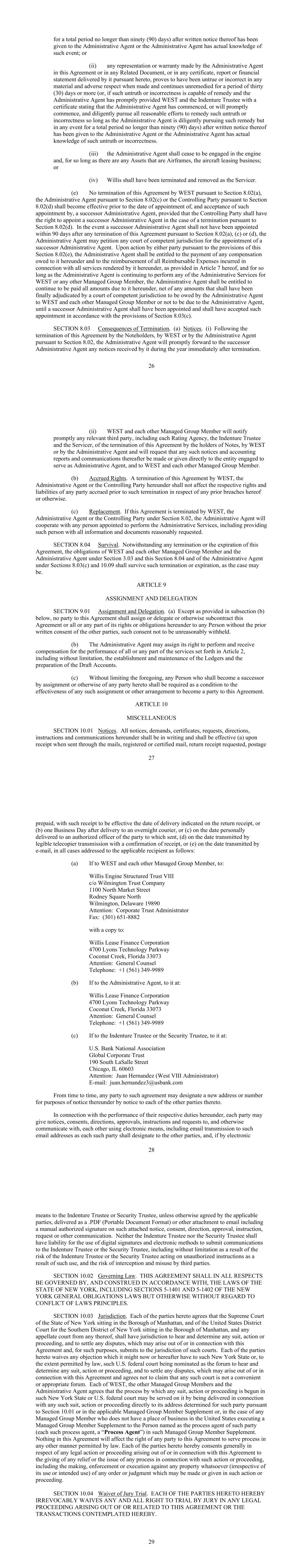 26 for a total period no longer than ninety (90) days) after written notice thereof has been given to the Administrative Agent or the Administrative Agent has actual knowledge of such event; or (ii) any representation or warranty made by the Administrative Agent in this Agreement or in any Related Document, or in any certificate, report or financial statement delivered by it pursuant hereto, proves to have been untrue or incorrect in any material and adverse respect when made and continues unremedied for a period of thirty (30) days or more (or, if such untruth or incorrectness is capable of remedy and the Administrative Agent has promptly provided WEST and the Indenture Trustee with a certificate stating that the Administrative Agent has commenced, or will promptly commence, and diligently pursue all reasonable efforts to remedy such untruth or incorrectness so long as the Administrative Agent is diligently pursuing such remedy but in any event for a total period no longer than ninety (90) days) after written notice thereof has been given to the Administrative Agent or the Administrative Agent has actual knowledge of such untruth or incorrectness. (iii) the Administrative Agent shall cease to be engaged in the engine and, for so long as there are any Assets that are Airframes, the aircraft leasing business; or (iv) Willis shall have been terminated and removed as the Servicer. (e) No termination of this Agreement by WEST pursuant to Section 8.02(a), the Administrative Agent pursuant to Section 8.02(c) or the Controlling Party pursuant to Section 8.02(d) shall become effective prior to the date of appointment of, and acceptance of such appointment by, a successor Administrative Agent, provided that the Controlling Party shall have the right to appoint a successor Administrative Agent in the case of a termination pursuant to Section 8.02(d). In the event a successor Administrative Agent shall not have been appointed within 90 days after any termination of this Agreement pursuant to Section 8.02(a), (c) or (d), the Administrative Agent may petition any court of competent jurisdiction for the appointment of a successor Administrative Agent. Upon action by either party pursuant to the provisions of this Section 8.02(e), the Administrative Agent shall be entitled to the payment of any compensation owed to it hereunder and to the reimbursement of all Reimbursable Expenses incurred in connection with all services rendered by it hereunder, as provided in Article 7 hereof, and for so long as the Administrative Agent is continuing to perform any of the Administrative Services for WEST or any other Managed Group Member, the Administrative Agent shall be entitled to continue to be paid all amounts due to it hereunder, net of any amounts that shall have been finally adjudicated by a court of competent jurisdiction to be owed by the Administrative Agent to WEST and each other Managed Group Member or not to be due to the Administrative Agent, until a successor Administrative Agent shall have been appointed and shall have accepted such appointment in accordance with the provisions of Section 8.03(c). SECTION 8.03 Consequences of Termination. (a) Notices. (i) Following the termination of this Agreement by the Noteholders, by WEST or by the Administrative Agent pursuant to Section 8.02, the Administrative Agent will promptly forward to the successor Administrative Agent any notices received by it during the year immediately after termination. 27 (ii) WEST and each other Managed Group Member will notify promptly any relevant third party, including each Rating Agency, the Indenture Trustee and the Servicer, of the termination of this Agreement by the holders of Notes, by WEST or by the Administrative Agent and will request that any such notices and accounting reports and communications thereafter be made or given directly to the entity engaged to serve as Administrative Agent, and to WEST and each other Managed Group Member. (b) Accrued Rights. A termination of this Agreement by WEST, the Administrative Agent or the Controlling Party hereunder shall not affect the respective rights and liabilities of any party accrued prior to such termination in respect of any prior breaches hereof or otherwise. (c) Replacement. If this Agreement is terminated by WEST, the Administrative Agent or the Controlling Party under Section 8.02, the Administrative Agent will cooperate with any person appointed to perform the Administrative Services, including providing such person with all information and documents reasonably requested. SECTION 8.04 Survival. Notwithstanding any termination or the expiration of this Agreement, the obligations of WEST and each other Managed Group Member and the Administrative Agent under Section 3.03 and this Section 8.04 and of the Administrative Agent under Sections 8.03(c) and 10.09 shall survive such termination or expiration, as the case may be. ARTICLE 9 ASSIGNMENT AND DELEGATION SECTION 9.01 Assignment and Delegation. (a) Except as provided in subsection (b) below, no party to this Agreement shall assign or delegate or otherwise subcontract this Agreement or all or any part of its rights or obligations hereunder to any Person without the prior written consent of the other parties, such consent not to be unreasonably withheld. (b) The Administrative Agent may assign its right to perform and receive compensation for the performance of all or any part of the services set forth in Article 2, including without limitation, the establishment and maintenance of the Ledgers and the preparation of the Draft Accounts. (c) Without limiting the foregoing, any Person who shall become a successor by assignment or otherwise of any party hereto shall be required as a condition to the effectiveness of any such assignment or other arrangement to become a party to this Agreement. ARTICLE 10 MISCELLANEOUS SECTION 10.01 Notices. All notices, demands, certificates, requests, directions, instructions and communicat