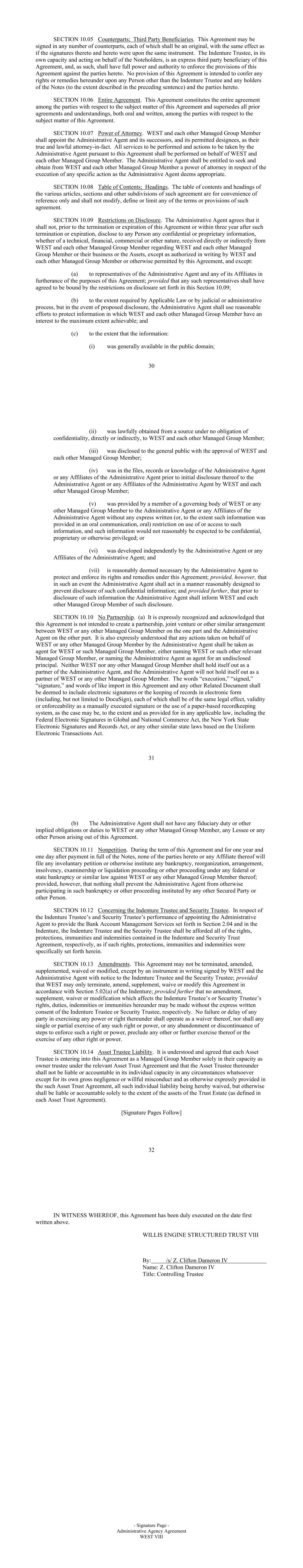 30 SECTION 10.05 Counterparts; Third Party Beneficiaries. This Agreement may be signed in any number of counterparts, each of which shall be an original, with the same effect as if the signatures thereto and hereto were upon the same instrument. The Indenture Trustee, in its own capacity and acting on behalf of the Noteholders, is an express third party beneficiary of this Agreement, and, as such, shall have full power and authority to enforce the provisions of this Agreement against the parties hereto. No provision of this Agreement is intended to confer any rights or remedies hereunder upon any Person other than the Indenture Trustee and any holders of the Notes (to the extent described in the preceding sentence) and the parties hereto. SECTION 10.06 Entire Agreement. This Agreement constitutes the entire agreement among the parties with respect to the subject matter of this Agreement and supersedes all prior agreements and understandings, both oral and written, among the parties with respect to the subject matter of this Agreement. SECTION 10.07 Power of Attorney. WEST and each other Managed Group Member shall appoint the Administrative Agent and its successors, and its permitted designees, as their true and lawful attorney-in-fact. All services to be performed and actions to be taken by the Administrative Agent pursuant to this Agreement shall be performed on behalf of WEST and each other Managed Group Member. The Administrative Agent shall be entitled to seek and obtain from WEST and each other Managed Group Member a power of attorney in respect of the execution of any specific action as the Administrative Agent deems appropriate. SECTION 10.08 Table of Contents; Headings. The table of contents and headings of the various articles, sections and other subdivisions of such agreement are for convenience of reference only and shall not modify, define or limit any of the terms or provisions of such agreement. SECTION 10.09 Restrictions on Disclosure. The Administrative Agent agrees that it shall not, prior to the termination or expiration of this Agreement or within three year after such termination or expiration, disclose to any Person any confidential or proprietary information, whether of a technical, financial, commercial or other nature, received directly or indirectly from WEST and each other Managed Group Member regarding WEST and each other Managed Group Member or their business or the Assets, except as authorized in writing by WEST and each other Managed Group Member or otherwise permitted by this Agreement, and except: (a) to representatives of the Administrative Agent and any of its Affiliates in furtherance of the purposes of this Agreement; provided that any such representatives shall have agreed to be bound by the restrictions on disclosure set forth in this Section 10.09; (b) to the extent required by Applicable Law or by judicial or administrative process, but in the event of proposed disclosure, the Administrative Agent shall use reasonable efforts to protect information in which WEST and each other Managed Group Member have an interest to the maximum extent achievable; and (c) to the extent that the information: (i) was generally available in the public domain; 31 (ii) was lawfully obtained from a source under no obligation of confidentiality, directly or indirectly, to WEST and each other Managed Group Member; (iii) was disclosed to the general public with the approval of WEST and each other Managed Group Member; (iv) was in the files, records or knowledge of the Administrative Agent or any Affiliates of the Administrative Agent prior to initial disclosure thereof to the Administrative Agent or any Affiliates of the Administrative Agent by WEST and each other Managed Group Member; (v) was provided by a member of a governing body of WEST or any other Managed Group Member to the Administrative Agent or any Affiliates of the Administrative Agent without any express written (or, to the extent such information was provided in an oral communication, oral) restriction on use of or access to such information, and such information would not reasonably be expected to be confidential, proprietary or otherwise privileged; or (vi) was developed independently by the Administrative Agent or any Affiliates of the Administrative Agent; and (vii) is reasonably deemed necessary by the Administrative Agent to protect and enforce its rights and remedies under this Agreement; provided, however, that in such an event the Administrative Agent shall act in a manner reasonably designed to prevent disclosure of such confidential information; and provided further, that prior to disclosure of such information the Administrative Agent shall inform WEST and each other Managed Group Member of such disclosure. SECTION 10.10 No Partnership. (a) It is expressly recognized and acknowledged that this Agreement is not intended to create a partnership, joint venture or other similar arrangement between WEST or any other Managed Group Member on the one part and the Administrative Agent on the other part. It is also expressly understood that any actions taken on behalf of WEST or any other Managed Group Member by the Administrative Agent shall be taken as agent for WEST or such Managed Group Member, either naming WEST or such other relevant Managed Group Member, or naming the Administrative Agent as agent for an undisclosed principal. Neither WEST nor any other Managed Group Member shall hold itself out as a partner of the Administrative Agent, and the Administrative Agent will not hold itself out as a partner of WEST or any other Managed Group Member. The words “execution,” “signed,” “signature,” and words of like import in this Agreement and any other Related Document shall be deemed to include electronic signatures or the keeping of records in electronic form (including, but not limited to DocuSign), each of which shall be of the same legal effect, validity or enforceability as a manually execu