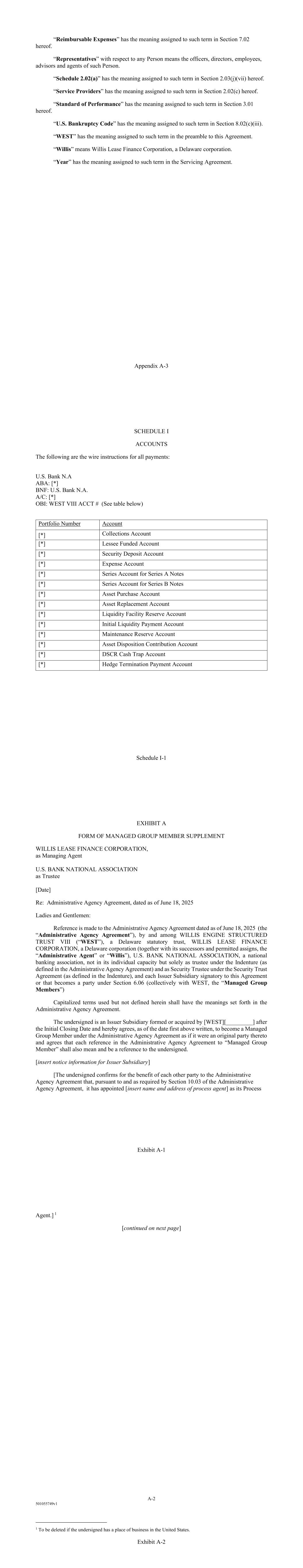 Appendix A-3 “Reimbursable Expenses” has the meaning assigned to such term in Section 7.02 hereof. “Representatives” with respect to any Person means the officers, directors, employees, advisors and agents of such Person. “Schedule 2.02(a)” has the meaning assigned to such term in Section 2.03(j)(vii) hereof. “Service Providers” has the meaning assigned to such term in Section 2.02(c) hereof. “Standard of Performance” has the meaning assigned to such term in Section 3.01 hereof. “U.S. Bankruptcy Code” has the meaning assigned to such term in Section 8.02(c)(iii). “WEST” has the meaning assigned to such term in the preamble to this Agreement. “Willis” means Willis Lease Finance Corporation, a Delaware corporation. “Year” has the meaning assigned to such term in the Servicing Agreement. Schedule I-1 SCHEDULE I ACCOUNTS The following are the wire instructions for all payments: U.S. Bank N.A ABA: [*] BNF: U.S. Bank N.A. A/C: [*] OBI: WEST VIII ACCT # (See table below) Portfolio Number Account [*] Collections Account [*] Lessee Funded Account [*] Security Deposit Account [*] Expense Account [*] Series Account for Series A Notes [*] Series Account for Series B Notes [*] Asset Purchase Account [*] Asset Replacement Account [*] Liquidity Facility Reserve Account [*] Initial Liquidity Payment Account [*] Maintenance Reserve Account [*] Asset Disposition Contribution Account [*] DSCR Cash Trap Account [*] Hedge Termination Payment Account Exhibit A-1 EXHIBIT A FORM OF MANAGED GROUP MEMBER SUPPLEMENT WILLIS LEASE FINANCE CORPORATION, as Managing Agent U.S. BANK NATIONAL ASSOCIATION as Trustee [Date] Re: Administrative Agency Agreement, dated as of June 18, 2025 Ladies and Gentlemen: Reference is made to the Administrative Agency Agreement dated as of June 18, 2025 (the “Administrative Agency Agreement”), by and among WILLIS ENGINE STRUCTURED TRUST VIII (“WEST”), a Delaware statutory trust, WILLIS LEASE FINANCE CORPORATION, a Delaware corporation (together with its successors and permitted assigns, the “Administrative Agent” or “Willis”), U.S. BANK NATIONAL ASSOCIATION, a national banking association, not in its individual capacity but solely as trustee under the Indenture (as defined in the Administrative Agency Agreement) and as Security Trustee under the Security Trust Agreement (as defined in the Indenture), and each Issuer Subsidiary signatory to this Agreement or that becomes a party under Section 6.06 (collectively with WEST, the “Managed Group Members”) Capitalized terms used but not defined herein shall have the meanings set forth in the Administrative Agency Agreement. The undersigned is an Issuer Subsidiary formed or acquired by [WEST][_________] after the Initial Closing Date and hereby agrees, as of the date first above written, to become a Managed Group Member under the Administrative Agency Agreement as if it were an original party thereto and agrees that each reference in the Administrative Agency Agreement to “Managed Group Member” shall also mean and be a reference to the undersigned. [insert notice information for Issuer Subsidiary] [The undersigned confirms for the benefit of each other party to the Administrative Agency Agreement that, pursuant to and as required by Section 10.03 of the Administrative Agency Agreement, it has appointed [insert name and address of process agent] as its Process Exhibit A-2 Agent.] 1 [continued on next page] A-2 501055749v1 1 To be deleted if the undersigned has a place of business in the United States.