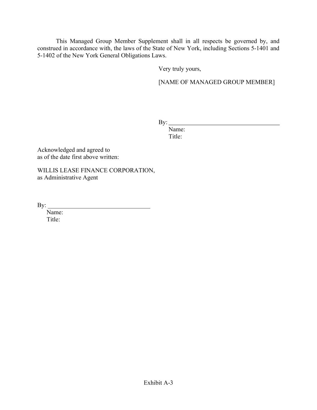 Exhibit A-3 This Managed Group Member Supplement shall in all respects be governed by, and construed in accordance with, the laws of the State of New York, including Sections 5-1401 and 5-1402 of the New York General Obligations Laws. Very truly yours, [NAME OF MANAGED GROUP MEMBER] By: Name: Title: Acknowledged and agreed to as of the date first above written: WILLIS LEASE FINANCE CORPORATION, as Administrative Agent By: _________________________________ Name: Title: