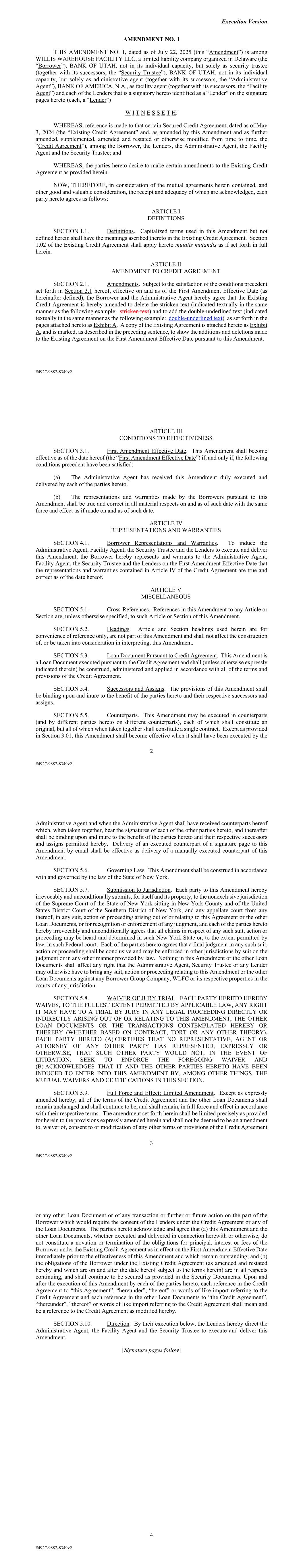 Execution Version #4927-9882-8349v2 AMENDMENT NO. 1 THIS AMENDMENT NO. 1, dated as of July 22, 2025 (this “Amendment”) is among WILLIS WAREHOUSE FACILITY LLC, a limited liability company organized in Delaware (the “Borrower”), BANK OF UTAH, not in its individual capacity, but solely as security trustee (together with its successors, the “Security Trustee”), BANK OF UTAH, not in its individual capacity, but solely as administrative agent (together with its successors, the “Administrative Agent”), BANK OF AMERICA, N.A., as facility agent (together with its successors, the “Facility Agent”) and each of the Lenders that is a signatory hereto identified as a “Lender” on the signature pages hereto (each, a “Lender”) W I T N E S S E T H: WHEREAS, reference is made to that certain Secured Credit Agreement, dated as of May 3, 2024 (the “Existing Credit Agreement” and, as amended by this Amendment and as further amended, supplemented, amended and restated or otherwise modified from time to time, the “Credit Agreement”), among the Borrower, the Lenders, the Administrative Agent, the Facility Agent and the Security Trustee; and WHEREAS, the parties hereto desire to make certain amendments to the Existing Credit Agreement as provided herein. NOW, THEREFORE, in consideration of the mutual agreements herein contained, and other good and valuable consideration, the receipt and adequacy of which are acknowledged, each party hereto agrees as follows: ARTICLE I DEFINITIONS SECTION 1.1. Definitions. Capitalized terms used in this Amendment but not defined herein shall have the meanings ascribed thereto in the Existing Credit Agreement. Section 1.02 of the Existing Credit Agreement shall apply hereto mutatis mutandis as if set forth in full herein. ARTICLE II AMENDMENT TO CREDIT AGREEMENT SECTION 2.1. Amendments. Subject to the satisfaction of the conditions precedent set forth in Section 3.1 hereof, effective on and as of the First Amendment Effective Date (as hereinafter defined), the Borrower and the Administrative Agent hereby agree that the Existing Credit Agreement is hereby amended to delete the stricken text (indicated textually in the same manner as the following example: stricken text) and to add the double-underlined text (indicated textually in the same manner as the following example: double-underlined text) as set forth in the pages attached hereto as Exhibit A. A copy of the Existing Agreement is attached hereto as Exhibit A, and is marked, as described in the preceding sentence, to show the additions and deletions made to the Existing Agreement on the First Amendment Effective Date pursuant to this Amendment. 2 #4927-9882-8349v2 ARTICLE III CONDITIONS TO EFFECTIVENESS SECTION 3.1. First Amendment Effective Date. This Amendment shall become effective as of the date hereof (the “First Amendment Effective Date”) if, and only if, the following conditions precedent have been satisfied: (a) The Administrative Agent has received this Amendment duly executed and delivered by each of the parties hereto. (b) The representations and warranties made by the Borrowers pursuant to this Amendment shall be true and correct in all material respects on and as of such date with the same force and effect as if made on and as of such date. ARTICLE IV REPRESENTATIONS AND WARRANTIES SECTION 4.1. Borrower Representations and Warranties. To induce the Administrative Agent, Facility Agent, the Security Trustee and the Lenders to execute and deliver this Amendment, the Borrower hereby represents and warrants to the Administrative Agent, Facility Agent, the Security Trustee and the Lenders on the First Amendment Effective Date that the representations and warranties contained in Article IV of the Credit Agreement are true and correct as of the date hereof. ARTICLE V MISCELLANEOUS SECTION 5.1. Cross-References. References in this Amendment to any Article or Section are, unless otherwise specified, to such Article or Section of this Amendment. SECTION 5.2. Headings. Article and Section headings used herein are for convenience of reference only, are not part of this Amendment and shall not affect the construction of, or be taken into consideration in interpreting, this Amendment. SECTION 5.3. Loan Document Pursuant to Credit Agreement. This Amendment is a Loan Document executed pursuant to the Credit Agreement and shall (unless otherwise expressly indicated therein) be construed, administered and applied in accordance with all of the terms and provisions of the Credit Agreement. SECTION 5.4. Successors and Assigns. The provisions of this Amendment shall be binding upon and inure to the benefit of the parties hereto and their respective successors and assigns. SECTION 5.5. Counterparts. This Amendment may be executed in counterparts (and by different parties hereto on different counterparts), each of which shall constitute an original, but all of which when taken together shall constitute a single contract. Except as provided in Section 3.01, this Amendment shall become effective when it shall have been executed by the 3 #4927-9882-8349v2 Administrative Agent and when the Administrative Agent shall have received counterparts hereof which, when taken together, bear the signatures of each of the other parties hereto, and thereafter shall be binding upon and inure to the benefit of the parties hereto and their respective successors and assigns permitted hereby. Delivery of an executed counterpart of a signature page to this Amendment by email shall be effective as delivery of a manually executed counterpart of this Amendment. SECTION 5.6. Governing Law. This Amendment shall be construed in accordance with and governed by the law of the State of New York. SECTION 5.7. Submission to Jurisdiction. Each party to this Amendment hereby irrevocably and unconditionally submits, for itself and its property, to the nonexclusive jurisdiction of the Supreme Court of the State of New York sitting in N