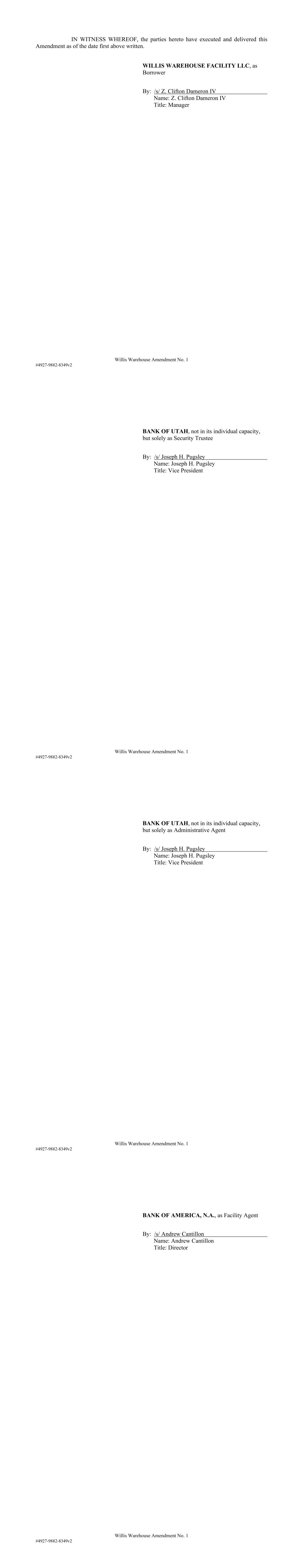 Willis Warehouse Amendment No. 1 #4927-9882-8349v2 IN WITNESS WHEREOF, the parties hereto have executed and delivered this Amendment as of the date first above written. WILLIS WAREHOUSE FACILITY LLC, as Borrower By: /s/ Z. Clifton Dameron IV Name: Z. Clifton Dameron IV Title: Manager Willis Warehouse Amendment No. 1 #4927-9882-8349v2 BANK OF UTAH, not in its individual capacity, but solely as Security Trustee By: /s/ Joseph H. Pugsley Name: Joseph H. Pugsley Title: Vice President Willis Warehouse Amendment No. 1 #4927-9882-8349v2 BANK OF UTAH, not in its individual capacity, but solely as Administrative Agent By: /s/ Joseph H. Pugsley Name: Joseph H. Pugsley Title: Vice President Willis Warehouse Amendment No. 1 #4927-9882-8349v2 BANK OF AMERICA, N.A., as Facility Agent By: /s/ Andrew Cantillon Name: Andrew Cantillon Title: Director