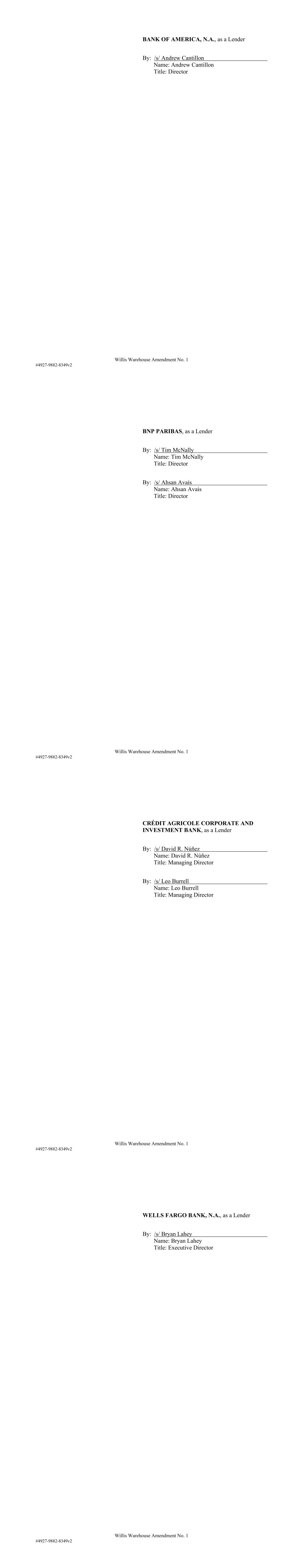 Willis Warehouse Amendment No. 1 #4927-9882-8349v2 BANK OF AMERICA, N.A., as a Lender By: /s/ Andrew Cantillon Name: Andrew Cantillon Title: Director Willis Warehouse Amendment No. 1 #4927-9882-8349v2 BNP PARIBAS, as a Lender By: /s/ Tim McNally Name: Tim McNally Title: Director By: /s/ Ahsan Avais Name: Ahsan Avais Title: Director Willis Warehouse Amendment No. 1 #4927-9882-8349v2 CRÉDIT AGRICOLE CORPORATE AND INVESTMENT BANK, as a Lender By: /s/ David R. Núñez Name: David R. Núñez Title: Managing Director By: /s/ Leo Burrell Name: Leo Burrell Title: Managing Director Willis Warehouse Amendment No. 1 #4927-9882-8349v2 WELLS FARGO BANK, N.A., as a Lender By: /s/ Bryan Lahey Name: Bryan Lahey Title: Executive Director