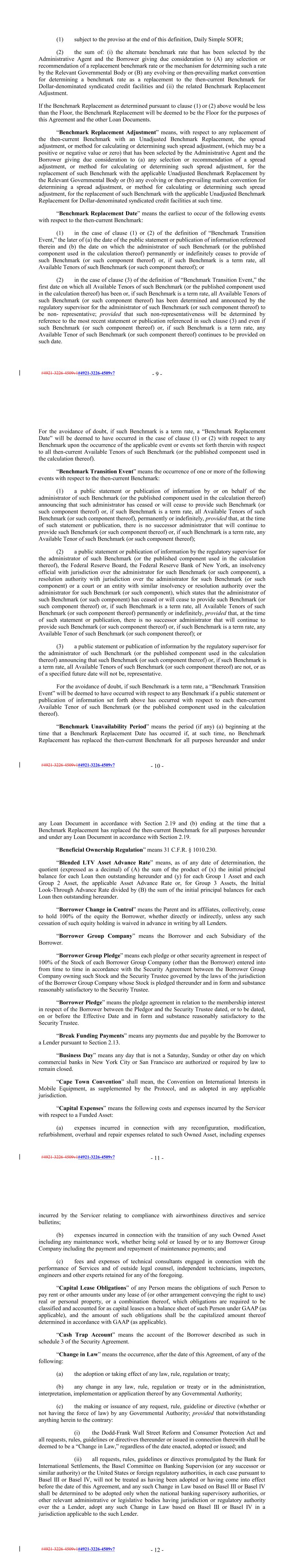 - ii -#4921-3226-4509v1#4921-3226-4509v7 Section 4.02 Authorization; Enforceability 8283 Section 4.03 Governmental Approvals; No Conflicts 8284 Section 4.04 Litigation 8284 Section 4.05 Compliance with Laws and Agreements 8384 Section 4.06 Event of Default 8384 Section 4.07 Use of Credit 8384 Section 4.08 Special Purpose Status, Etc 8385 Section 4.09 Investment Company Status; Covered Fund 8385 Section 4.10 ERISA 8385 Section 4.11 OFAC; AML Laws; Anti-Corruption Laws and Sanctions 8485 Section 4.12 Title; Collateral 8486 Section 4.13 Employees 8486 Section 4.14 No Filing or Stamp Taxes 8486 Section 4.15 Indebtedness 8486 Section 4.16 GAAP 8586 ARTICLE V INFORMATION COVENANTS AND APPRAISALS 8586 Section 5.01 Financial Statements and Other Information 8586 Section 5.02 Appraisals; Maintenance Annual Estimates 8789 ARTICLE VI AFFIRMATIVE COVENANTS 8890 Section 6.01. Existence; Conduct and Authorizations 8890 Section 6.02. Payment of Obligations 8990 Section 6.03. Maintenance of Properties; Insurance 8991 Section 6.04. Books and Records 9192 Section 6.05. Compliance with Laws; Maintenance of Permits 9193 Section 6.06. Use of Proceeds 9294 Section 6.07. Hedging Agreements 9294 Section 6.08. Further Assurances 9294 Section 6.09. Governmental Approvals 9395 Section 6.10. ERISA 9395 Section 6.11. Payment of Collections into Collections Account 9395 Section 6.12. Minimum Provisions 9495 Section 6.13. Opinions 9495 Section 6.14. Registration of Aircraft 9496 Section 6.15. Sanctions; AML 9496 - iii -#4921-3226-4509v1#4921-3226-4509v7 Section 6.16. Compliance and Agreement 9597 Section 6.17. Maintenance of Separate Existence 9597 Section 6.18. Bankruptcy and Insolvency; Corporate Governance 9798 Section 6.19. Taxes 9799 Section 6.20. Security Deposit Reserve Account, Maintenance Reserve Account and Liquidity Account 9899 ARTICLE VII FACILITY TESTS 98100 Section 7.01. LTV Test 98100 Section 7.02. DSCR 99100 Section 7.04. Weighted Average Remaining Lease Term 99101 Section 7.05. Additional Collateral 100101 ARTICLE VIII NEGATIVE COVENANTS 101102 Section 8.01. Indebtedness 101102 Section 8.02. Liens 101103 Section 8.03. Fundamental Changes 101103 Section 8.04. Investments 102104 Section 8.05. Restricted Payments 103105 Section 8.06. Transactions with Affiliates 103105 Section 8.07. Restrictive Agreements 104105 Section 8.08. Operating Covenants 105106 Section 8.09. Sales of Assets 106107 Section 8.10. Modifications of Certain Documents 106107 Section 8.11. Limitation on Business Activities 107108 Section 8.12. Limitations on Leases 108109 Section 8.13. Non-Petition 108109 Section 8.14. Changes in Fiscal Year 108109 Section 8.15. Investment Company Status 108110 Section 8.16. Protection of Security Interest of the Lenders 108110 Section 8.17. Securities Act 108110 ARTICLE IX ACCOUNTS; PRIORITY OF PAYMENTS 109111 ARTICLE X EVENTS OF DEFAULT 110111 Section 10.01. Events of Default 110111 Section 10.02. Remedies 112113 - iv -#4921-3226-4509v1#4921-3226-4509v7 ARTICLE XI THE ADMINISTRATIVE AGENT AND SECURITY TRUSTEE 113114 Section 11.01. Appointment 113114 Section 11.02. Exculpatory Provisions 113115 Section 11.03. Reliance 114116 Section 11.04. Delegation 115116 Section 11.05. Resignation of Administrative Agent or Security Trustee 115116 Section 11.06. Removal of Administrative Agent or Security Trustee 116117 Section 11.07. No Representations or Warranties 116117 Section 11.08. Security Trustee and Administrative Agent 117119 ARTICLE XII MISCELLANEOUS 120122 Section 12.01. Notices 120122 Section 12.02. Waivers; Amendments 121123 Section 12.03. Expenses; Indemnity; Damage Waiver 125126 Section 12.04. Successors and Assigns 126128 Section 12.05. Limited Recourse 129131 Section 12.06. Survival 130131 Section 12.07. Counterparts; Integration; Effectiveness 130131 Section 12.08. Severability 130132 Section 12.09. Right of Setoff 130132 Section 12.10. Governing Law; Jurisdiction; Service of Process; Etc 131132 Section 12.11. WAIVER OF JURY TRIAL 132133 Section 12.12. No Immunity 132133 Section 12.13. Judgment Currency 132134 Section 12.14. Use of English Language 133134 Section 12.15. Headings 133134 Section 12.16. Confidentiality 133135 Section 12.17. USA PATRIOT Act 134136 Section 12.18. Contractual Recognition of Bail-In 135136 SCHEDULE I COMMITMENTS AND LENDERS Schedule I-1 SCHEDULE II BORROWER GROUP COMPANIES Schedule II-1 SCHEDULE III FORM OF ASSIGNMENT AND ACCEPTANCE Schedule III-1 SCHEDULE IV FORM OF LOAN REQUEST Schedule IV-1 SCHEDULE V CONCENTRATION LIMITS Schedule V-1 - v -#4921-3226-4509v1#4921-3226-4509v7 SCHEDULE VI FORM OF PROMISSORY NOTE Schedule VI-1 SCHEDULE VII UNDERLYING OBLIGOR TIERS Schedule VII-1 SCHEDULE VIII ELIGIBILITY CRITERIA Schedule VIII-1 SCHEDULE IX MINIMUM PROVISIONS Schedule IX-1 SCHEDULE X INSURANCE PROVISIONS Schedule X-1 SCHEDULE XI FORM OF MONTHLY REPORT Schedule XI-1 SCHEDULE XII COMPETITORS Schedule XII-1