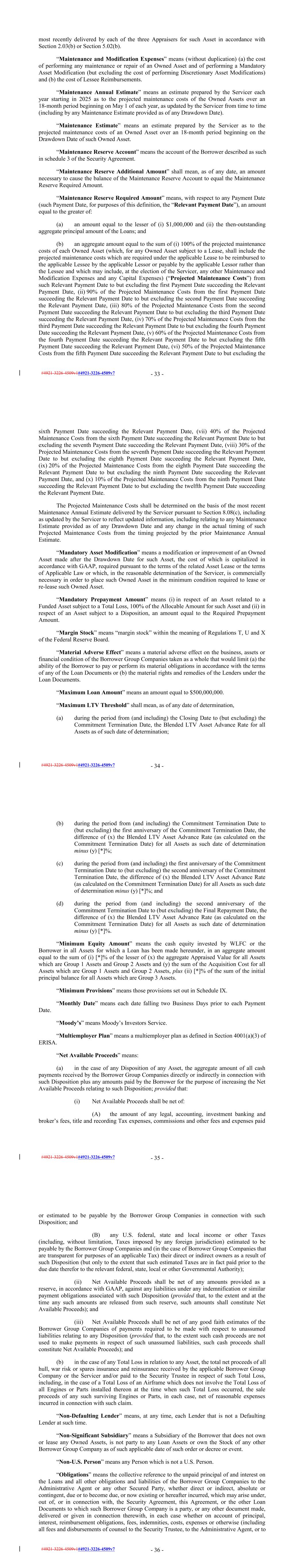 - 33 -#4921-3226-4509v1#4921-3226-4509v7 most recently delivered by each of the three Appraisers for such Asset in accordance with Section 2.03(b) or Section 5.02(b). “Maintenance and Modification Expenses” means (without duplication) (a) the cost of performing any maintenance or repair of an Owned Asset and of performing a Mandatory Asset Modification (but excluding the cost of performing Discretionary Asset Modifications) and (b) the cost of Lessee Reimbursements. “Maintenance Annual Estimate” means an estimate prepared by the Servicer each year starting in 2025 as to the projected maintenance costs of the Owned Assets over an 18-month period beginning on May 1 of each year, as updated by the Servicer from time to time (including by any Maintenance Estimate provided as of any Drawdown Date). “Maintenance Estimate” means an estimate prepared by the Servicer as to the projected maintenance costs of an Owned Asset over an 18-month period beginning on the Drawdown Date of such Owned Asset. “Maintenance Reserve Account” means the account of the Borrower described as such in schedule 3 of the Security Agreement. “Maintenance Reserve Additional Amount” shall mean, as of any date, an amount necessary to cause the balance of the Maintenance Reserve Account to equal the Maintenance Reserve Required Amount. “Maintenance Reserve Required Amount” means, with respect to any Payment Date (such Payment Date, for purposes of this definition, the “Relevant Payment Date”), an amount equal to the greater of: (a) an amount equal to the lesser of (i) $1,000,000 and (ii) the then-outstanding aggregate principal amount of the Loans; and (b) an aggregate amount equal to the sum of (i) 100% of the projected maintenance costs of each Owned Asset (which, for any Owned Asset subject to a Lease, shall include the projected maintenance costs which are required under the applicable Lease to be reimbursed to the applicable Lessee by the applicable Lessor or payable by the applicable Lessor rather than the Lessee and which may include, at the election of the Servicer, any other Maintenance and Modification Expenses and any Capital Expenses) (“Projected Maintenance Costs”) from such Relevant Payment Date to but excluding the first Payment Date succeeding the Relevant Payment Date, (ii) 90% of the Projected Maintenance Costs from the first Payment Date succeeding the Relevant Payment Date to but excluding the second Payment Date succeeding the Relevant Payment Date, (iii) 80% of the Projected Maintenance Costs from the second Payment Date succeeding the Relevant Payment Date to but excluding the third Payment Date succeeding the Relevant Payment Date, (iv) 70% of the Projected Maintenance Costs from the third Payment Date succeeding the Relevant Payment Date to but excluding the fourth Payment Date succeeding the Relevant Payment Date, (v) 60% of the Projected Maintenance Costs from the fourth Payment Date succeeding the Relevant Payment Date to but excluding the fifth Payment Date succeeding the Relevant Payment Date, (vi) 50% of the Projected Maintenance Costs from the fifth Payment Date succeeding the Relevant Payment Date to but excluding the - 34 -#4921-3226-4509v1#4921-3226-4509v7 sixth Payment Date succeeding the Relevant Payment Date, (vii) 40% of the Projected Maintenance Costs from the sixth Payment Date succeeding the Relevant Payment Date to but excluding the seventh Payment Date succeeding the Relevant Payment Date, (viii) 30% of the Projected Maintenance Costs from the seventh Payment Date succeeding the Relevant Payment Date to but excluding the eighth Payment Date succeeding the Relevant Payment Date, (ix) 20% of the Projected Maintenance Costs from the eighth Payment Date succeeding the Relevant Payment Date to but excluding the ninth Payment Date succeeding the Relevant Payment Date, and (x) 10% of the Projected Maintenance Costs from the ninth Payment Date succeeding the Relevant Payment Date to but excluding the twelfth Payment Date succeeding the Relevant Payment Date. The Projected Maintenance Costs shall be determined on the basis of the most recent Maintenance Annual Estimate delivered by the Servicer pursuant to Section 8.08(c), including as updated by the Servicer to reflect updated information, including relating to any Maintenance Estimate provided as of any Drawdown Date and any change in the actual timing of such Projected Maintenance Costs from the timing projected by the prior Maintenance Annual Estimate. “Mandatory Asset Modification” means a modification or improvement of an Owned Asset made after the Drawdown Date for such Asset, the cost of which is capitalized in accordance with GAAP, required pursuant to the terms of the related Asset Lease or the terms of Applicable Law or which, in the reasonable determination of the Servicer, is commercially necessary in order to place such Owned Asset in the minimum condition required to lease or re-lease such Owned Asset. “Mandatory Prepayment Amount” means (i) in respect of an Asset related to a Funded Asset subject to a Total Loss, 100% of the Allocable Amount for such Asset and (ii) in respect of an Asset subject to a Disposition, an amount equal to the Required Prepayment Amount. “Margin Stock” means “margin stock” within the meaning of Regulations T, U and X of the Federal Reserve Board. “Material Adverse Effect” means a material adverse effect on the business, assets or financial condition of the Borrower Group Companies taken as a whole that would limit (a) the ability of the Borrower to pay or perform its material obligations in accordance with the terms of any of the Loan Documents or (b) the material rights and remedies of the Lenders under the Loan Documents. “Maximum Loan Amount” means an amount equal to $500,000,000. “Maximum LTV Threshold” shall mean, as of any date of determination, (a) during the period from (and including) the Closing Date to (but excluding) the Commitm