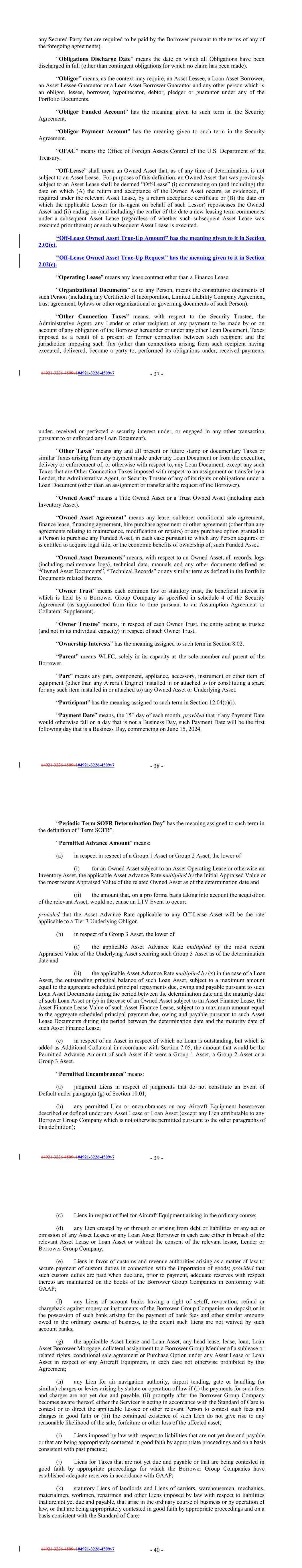 - 37 -#4921-3226-4509v1#4921-3226-4509v7 any Secured Party that are required to be paid by the Borrower pursuant to the terms of any of the foregoing agreements). “Obligations Discharge Date” means the date on which all Obligations have been discharged in full (other than contingent obligations for which no claim has been made). “Obligor” means, as the context may require, an Asset Lessee, a Loan Asset Borrower, an Asset Lessee Guarantor or a Loan Asset Borrower Guarantor and any other person which is an obligor, lessee, borrower, hypothecator, debtor, pledger or guarantor under any of the Portfolio Documents. “Obligor Funded Account” has the meaning given to such term in the Security Agreement. “Obligor Payment Account” has the meaning given to such term in the Security Agreement. “OFAC” means the Office of Foreign Assets Control of the U.S. Department of the Treasury. “Off-Lease” shall mean an Owned Asset that, as of any time of determination, is not subject to an Asset Lease. For purposes of this definition, an Owned Asset that was previously subject to an Asset Lease shall be deemed “Off-Lease” (i) commencing on (and including) the date on which (A) the return and acceptance of the Owned Asset occurs, as evidenced, if required under the relevant Asset Lease, by a return acceptance certificate or (B) the date on which the applicable Lessor (or its agent on behalf of such Lessor) repossesses the Owned Asset and (ii) ending on (and including) the earlier of the date a new leasing term commences under a subsequent Asset Lease (regardless of whether such subsequent Asset Lease was executed prior thereto) or such subsequent Asset Lease is executed. “Off-Lease Owned Asset True-Up Amount” has the meaning given to it in Section 2.02(c). “Off-Lease Owned Asset True-Up Request” has the meaning given to it in Section 2.02(c). “Operating Lease” means any lease contract other than a Finance Lease. “Organizational Documents” as to any Person, means the constitutive documents of such Person (including any Certificate of Incorporation, Limited Liability Company Agreement, trust agreement, bylaws or other organizational or governing documents of such Person). “Other Connection Taxes” means, with respect to the Security Trustee, the Administrative Agent, any Lender or other recipient of any payment to be made by or on account of any obligation of the Borrower hereunder or under any other Loan Document, Taxes imposed as a result of a present or former connection between such recipient and the jurisdiction imposing such Tax (other than connections arising from such recipient having executed, delivered, become a party to, performed its obligations under, received payments - 38 -#4921-3226-4509v1#4921-3226-4509v7 under, received or perfected a security interest under, or engaged in any other transaction pursuant to or enforced any Loan Document). “Other Taxes” means any and all present or future stamp or documentary Taxes or similar Taxes arising from any payment made under any Loan Document or from the execution, delivery or enforcement of, or otherwise with respect to, any Loan Document, except any such Taxes that are Other Connection Taxes imposed with respect to an assignment or transfer by a Lender, the Administrative Agent, or Security Trustee of any of its rights or obligations under a Loan Document (other than an assignment or transfer at the request of the Borrower). “Owned Asset” means a Title Owned Asset or a Trust Owned Asset (including each Inventory Asset). “Owned Asset Agreement” means any lease, sublease, conditional sale agreement, finance lease, financing agreement, hire purchase agreement or other agreement (other than any agreements relating to maintenance, modification or repairs) or any purchase option granted to a Person to purchase any Funded Asset, in each case pursuant to which any Person acquires or is entitled to acquire legal title, or the economic benefits of ownership of, such Funded Asset. “Owned Asset Documents” means, with respect to an Owned Asset, all records, logs (including maintenance logs), technical data, manuals and any other documents defined as “Owned Asset Documents”, “Technical Records” or any similar term as defined in the Portfolio Documents related thereto. “Owner Trust” means each common law or statutory trust, the beneficial interest in which is held by a Borrower Group Company as specified in schedule 4 of the Security Agreement (as supplemented from time to time pursuant to an Assumption Agreement or Collateral Supplement). “Owner Trustee” means, in respect of each Owner Trust, the entity acting as trustee (and not in its individual capacity) in respect of such Owner Trust. “Ownership Interests” has the meaning assigned to such term in Section 8.02. “Parent” means WLFC, solely in its capacity as the sole member and parent of the Borrower. “Part” means any part, component, appliance, accessory, instrument or other item of equipment (other than any Aircraft Engine) installed in or attached to (or constituting a spare for any such item installed in or attached to) any Owned Asset or Underlying Asset. “Participant” has the meaning assigned to such term in Section 12.04(c)(i). “Payment Date” means, the 15th day of each month, provided that if any Payment Date would otherwise fall on a day that is not a Business Day, such Payment Date will be the first following day that is a Business Day, commencing on June 15, 2024. - 39 -#4921-3226-4509v1#4921-3226-4509v7 “Periodic Term SOFR Determination Day” has the meaning assigned to such term in the definition of “Term SOFR”. “Permitted Advance Amount” means: (a) in respect in respect of a Group 1 Asset or Group 2 Asset, the lower of (i) for an Owned Asset subject to an Asset Operating Lease or otherwise an Inventory Asset, the applicable Asset Advance Rate multiplied by the Initial Appraised Value or the mos