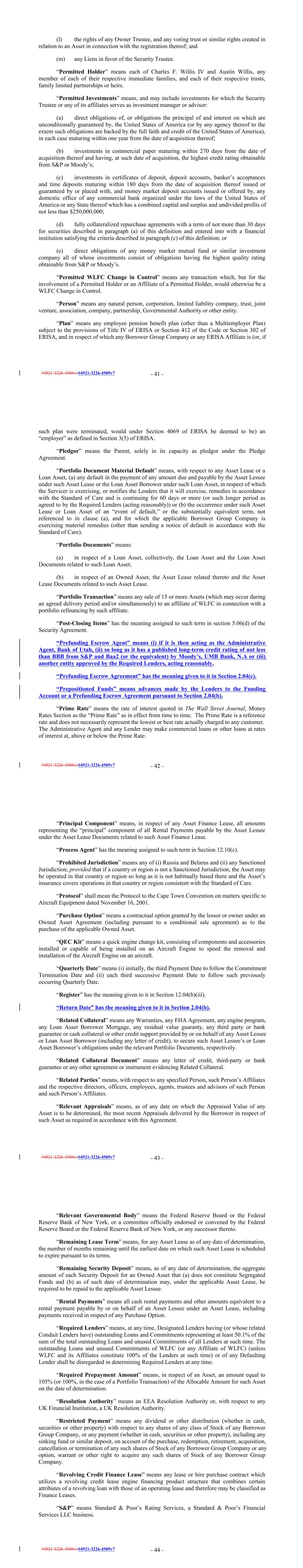 - 41 -#4921-3226-4509v1#4921-3226-4509v7 (l) the rights of any Owner Trustee, and any voting trust or similar rights created in relation to an Asset in connection with the registration thereof; and (m) any Liens in favor of the Security Trustee. “Permitted Holder” means each of Charles F. Willis IV and Austin Willis, any member of each of their respective immediate families, and each of their respective trusts, family limited partnerships or heirs. “Permitted Investments” means, and may include investments for which the Security Trustee or any of its affiliates serves as investment manager or advisor: (a) direct obligations of, or obligations the principal of and interest on which are unconditionally guaranteed by, the United States of America (or by any agency thereof to the extent such obligations are backed by the full faith and credit of the United States of America), in each case maturing within one year from the date of acquisition thereof; (b) investments in commercial paper maturing within 270 days from the date of acquisition thereof and having, at such date of acquisition, the highest credit rating obtainable from S&P or Moody’s; (c) investments in certificates of deposit, deposit accounts, banker’s acceptances and time deposits maturing within 180 days from the date of acquisition thereof issued or guaranteed by or placed with, and money market deposit accounts issued or offered by, any domestic office of any commercial bank organized under the laws of the United States of America or any State thereof which has a combined capital and surplus and undivided profits of not less than $250,000,000; (d) fully collateralized repurchase agreements with a term of not more than 30 days for securities described in paragraph (a) of this definition and entered into with a financial institution satisfying the criteria described in paragraph (c) of this definition; or (e) direct obligations of any money market mutual fund or similar investment company all of whose investments consist of obligations having the highest quality rating obtainable from S&P or Moody’s. “Permitted WLFC Change in Control” means any transaction which, but for the involvement of a Permitted Holder or an Affiliate of a Permitted Holder, would otherwise be a WLFC Change in Control. “Person” means any natural person, corporation, limited liability company, trust, joint venture, association, company, partnership, Governmental Authority or other entity. “Plan” means any employee pension benefit plan (other than a Multiemployer Plan) subject to the provisions of Title IV of ERISA or Section 412 of the Code or Section 302 of ERISA, and in respect of which any Borrower Group Company or any ERISA Affiliate is (or, if - 42 -#4921-3226-4509v1#4921-3226-4509v7 such plan were terminated, would under Section 4069 of ERISA be deemed to be) an “employer” as defined in Section 3(5) of ERISA. “Pledgor” means the Parent, solely in its capacity as pledgor under the Pledge Agreement. “Portfolio Document Material Default” means, with respect to any Asset Lease or a Loan Asset, (a) any default in the payment of any amount due and payable by the Asset Lessee under such Asset Lease or the Loan Asset Borrower under such Loan Asset, in respect of which the Servicer is exercising, or notifies the Lenders that it will exercise, remedies in accordance with the Standard of Care and is continuing for 60 days or more (or such longer period as agreed to by the Required Lenders (acting reasonably)) or (b) the occurrence under such Asset Lease or Loan Asset of an “event of default,” or the substantially equivalent term, not referenced to in clause (a), and for which the applicable Borrower Group Company is exercising material remedies (other than sending a notice of default in accordance with the Standard of Care). “Portfolio Documents” means: (a) in respect of a Loan Asset, collectively, the Loan Asset and the Loan Asset Documents related to such Loan Asset; (b) in respect of an Owned Asset, the Asset Lease related thereto and the Asset Lease Documents related to such Asset Lease. “Portfolio Transaction” means any sale of 15 or more Assets (which may occur during an agreed delivery period and/or simultaneously) to an affiliate of WLFC in connection with a portfolio refinancing by such affiliate. “Post-Closing Items” has the meaning assigned to such term in section 5.06(d) of the Security Agreement. “Prefunding Escrow Agent” means (i) if it is then acting as the Administrative Agent, Bank of Utah, (ii) so long as it has a published long-term credit rating of not less than BBB from S&P and Baa2 (or the equivalent) by Moody’s, UMB Bank, N.A or (iii) another entity approved by the Required Lenders, acting reasonably. “Prefunding Escrow Agreement” has the meaning given to it in Section 2.04(c). “Prepositioned Funds” means advances made by the Lenders to the Funding Account or a Prefunding Escrow Agreement pursuant to Section 2.04(b). “Prime Rate” means the rate of interest quoted in The Wall Street Journal, Money Rates Section as the “Prime Rate” as in effect from time to time. The Prime Rate is a reference rate and does not necessarily represent the lowest or best rate actually charged to any customer. The Administrative Agent and any Lender may make commercial loans or other loans at rates of interest at, above or below the Prime Rate. - 43 -#4921-3226-4509v1#4921-3226-4509v7 “Principal Component” means, in respect of any Asset Finance Lease, all amounts representing the “principal” component of all Rental Payments payable by the Asset Lessee under the Asset Lease Documents related to such Asset Finance Lease. “Process Agent” has the meaning assigned to such term in Section 12.10(c). “Prohibited Jurisdiction” means any of (i) Russia and Belarus and (ii) any Sanctioned Jurisdiction; provided that if a country or region is not a Sanctioned Jurisdiction, the Asset may