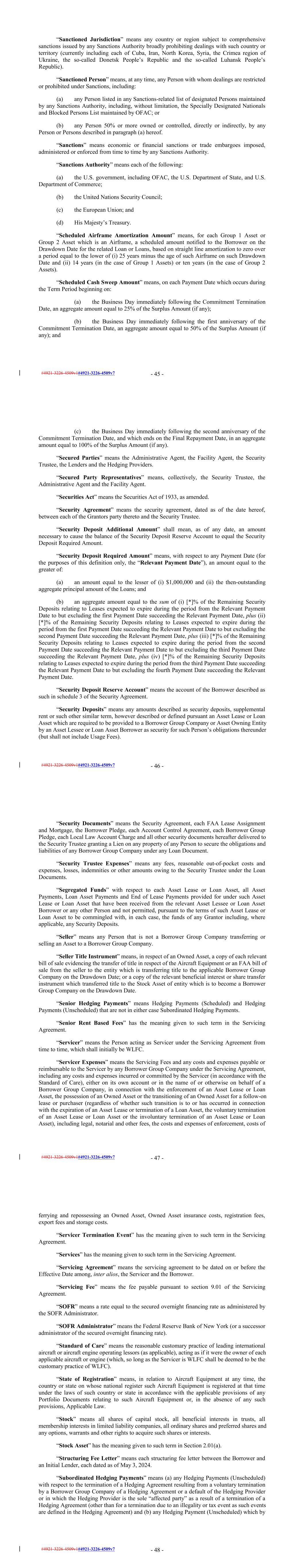 - 45 -#4921-3226-4509v1#4921-3226-4509v7 “Sanctioned Jurisdiction” means any country or region subject to comprehensive sanctions issued by any Sanctions Authority broadly prohibiting dealings with such country or territory (currently including each of Cuba, Iran, North Korea, Syria, the Crimea region of Ukraine, the so-called Donetsk People’s Republic and the so-called Luhansk People’s Republic). “Sanctioned Person” means, at any time, any Person with whom dealings are restricted or prohibited under Sanctions, including: (a) any Person listed in any Sanctions-related list of designated Persons maintained by any Sanctions Authority, including, without limitation, the Specially Designated Nationals and Blocked Persons List maintained by OFAC; or (b) any Person 50% or more owned or controlled, directly or indirectly, by any Person or Persons described in paragraph (a) hereof. “Sanctions” means economic or financial sanctions or trade embargoes imposed, administered or enforced from time to time by any Sanctions Authority. “Sanctions Authority” means each of the following: (a) the U.S. government, including OFAC, the U.S. Department of State, and U.S. Department of Commerce; (b) the United Nations Security Council; (c) the European Union; and (d) His Majesty’s Treasury. “Scheduled Airframe Amortization Amount” means, for each Group 1 Asset or Group 2 Asset which is an Airframe, a scheduled amount notified to the Borrower on the Drawdown Date for the related Loan or Loans, based on straight line amortization to zero over a period equal to the lower of (i) 25 years minus the age of such Airframe on such Drawdown Date and (ii) 14 years (in the case of Group 1 Assets) or ten years (in the case of Group 2 Assets). “Scheduled Cash Sweep Amount” means, on each Payment Date which occurs during the Term Period beginning on: (a) the Business Day immediately following the Commitment Termination Date, an aggregate amount equal to 25% of the Surplus Amount (if any); (b) the Business Day immediately following the first anniversary of the Commitment Termination Date, an aggregate amount equal to 50% of the Surplus Amount (if any); and - 46 -#4921-3226-4509v1#4921-3226-4509v7 (c) the Business Day immediately following the second anniversary of the Commitment Termination Date, and which ends on the Final Repayment Date, in an aggregate amount equal to 100% of the Surplus Amount (if any). “Secured Parties” means the Administrative Agent, the Facility Agent, the Security Trustee, the Lenders and the Hedging Providers. “Secured Party Representatives” means, collectively, the Security Trustee, the Administrative Agent and the Facility Agent. “Securities Act” means the Securities Act of 1933, as amended. “Security Agreement” means the security agreement, dated as of the date hereof, between each of the Grantors party thereto and the Security Trustee. “Security Deposit Additional Amount” shall mean, as of any date, an amount necessary to cause the balance of the Security Deposit Reserve Account to equal the Security Deposit Required Amount. “Security Deposit Required Amount” means, with respect to any Payment Date (for the purposes of this definition only, the “Relevant Payment Date”), an amount equal to the greater of: (a) an amount equal to the lesser of (i) $1,000,000 and (ii) the then-outstanding aggregate principal amount of the Loans; and (b) an aggregate amount equal to the sum of (i) [*]% of the Remaining Security Deposits relating to Leases expected to expire during the period from the Relevant Payment Date to but excluding the first Payment Date succeeding the Relevant Payment Date, plus (ii) [*]% of the Remaining Security Deposits relating to Leases expected to expire during the period from the first Payment Date succeeding the Relevant Payment Date to but excluding the second Payment Date succeeding the Relevant Payment Date, plus (iii) [*]% of the Remaining Security Deposits relating to Leases expected to expire during the period from the second Payment Date succeeding the Relevant Payment Date to but excluding the third Payment Date succeeding the Relevant Payment Date, plus (iv) [*]% of the Remaining Security Deposits relating to Leases expected to expire during the period from the third Payment Date succeeding the Relevant Payment Date to but excluding the fourth Payment Date succeeding the Relevant Payment Date. “Security Deposit Reserve Account” means the account of the Borrower described as such in schedule 3 of the Security Agreement. “Security Deposits” means any amounts described as security deposits, supplemental rent or such other similar term, however described or defined pursuant an Asset Lease or Loan Asset which are required to be provided to a Borrower Group Company or Asset Owning Entity by an Asset Lessee or Loan Asset Borrower as security for such Person’s obligations thereunder (but shall not include Usage Fees). - 47 -#4921-3226-4509v1#4921-3226-4509v7 “Security Documents” means the Security Agreement, each FAA Lease Assignment and Mortgage, the Borrower Pledge, each Account Control Agreement, each Borrower Group Pledge, each Local Law Account Charge and all other security documents hereafter delivered to the Security Trustee granting a Lien on any property of any Person to secure the obligations and liabilities of any Borrower Group Company under any Loan Document. “Security Trustee Expenses” means any fees, reasonable out-of-pocket costs and expenses, losses, indemnities or other amounts owing to the Security Trustee under the Loan Documents. “Segregated Funds” with respect to each Asset Lease or Loan Asset, all Asset Payments, Loan Asset Payments and End of Lease Payments provided for under such Asset Lease or Loan Asset that have been received from the relevant Asset Lessee or Loan Asset Borrower or any other Person and not permitted, pursuant to the terms of such Asset Lease or Loan Asset to be c