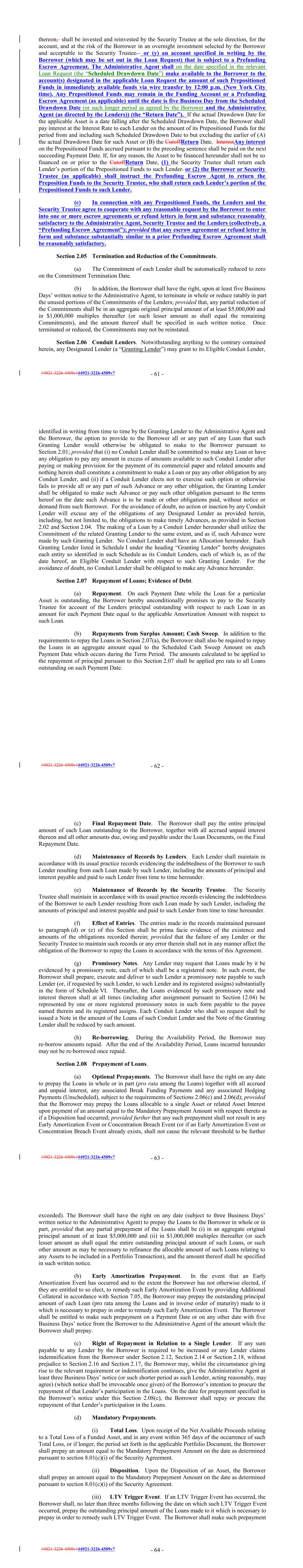 - 61 -#4921-3226-4509v1#4921-3226-4509v7 thereon, shall be invested and reinvested by the Security Trustee at the sole direction, for the account, and at the risk of the Borrower in an overnight investment selected by the Borrower and acceptable to the Security Trustee. or (y) an account specified in writing by the Borrower (which may be set out in the Loan Request) that is subject to a Prefunding Escrow Agreement. The Administrative Agent shall on the date specified in the relevant Loan Request (the “Scheduled Drawdown Date”) make available to the Borrower to the account(s) designated in the applicable Loan Request the amount of such Prepositioned Funds in immediately available funds via wire transfer by 12:00 p.m. (New York City time). Any Prepositioned Funds may remain in the Funding Account or a Prefunding Escrow Agreement (as applicable) until the date is five Business Day from the Scheduled Drawdown Date (or such longer period as agreed by the Borrower and the Administrative Agent (as directed by the Lenders)) (the “Return Date”). If the actual Drawdown Date for the applicable Asset is a date falling after the Scheduled Drawdown Date, the Borrower shall pay interest at the Interest Rate to each Lender on the amount of its Prepositioned Funds for the period from and including such Scheduled Drawdown Date to but excluding the earlier of (A) the actual Drawdown Date for such Asset or (B) the CutoffReturn Date. InterestAny interest on the Prepositioned Funds accrued pursuant to the preceding sentence shall be paid on the next succeeding Payment Date. If, for any reason, the Asset to be financed hereunder shall not be so financed on or prior to the CutoffReturn Date, (1) the Security Trustee shall return each Lender’s portion of the Prepositioned Funds to such Lender. or (2) the Borrower or Security Trustee (as applicable) shall instruct the Prefunding Escrow Agent to return the Preposition Funds to the Security Trustee, who shall return each Lender’s portion of the Prepositioned Funds to such Lender. (c) In connection with any Prepositioned Funds, the Lenders and the Security Trustee agree to cooperate with any reasonable request by the Borrower to enter into one or more escrow agreements or refund letters in form and substance reasonably satisfactory to the Administrative Agent, Security Trustee and the Lenders (collectively, a “Prefunding Escrow Agreement”); provided that any escrow agreement or refund letter in form and substance substantially similar to a prior Prefunding Escrow Agreement shall be reasonably satisfactory. Section 2.05 Termination and Reduction of the Commitments. (a) The Commitment of each Lender shall be automatically reduced to zero on the Commitment Termination Date. (b) In addition, the Borrower shall have the right, upon at least five Business Days’ written notice to the Administrative Agent, to terminate in whole or reduce ratably in part the unused portions of the Commitments of the Lenders; provided that, any partial reduction of the Commitments shall be in an aggregate original principal amount of at least $5,000,000 and in $1,000,000 multiples thereafter (or such lesser amount as shall equal the remaining Commitments), and the amount thereof shall be specified in such written notice. Once terminated or reduced, the Commitments may not be reinstated. Section 2.06 Conduit Lenders. Notwithstanding anything to the contrary contained herein, any Designated Lender (a “Granting Lender”) may grant to its Eligible Conduit Lender, - 62 -#4921-3226-4509v1#4921-3226-4509v7 identified in writing from time to time by the Granting Lender to the Administrative Agent and the Borrower, the option to provide to the Borrower all or any part of any Loan that such Granting Lender would otherwise be obligated to make to the Borrower pursuant to Section 2.01; provided that (i) no Conduit Lender shall be committed to make any Loan or have any obligation to pay any amount in excess of amounts available to such Conduit Lender after paying or making provision for the payment of its commercial paper and related amounts and nothing herein shall constitute a commitment to make a Loan or pay any other obligation by any Conduit Lender, and (ii) if a Conduit Lender elects not to exercise such option or otherwise fails to provide all or any part of such Advance or any other obligation, the Granting Lender shall be obligated to make such Advance or pay such other obligation pursuant to the terms hereof on the date such Advance is to be made or other obligations paid, without notice or demand from such Borrower. For the avoidance of doubt, no action or inaction by any Conduit Lender will excuse any of the obligations of any Designated Lender as provided herein, including, but not limited to, the obligations to make timely Advances, as provided in Section 2.02 and Section 2.04. The making of a Loan by a Conduit Lender hereunder shall utilize the Commitment of the related Granting Lender to the same extent, and as if, such Advance were made by such Granting Lender. No Conduit Lender shall have an Allocation hereunder. Each Granting Lender listed in Schedule I under the heading “Granting Lender” hereby designates each entity so identified in such Schedule as its Conduit Lenders, each of which is, as of the date hereof, an Eligible Conduit Lender with respect to such Granting Lender. For the avoidance of doubt, no Conduit Lender shall be obligated to make any Advance hereunder. Section 2.07 Repayment of Loans; Evidence of Debt. (a) Repayment. On each Payment Date while the Loan for a particular Asset is outstanding, the Borrower hereby unconditionally promises to pay to the Security Trustee for account of the Lenders principal outstanding with respect to each Loan in an amount for each Payment Date equal to the applicable Amortization Amount with respect to such Loan. (b) Repayments from Surplus Amount; Cash Sweep. In addition to the requirements to repay the Loans in S