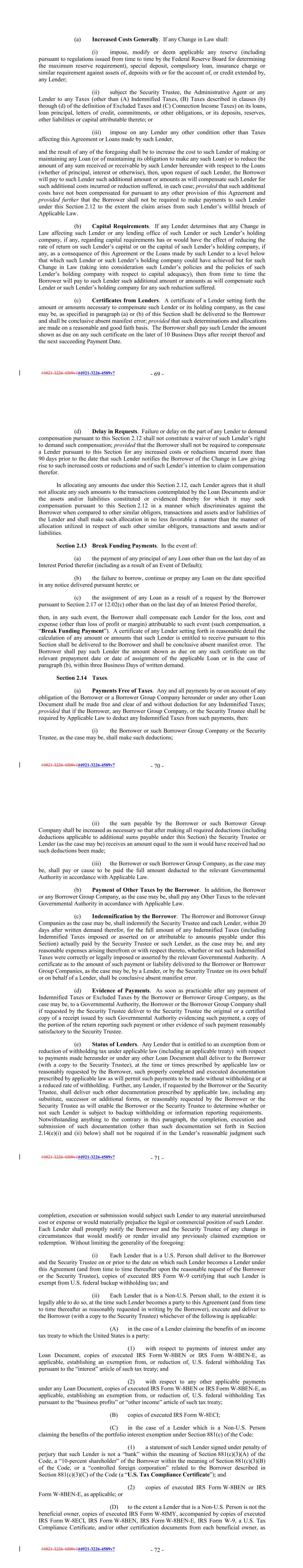 - 69 -#4921-3226-4509v1#4921-3226-4509v7 (a) Increased Costs Generally. If any Change in Law shall: (i) impose, modify or deem applicable any reserve (including pursuant to regulations issued from time to time by the Federal Reserve Board for determining the maximum reserve requirement), special deposit, compulsory loan, insurance charge or similar requirement against assets of, deposits with or for the account of, or credit extended by, any Lender; (ii) subject the Security Trustee, the Administrative Agent or any Lender to any Taxes (other than (A) Indemnified Taxes, (B) Taxes described in clauses (b) through (d) of the definition of Excluded Taxes and (C) Connection Income Taxes) on its loans, loan principal, letters of credit, commitments, or other obligations, or its deposits, reserves, other liabilities or capital attributable thereto; or (iii) impose on any Lender any other condition other than Taxes affecting this Agreement or Loans made by such Lender, and the result of any of the foregoing shall be to increase the cost to such Lender of making or maintaining any Loan (or of maintaining its obligation to make any such Loan) or to reduce the amount of any sum received or receivable by such Lender hereunder with respect to the Loans (whether of principal, interest or otherwise), then, upon request of such Lender, the Borrower will pay to such Lender such additional amount or amounts as will compensate such Lender for such additional costs incurred or reduction suffered, in each case; provided that such additional costs have not been compensated for pursuant to any other provision of this Agreement and provided further that the Borrower shall not be required to make payments to such Lender under this Section 2.12 to the extent the claim arises from such Lender’s willful breach of Applicable Law. (b) Capital Requirements. If any Lender determines that any Change in Law affecting such Lender or any lending office of such Lender or such Lender’s holding company, if any, regarding capital requirements has or would have the effect of reducing the rate of return on such Lender’s capital or on the capital of such Lender’s holding company, if any, as a consequence of this Agreement or the Loans made by such Lender to a level below that which such Lender or such Lender’s holding company could have achieved but for such Change in Law (taking into consideration such Lender’s policies and the policies of such Lender’s holding company with respect to capital adequacy), then from time to time the Borrower will pay to such Lender such additional amount or amounts as will compensate such Lender or such Lender’s holding company for any such reduction suffered. (c) Certificates from Lenders. A certificate of a Lender setting forth the amount or amounts necessary to compensate such Lender or its holding company, as the case may be, as specified in paragraph (a) or (b) of this Section shall be delivered to the Borrower and shall be conclusive absent manifest error; provided that such determinations and allocations are made on a reasonable and good faith basis. The Borrower shall pay such Lender the amount shown as due on any such certificate on the later of 10 Business Days after receipt thereof and the next succeeding Payment Date. - 70 -#4921-3226-4509v1#4921-3226-4509v7 (d) Delay in Requests. Failure or delay on the part of any Lender to demand compensation pursuant to this Section 2.12 shall not constitute a waiver of such Lender’s right to demand such compensation; provided that the Borrower shall not be required to compensate a Lender pursuant to this Section for any increased costs or reductions incurred more than 90 days prior to the date that such Lender notifies the Borrower of the Change in Law giving rise to such increased costs or reductions and of such Lender’s intention to claim compensation therefor. In allocating any amounts due under this Section 2.12, each Lender agrees that it shall not allocate any such amounts to the transactions contemplated by the Loan Documents and/or the assets and/or liabilities constituted or evidenced thereby for which it may seek compensation pursuant to this Section 2.12 in a manner which discriminates against the Borrower when compared to other similar obligors, transactions and assets and/or liabilities of the Lender and shall make such allocation in no less favorable a manner than the manner of allocation utilized in respect of such other similar obligors, transactions and assets and/or liabilities. Section 2.13 Break Funding Payments. In the event of: (a) the payment of any principal of any Loan other than on the last day of an Interest Period therefor (including as a result of an Event of Default); (b) the failure to borrow, continue or prepay any Loan on the date specified in any notice delivered pursuant hereto; or (c) the assignment of any Loan as a result of a request by the Borrower pursuant to Section 2.17 or 12.02(c) other than on the last day of an Interest Period therefor, then, in any such event, the Borrower shall compensate each Lender for the loss, cost and expense (other than loss of profit or margin) attributable to such event (such compensation, a “Break Funding Payment”). A certificate of any Lender setting forth in reasonable detail the calculation of any amount or amounts that such Lender is entitled to receive pursuant to this Section shall be delivered to the Borrower and shall be conclusive absent manifest error. The Borrower shall pay such Lender the amount shown as due on any such certificate on the relevant prepayment date or date of assignment of the applicable Loan or in the case of paragraph (b), within three Business Days of written demand. Section 2.14 Taxes. (a) Payments Free of Taxes. Any and all payments by or on account of any obligation of the Borrower or a Borrower Group Company hereunder or under any other Loan Document shall be made free and clear of and without deduction for any Indemnif